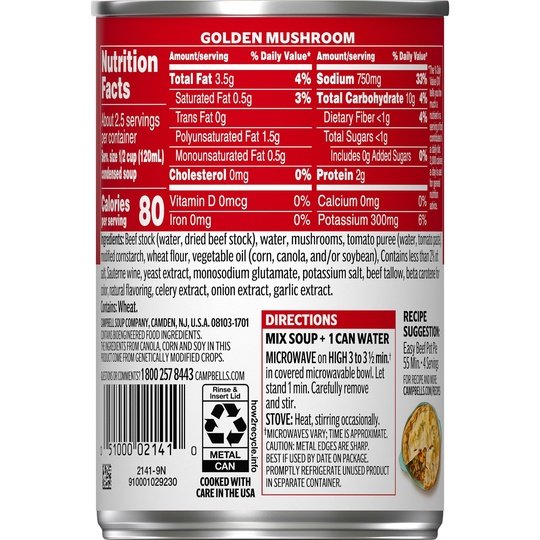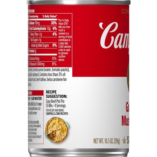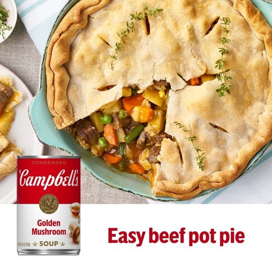 Campbell’s Condensed Golden Mushroom Soup is just the beginning of any great recipe. Join Campbell’s in cooking in the kitchen with our Golden Mushroom Soup. Customize and create with this Golden Mushroom Soup, which starts with tender mushrooms, beef stock, and tomato puree for a smooth flavor in any great meal. Try it as the start of your next weeknight meal, like the crowd-pleasing easy beef pot pie. Campbell’s Golden Mushroom Soup is food you can feel good about - let’s get ready to create. M’m! M’m! Good! This product is packaged in a metal can, and is shelf-stable/ambient.