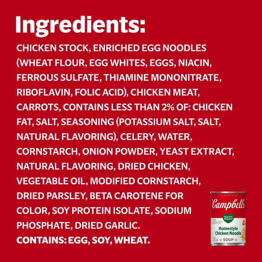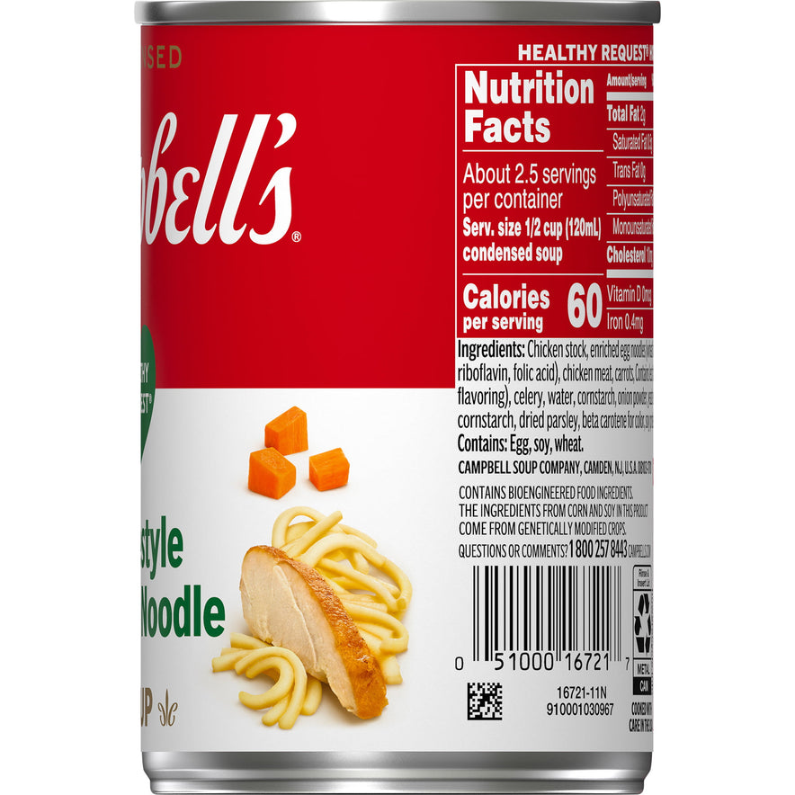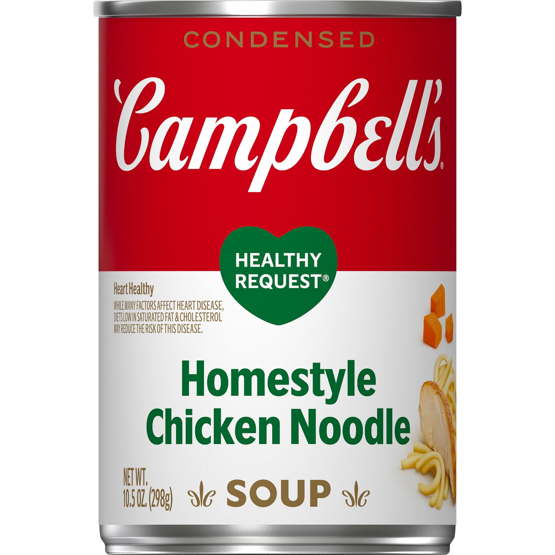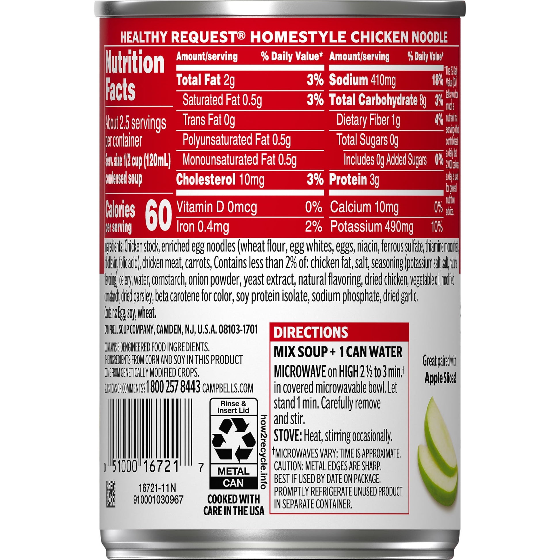 Campbell’s Condensed Healthy Request Homestyle Chicken Noodle Soup is a family favorite. Customize with fresh herbs, or pair it with your favorites. This heart healthy* soup starts with broth, egg noodles, tender chicken raised without antibiotics, and a mix of vegetables like celery and carrots. The end result is a soup that brings a smile with every spoonful. Plus, it has 50% less sodium**! Campbell’s Condensed Healthy Request Homestyle Chicken Noodle Soup warms you up while delivering feel good comfort. M’m! M’m! Good! *While many factors affect heart disease, diets low in fat & cholesterol may reduce this risk of this disease. **410mg sodium per serving vs. 890mg in our regular homestyle chicken noodle This product is packaged in a metal can, and is shelf-stable/ambient.