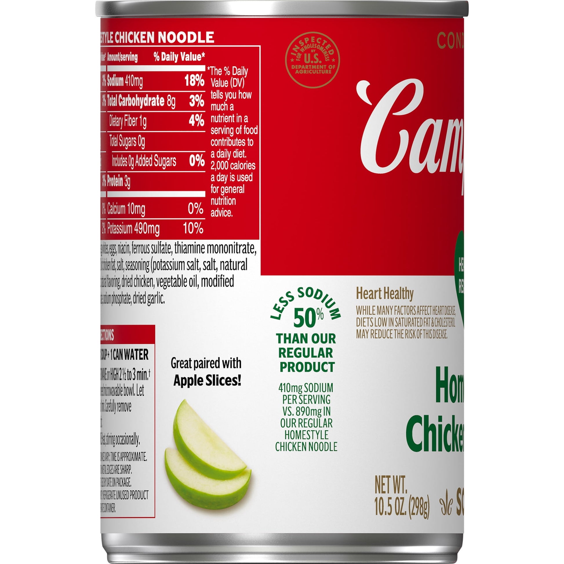 50% LESS SODIUM** SOUP: This canned soup has 50% less sodium than our regular homestyle chicken noodle. **410mg sodium per serving vs. 890mg in our regular homestyle chicken noodle