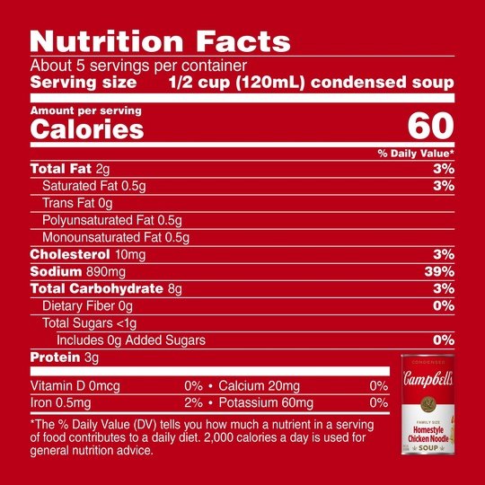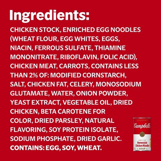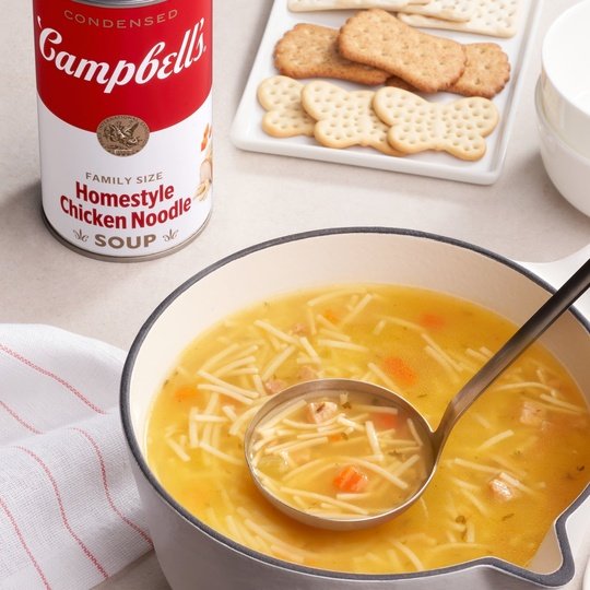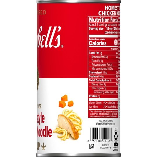 Campbell’s Condensed Homestyle Chicken Noodle Soup is a family favorite. Customize with fresh herbs, or pair it with your favorites. We perfectly season our chicken broth and add in egg noodles, tender chicken raised without antibiotics, and a mix of vegetables like celery and carrots. The end result is a soul-warming chicken noodle soup that brings a smile with every spoonful. Campbell’s Condensed Homestyle Chicken Noodle Soup warms you up while delivering feel good comfort. Made with high-quality ingredients, this canned soup is a perfect start to a great meal. M’m! M’m! Good! This product is packaged in a metal can, and is shelf-stable/ambient.