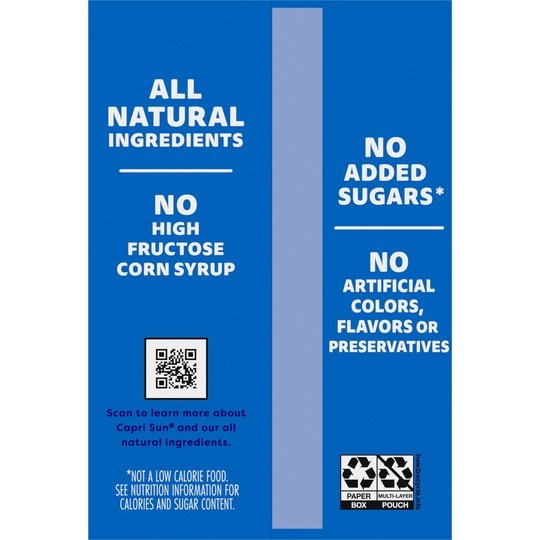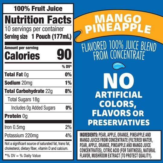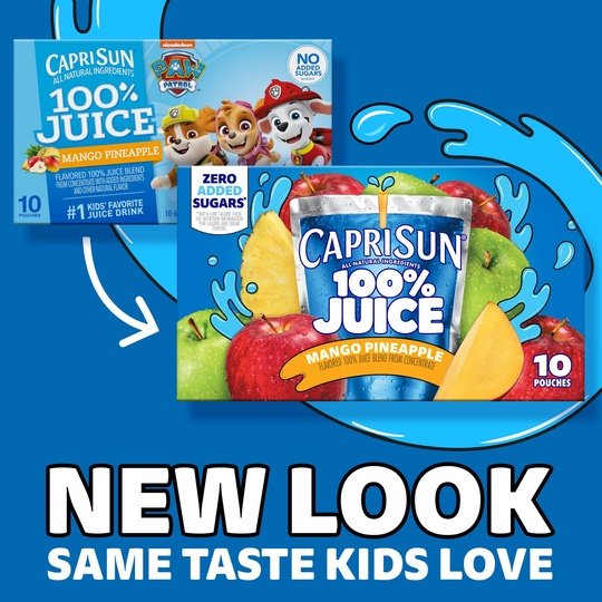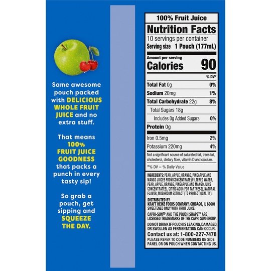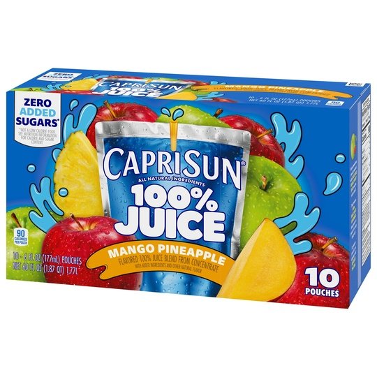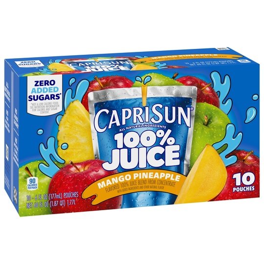 Splash into adventure! Capri Sun Mango Pineapple Flavored 100% Juice Blend from Concentrate with Added Ingredients and Other Natural Flavor delivers refreshing hydration with all-natural ingredients to fuel your fun all day long. Capri Sun 100% Juice is made with no added sugar, only sugar that comes naturally from fruit juices. Each pouch contains 3/4 cup of fruit juice. Our all-natural whole fruit juice is free from artificial colors, flavors and preservatives. Packaged in individual pouches for convenience, Capri Sun juice is perfect for school lunches and on-the-go activities. Stock up with our 10 ct pack of Capri Sun, the #1 kids' favorite juice drink. If you enjoy Capri Sun 100% Juice, be sure to explore all of our varieties. There are so many ways to squeeze the day.