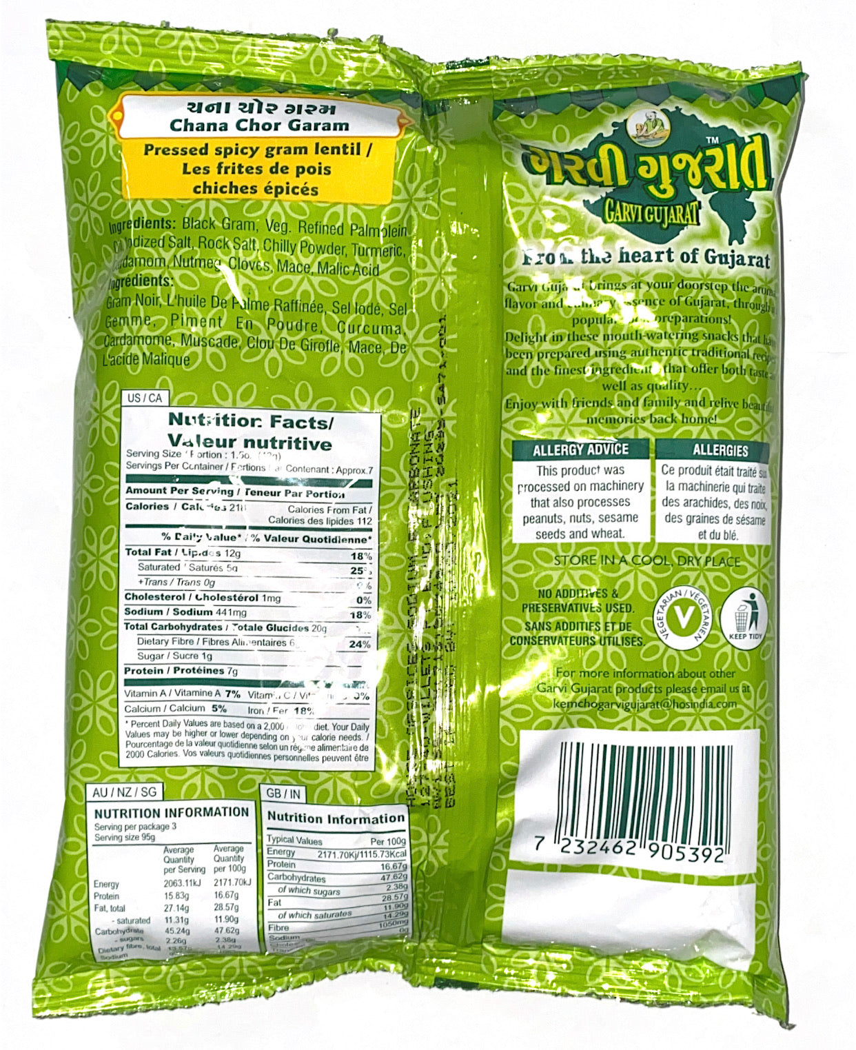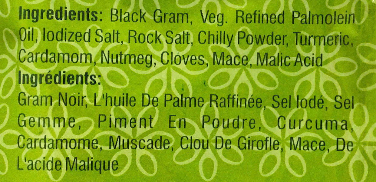 These are cooked chick-peas that have been flattened, fried, and seasoned with spices. Ingredients: black gram, vegetable refined palmolein oil, lodized salt, rock salt, chilli powder, turmeric, cardamom, nutmeg, cloves, mace, malic acid.