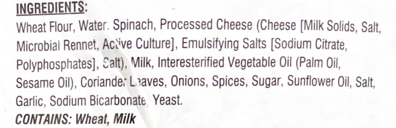 Wheat flour, Water, Spinach, Processed cheese, Emulsifying salts, Milk, Vegetable oil, Coriander leaves, Onion, Spices, Sugar, Sunflower oil, Salt, Garlic, Sodium bicarbonate, Yeast.