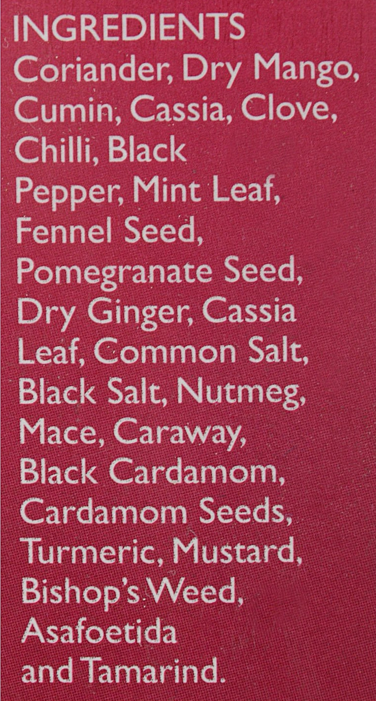 Asafetida, Bishops Weed, Black Cardamom, Black Pepper, Black Salt, Cardamom, Cassia, Cassia Leaf, Chili, Cloves, Cardamom Seeds, Coriander, Cumin, Dry Ginger, Dry Mango, Fennel, Kachri, Mace, Mint Leaf, Mustard, Nutmeg, Pomegranate Seeds, Common Salt, Tamarind, Turmeric.