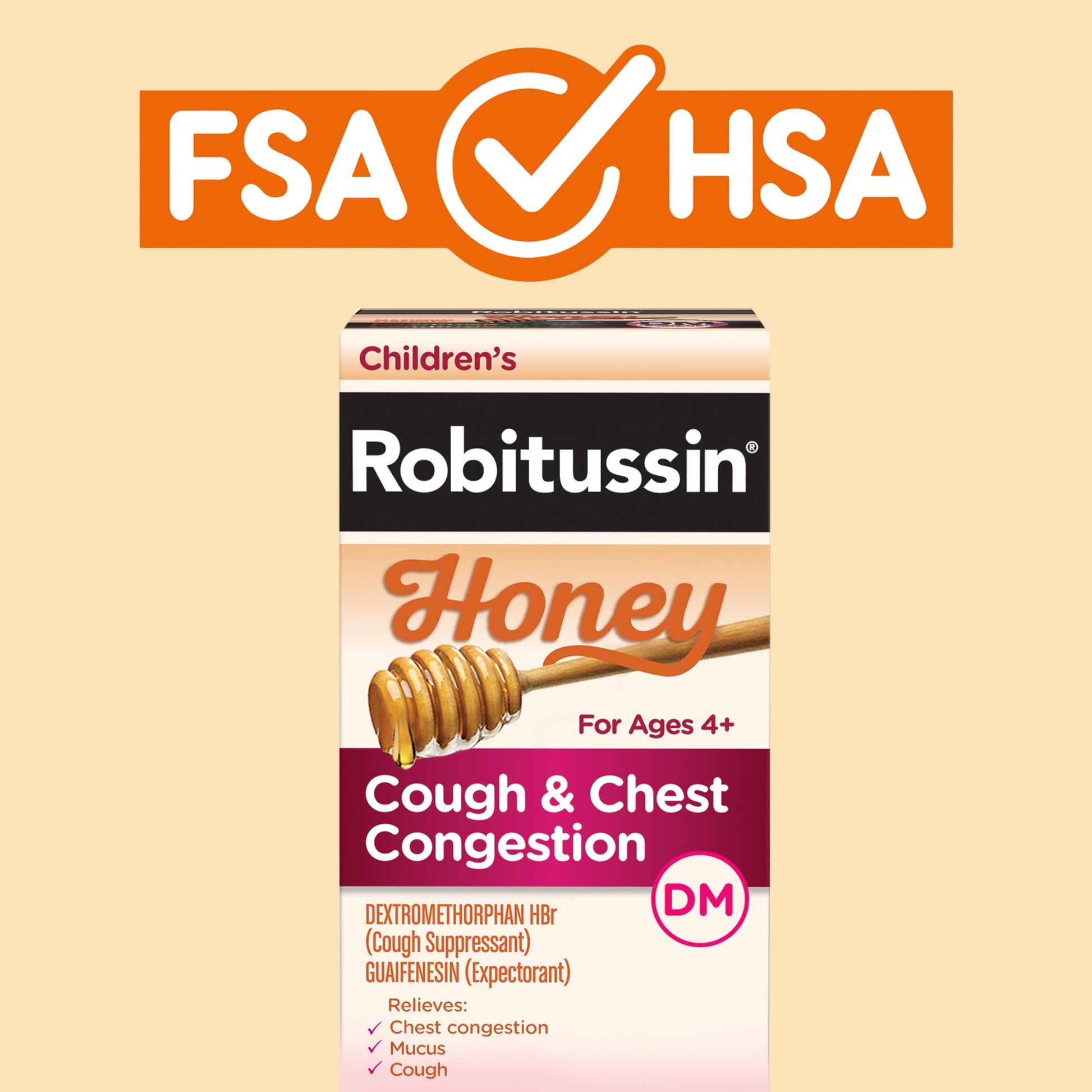 Children's Robitussin Honey Cough & Chest Congestion DM is a gluten free children's cough medicine that combines real honey flavor plus the effective cold and cough symptom relief you trust in Robitussin. This non-drowsy liquid expectorant and cough medicine for kids is an expectorant and a cough suppressant that soothes your child's throat on contact, and provides relief from mucus and chest congestion for cough relief. Robitussin Honey cough syrup has a tasty flavor and comes with a convenient dosing cup that makes it easy to take. For cough and chest congestion relief, give 5 mL to children 4 to under 6 years, 10 mL to children between ages 6 and under 12 and 20 mL to children 12 years and over every four hours while symptoms persist. Delivering cough relief for more than 70 years, Robitussin has the product you need to treat your specific cough, cold, sore throat or flu symptoms for day and night relief. Robitussin shuts coughs down.
