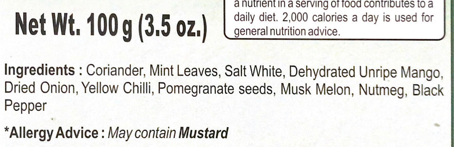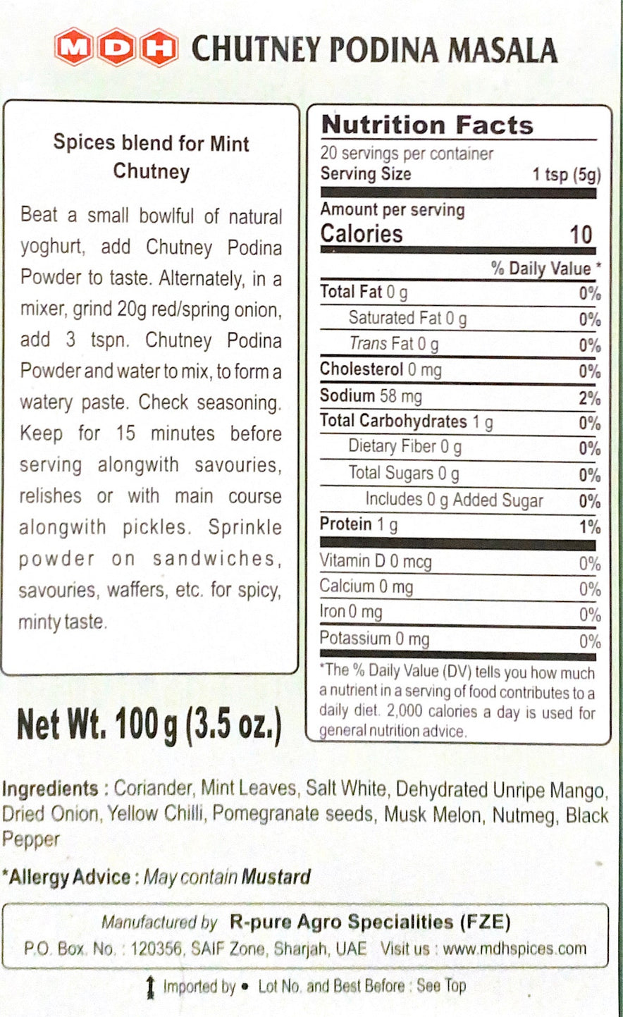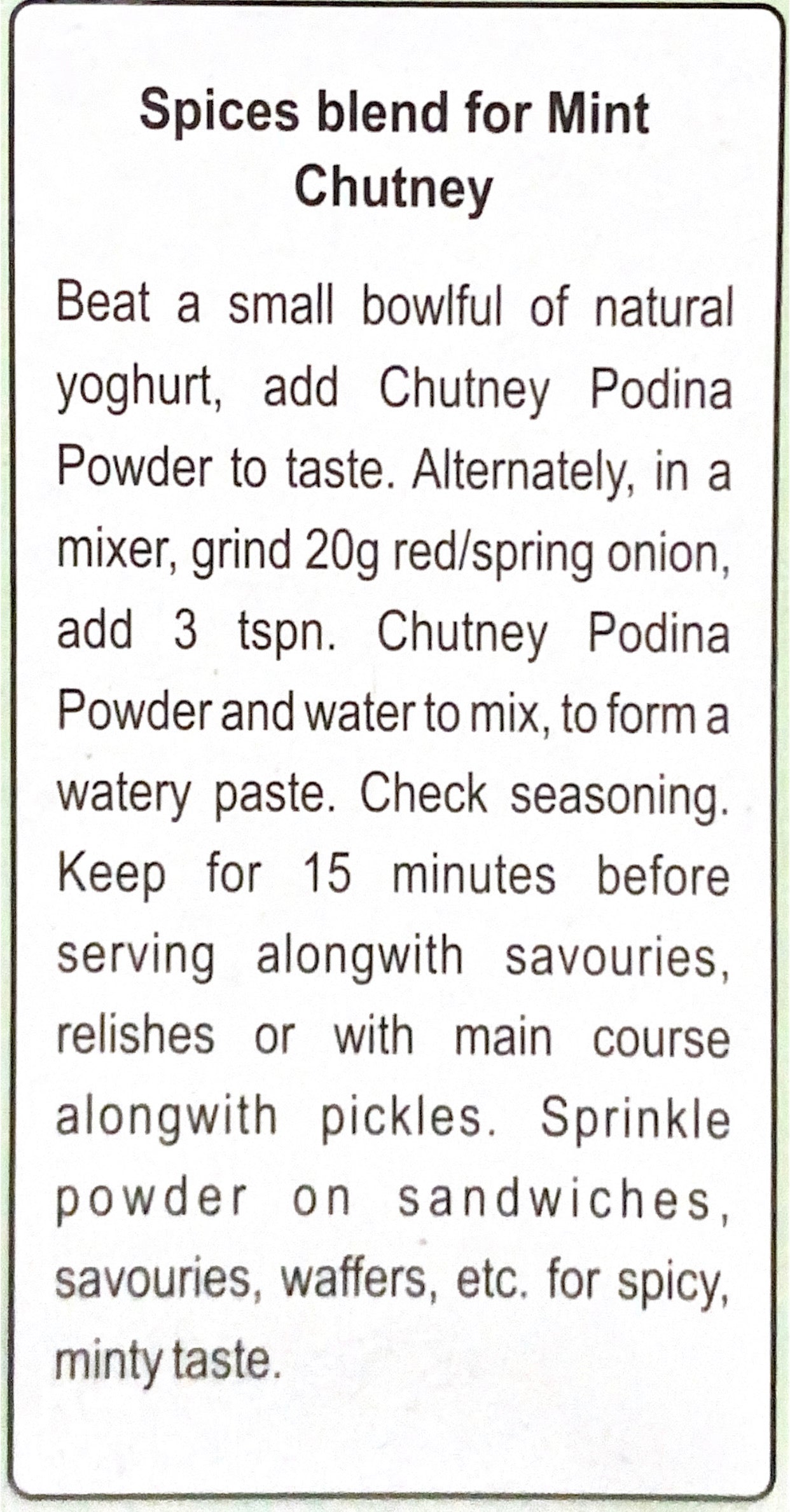 Mint Chutney is made up of fresh Mint leaves or Pudina, which are blended with ginger, garlic and other spices to create a spicy hot but refreshing cool aromatic chutney.;This hot and spicy Mint chutney will add a surprising refreshing taste to any dish, whether it is Indian food or Italian pasta.;Traditionally, Mint Chutney is made at home fresh across Indian sub-continent using fresh Mint leaves together with onion, garlic and ginger. The same freshness has been maintained with this ready-to-eat Mint Chutney.
