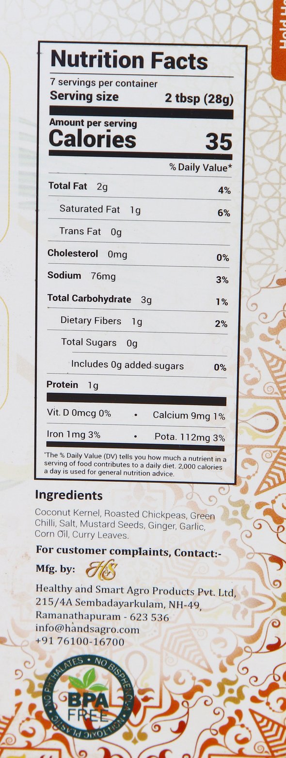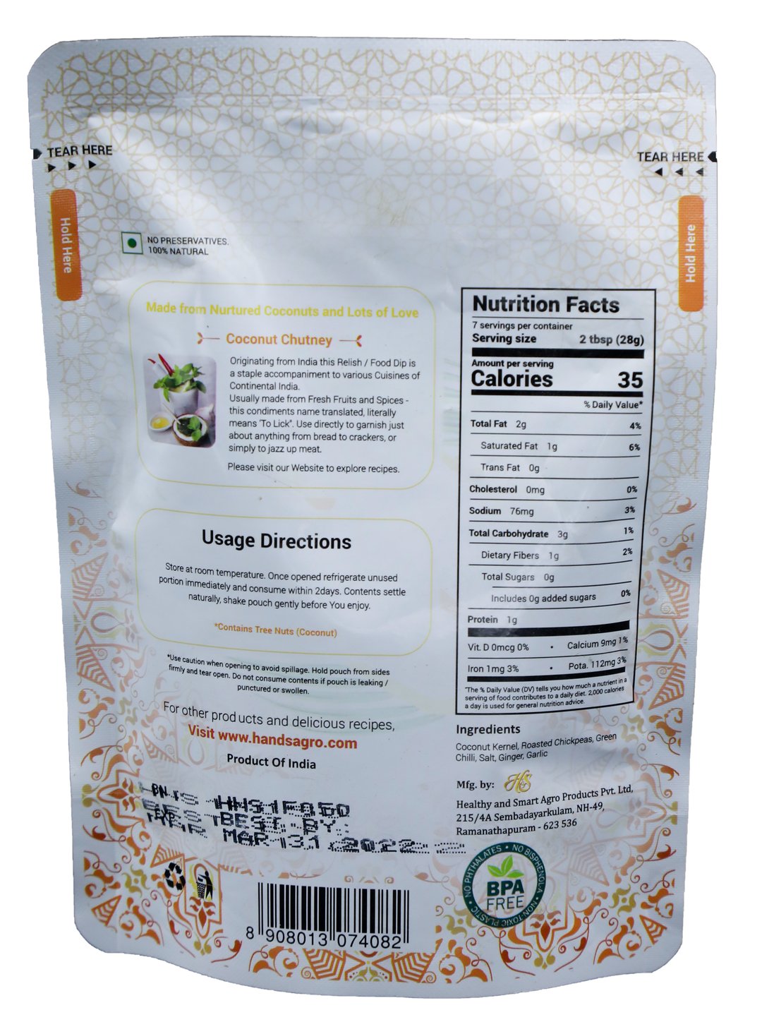 HandS Coconut Chutney ‘Original White’ (Just Open & Serve) – is a 100% All Natural Product - completely free of any form of Chemicals / Preservatives or Artificial Coloring. Our Coconut Chutney made only from the finest of ingredients – is a true ‘Ready to Eat’ product, without the need for any further preparation OR addition of water! Traditionally a Relish/Dip to compliment Idly, Dosa, Vada, Papadam, crackers & Vada Pav (The true Indian Burger), we have spared no effort to bring to your table this Chutney - wholesome, nutritional & un-altered - just as every Mother would intend her family to have!