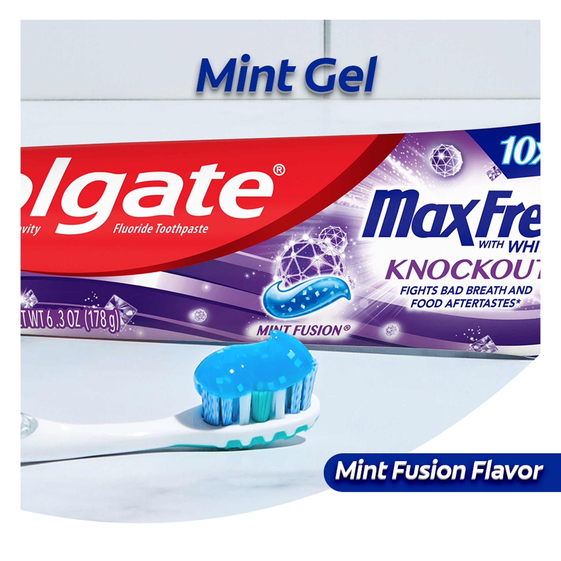 Colgate Max Fresh Knockout with Whitening Toothpaste has 10X longer lasting cool*, so you can breathe confidently. This breath freshening toothpaste is uniquely formulated with odor neutralizing technology that helps destroy nasty odors and fight lingering food aftertastes.** Colgate Max Fresh Knockout mint toothpaste has a Mint Fusion flavor and is packed with hundreds of mini breath strips and keeps your breath fresh for hours. Plus, this fluoride toothpaste fights cavities and whitens teeth leaving you with a confident smile.