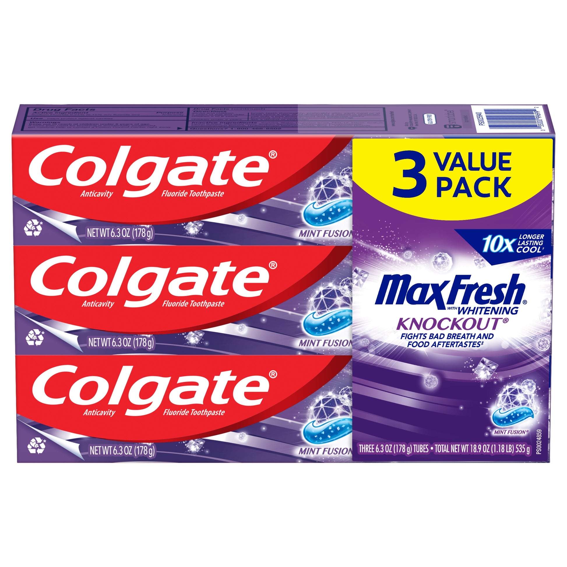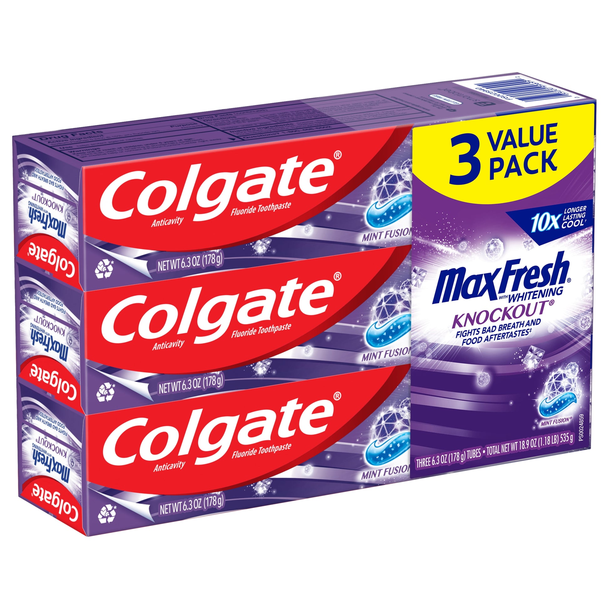 Easily stock multiple bathrooms with this convenient toothpaste value pack. Colgate MaxFresh has a new larger size (6.3 oz vs. 6 oz) and a powerful rush of freshness for long-lasting fresh breath. For good oral hygiene, brush your teeth twice a day for two minutes. You can smile confidently when you use Colgate Max Fresh toothpaste. Leave your mouth feeling fresh for hours with Colgate Max Fresh Knockout Toothpaste. Keep your cool with fresh breath toothpastes that give you the confidence to connect.