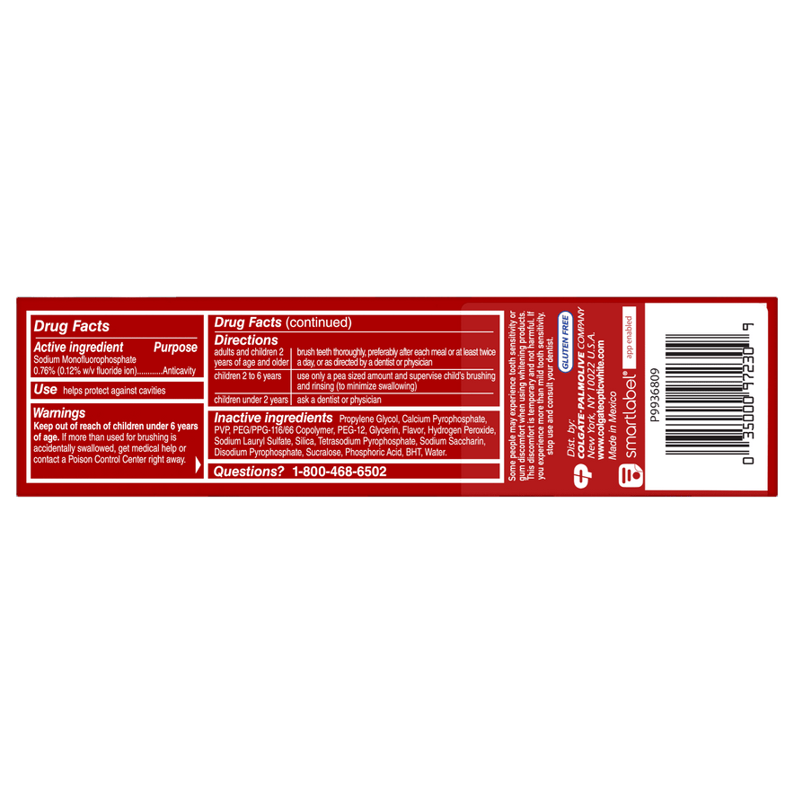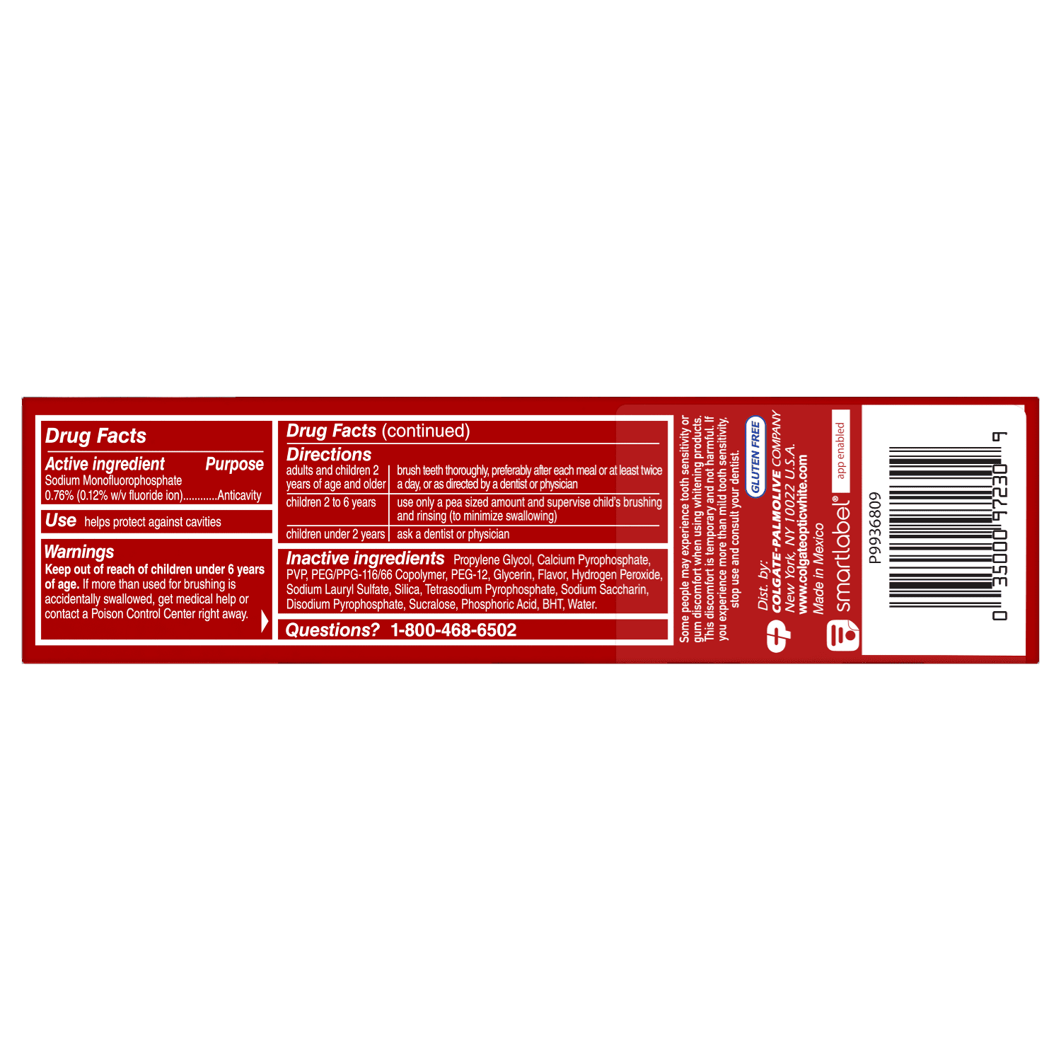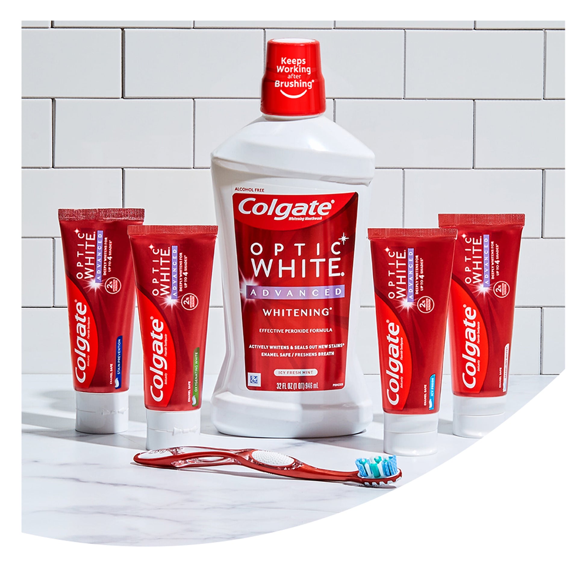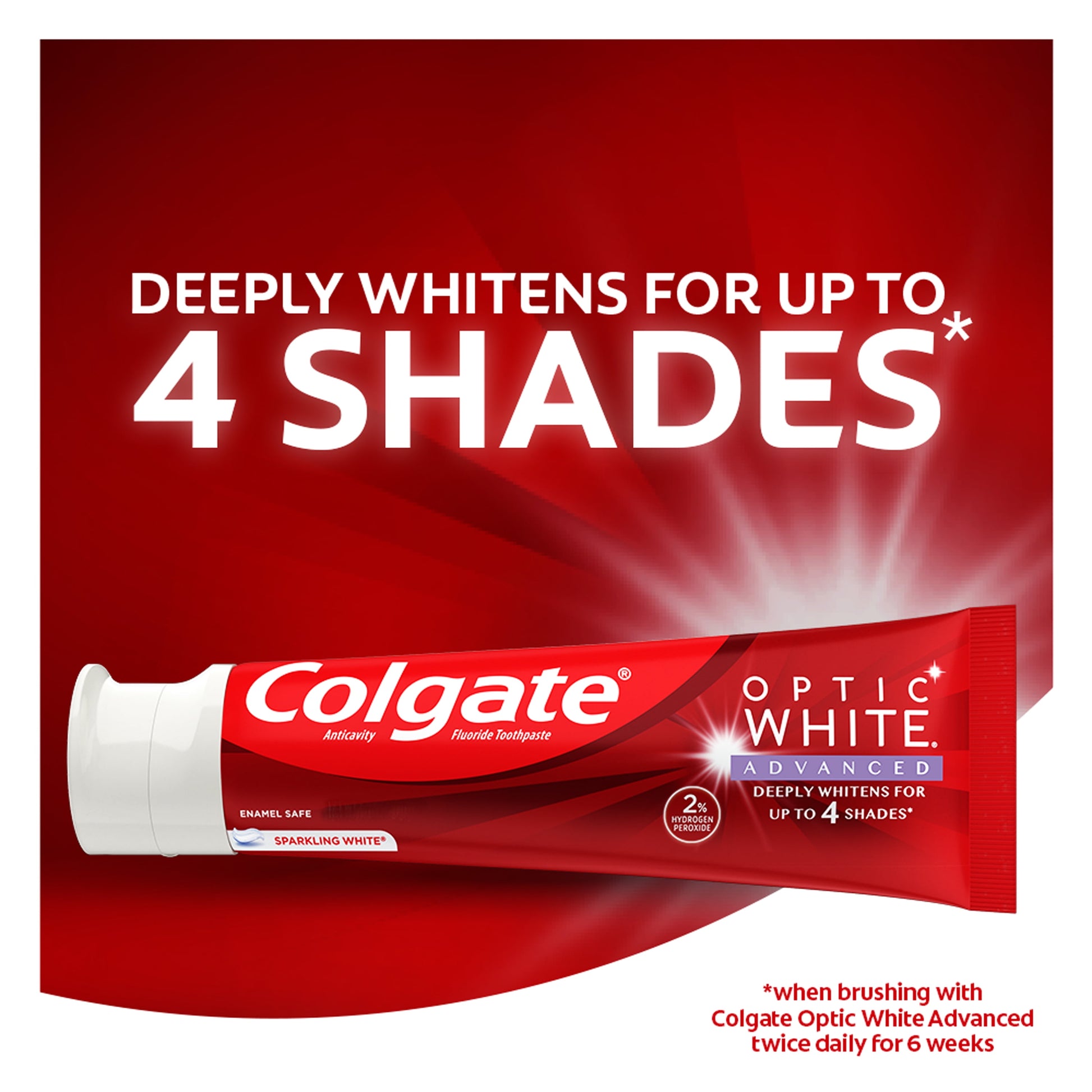 Colgate Optic White Advanced Hydrogen Peroxide Toothpaste, Sparkling White, 3 Pack, 3.2 oz. Remove 5 years of stains* using the Colgate Optic White Advanced Hydrogen Peroxide Teeth Whitening Toothpaste. Use this hydrogen peroxide toothpaste pack with a 2% hydrogen peroxide-based formula to whiten beyond surface stains. Made with a cool Sparkling White flavor, Colgate Optic White Advanced Whitening Toothpaste effectively removes tea, coffee, and wine stains** so you can achieve a bright smile. Whitening That Works Colgate Optic White Advanced Hydrogen Peroxide Toothpaste is a patented whitening toothpaste with 2% hydrogen peroxide that removes surface stains and is enamel-safe. This teeth whitening toothpaste for adults is also an anticavity fluoride toothpaste to help prevent cavities. For whitening that works, choose the Colgate Optic White Advanced Hydrogen Peroxide Toothpaste Pack. Gluten Free and Enamel-Safe Go beyond surface stains with the Colgate Optic White Advanced Toothpaste. Colgate Optic White Hydrogen Peroxide Toothpaste is a gluten free mint toothpaste with a patented 2% hydrogen peroxide formula that is enamel-safe. Unlock a radiant smile with the Colgate Optic White Advanced Sparkling White Hydrogen Peroxide Toothpaste Pack.*when brushing twice daily for 2 weeks**as shown in a laboratory study