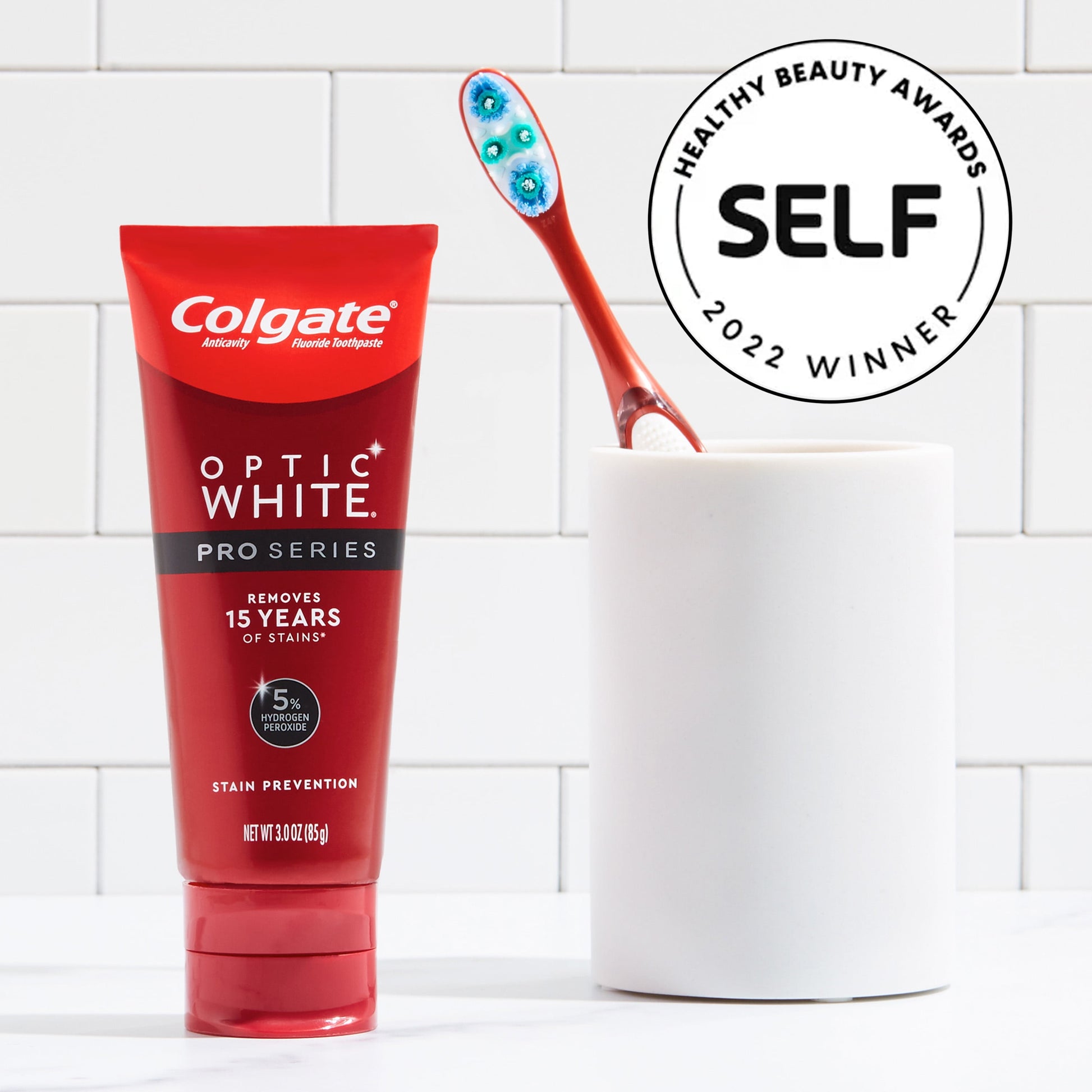 Colgate Optic White Pro Series Stain Prevention Whitening Toothpaste, 3 oz Tube Colgate Optic White Pro Series toothpaste, Stain Prevention, is a mint toothpaste that has a cool wintergreen and spicy mint flavor that helps keep your breath fresh. It is also an anticavity fluoride toothpaste that helps to protect against cavities. Enamel-safe for daily use, add this Colgate whitening toothpaste to your oral care routine for teeth whitening that safely whitens the inside as well as the outside of your teeth. With Colgate’s Patented 5% Hydrogen Peroxide Formula Colgate Optic White Pro Series is an expert level whitening toothpaste for a vibrant glow. With Colgate’s patented 5% hydrogen peroxide formula (our highest level in an over-the-counter whitening toothpaste), this teeth whitening toothpaste is whitening that works. Remove 15 years of stains* with this stain removal toothpaste, which fights stains. Stain Removal Toothpaste That's Vegan Colgate Optic White Pro Series whitening and stain removal toothpaste is a vegan toothpaste that’s also gluten-free and sugar-free. For good oral hygiene, brush your teeth twice a day for two minutes. Optic White toothpaste is made by Colgate, the brand that knows the power of a healthy smile. *when brushing twice daily for 2 weeks