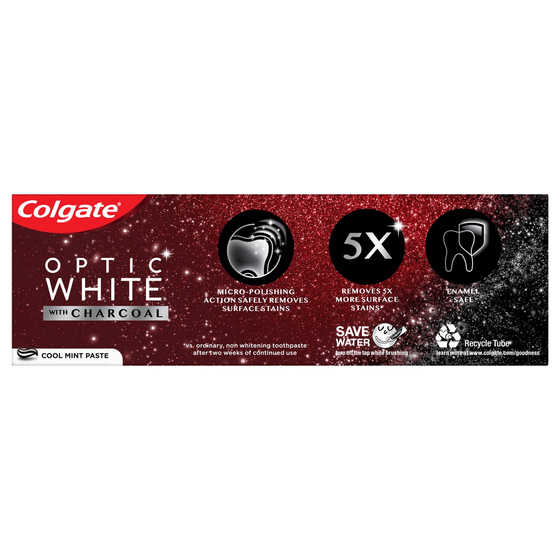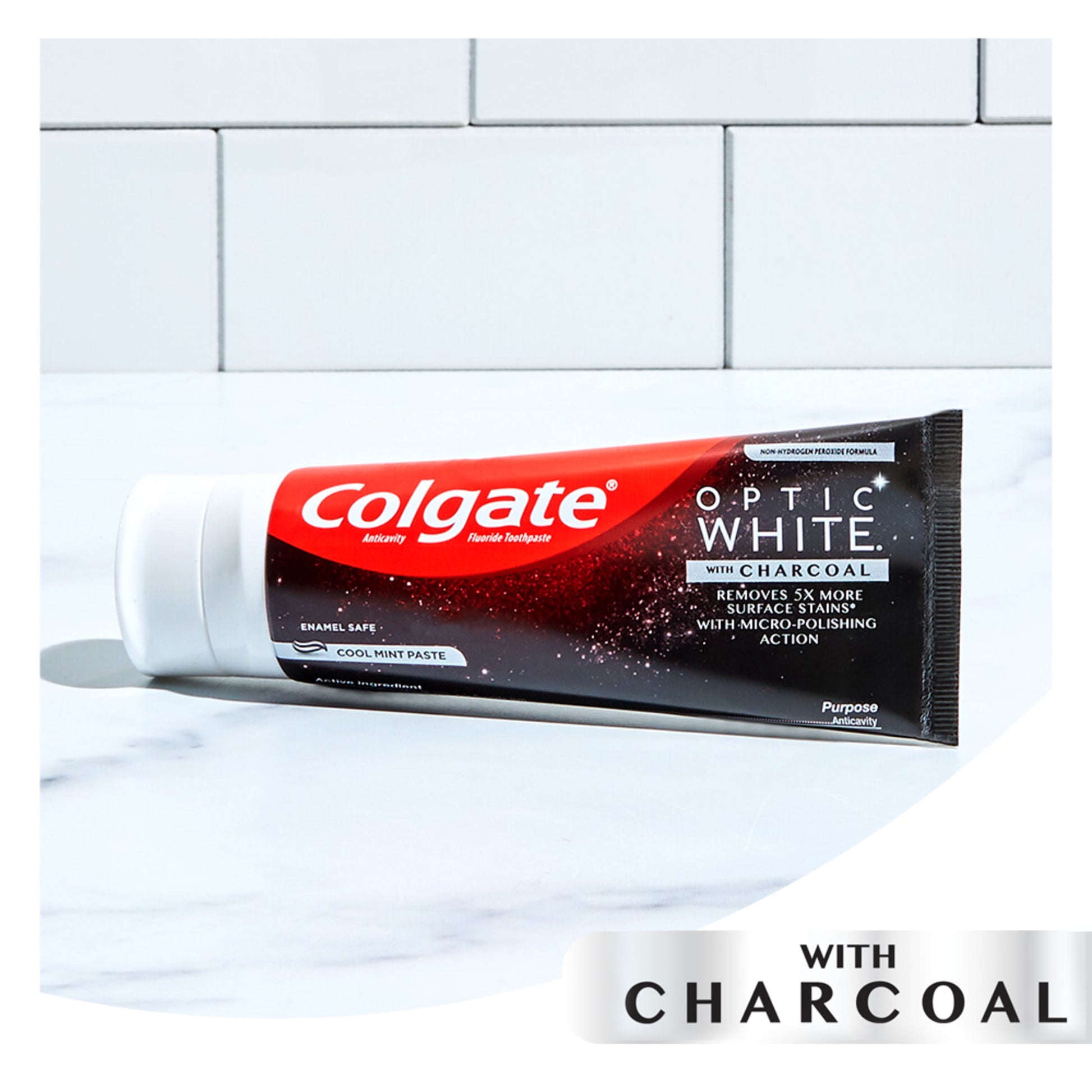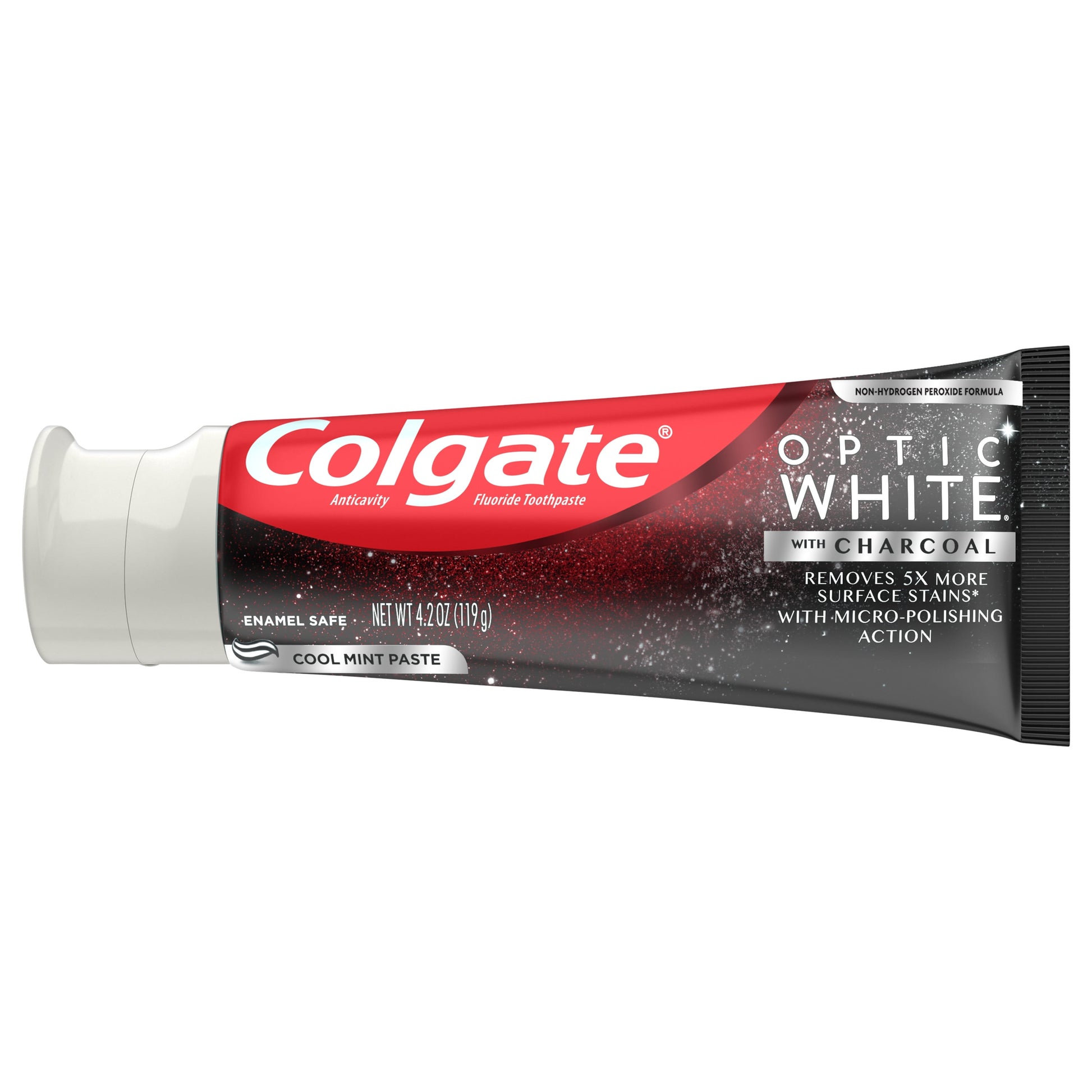 Colgate Optic White Whitening Toothpaste with Charcoal, Cool Mint Paste, 4.2 ozHelp remove everyday surface stains with the Colgate Optic White Whitening Toothpaste with Charcoal. This whitening toothpaste with charcoal removes 95% of daily surface stains* for a brighter smile. Get ready to reveal a smile that’s ready to shine with the Colgate Optic White Whitening Toothpaste with Charcoal.Patented Teeth Whitening Formula with Minty FreshnessThe Colgate Optic White Whitening Toothpaste with Charcoal uses a patented whitening formula to remove 95% of daily surface stains*. Using micro-polishing actions, this whitening stain removal toothpaste removes 5X more surface stains.** Plus, this gray toothpaste comes in a refreshing Cool Mint toothpaste flavor so you can enjoy minty freshness every time you brush.Enamel-Safe Whitening That WorksColgate Optic White Toothpaste with Charcoal is a sugar free and vegan toothpaste that is enamel-safe for daily use. This teeth whitening toothpaste is also an anticavity fluoride toothpaste to help prevent cavities. For whitening that works, choose the Colgate Optic White with Charcoal Toothpaste.*after 2 weeks of twice daily use**vs. ordinary, non whitening toothpaste after 2 weeks of continued use