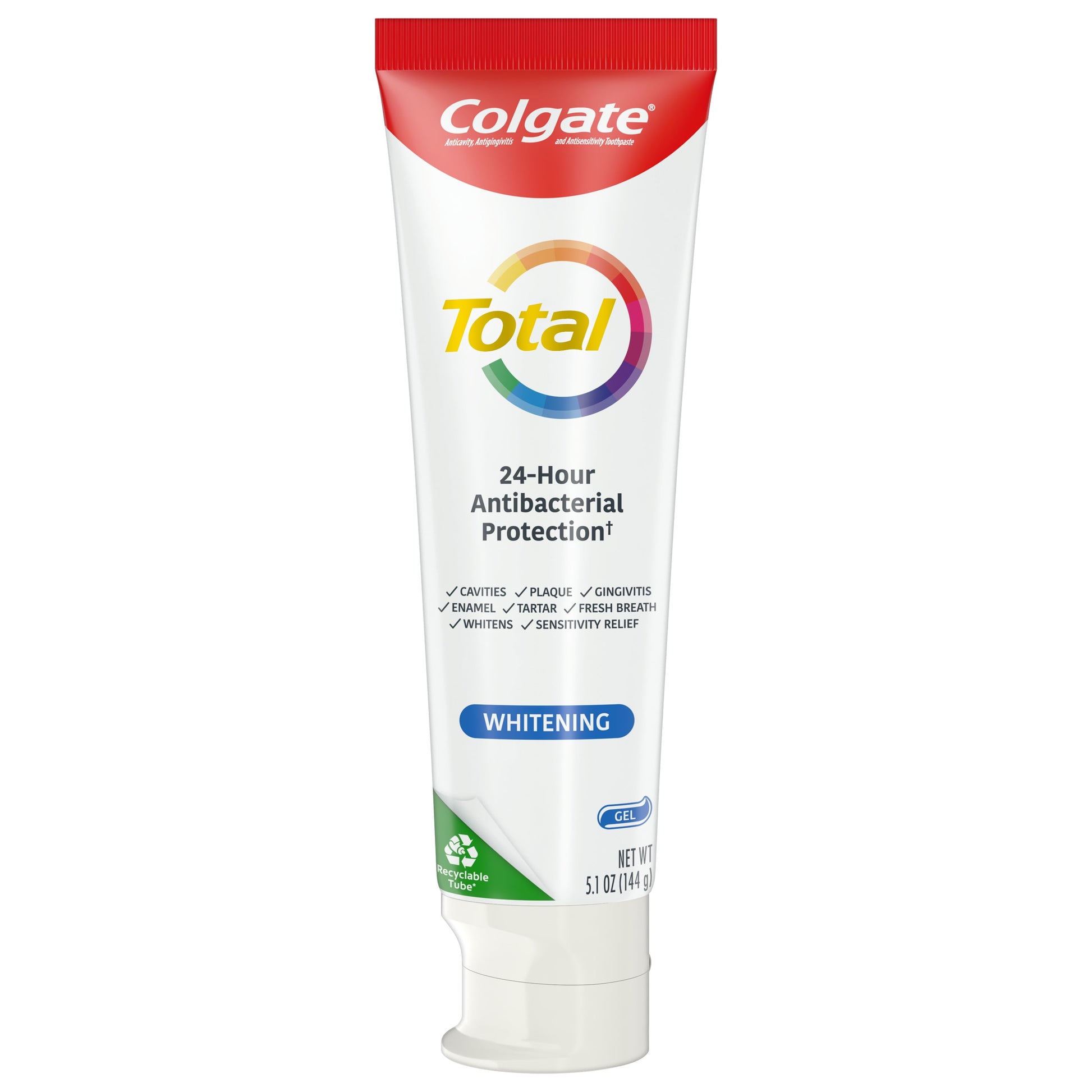 Get 10 benefits and no trade-offs with Colgate Total Teeth Whitening Toothpaste Gel. This multi-benefit Colgate Total toothpaste provides 42%* more sensitivity relief than a regular fluoride toothpaste while removing and preventing surface stains. This mint toothpaste leaves your mouth feeling fresh after every brush. Remove surface stains by brushing twice daily with this tooth whitening toothpaste. Plus, this sugar-free and gluten-free whitening toothpaste not only helps remove stains for whiter teeth, but also keeps your whole mouth healthy by fighting bacteria on teeth, tongue, cheeks, and gums for 12 hours.**