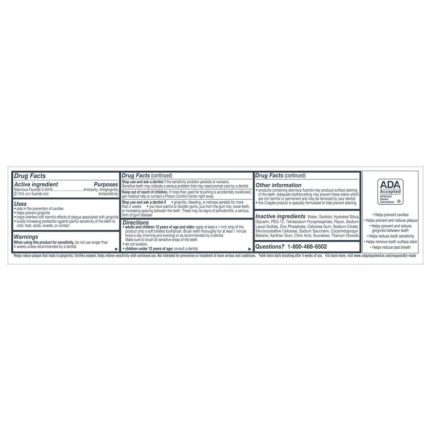 Get 10 benefits and no trade-offs with Colgate Total Teeth Whitening Toothpaste. This multi-benefit Colgate Total toothpaste provides 42%* more sensitivity relief than a regular fluoride toothpaste while removing and preventing surface stains. This mint toothpaste leaves your mouth feeling fresh after every brush. Remove surface stains by brushing twice daily with this tooth whitening toothpaste. Plus, this sugar-free and gluten-free whitening toothpaste not only helps remove stains for whiter teeth, but also keeps your whole mouth healthy by fighting bacteria on teeth, tongue, cheeks, and gums for 12 hours.**