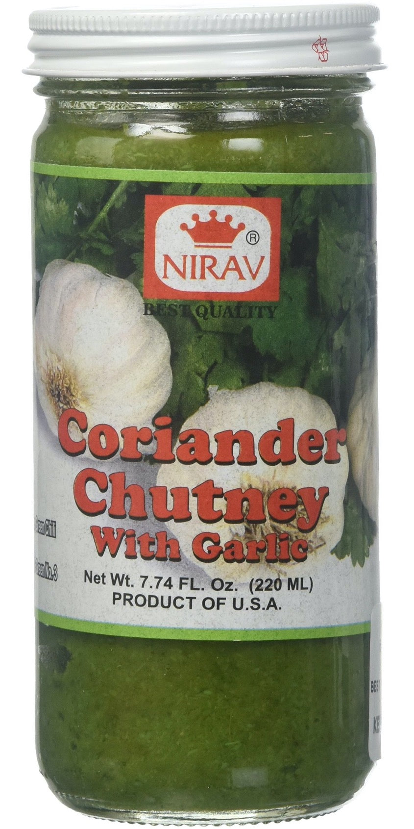 Nirav's Coriander Chutney is a world-renown condiment. This dark green pureeis made from fresh coriander leaves, ginger, garlic, green chili and spices.Its sharp and pungent flavor is great as a dip, and plays well with anythingyou want to add a fresh