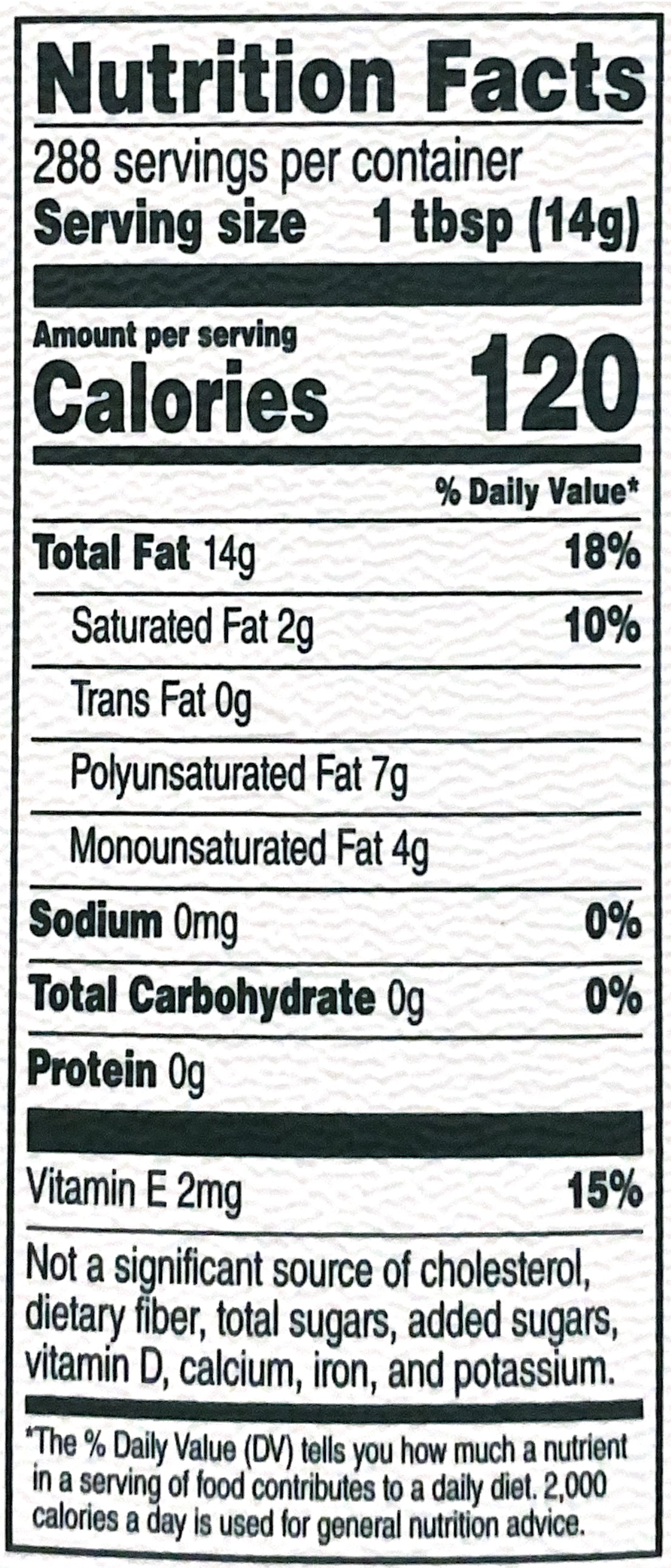 Very limited and preliminary scientific evidence suggests that eating about 1 tablespoon (16 grams) of corn oil daily may reduce the risk of heart disease due to the unsaturated fat content in corn oil. FDA concludes that there is little scientific evidence supporting this claim. To achieve this possible benefit, corn oil is to replace a similar amount of saturated fat and not increase the total number of calories you eat in a day. One serving of this product contains 14 grams of corn oil. Corn oil is a cholesterol-free food that contains 14 g of total fat per serving. See nutrition information for total fat and saturated fat content.