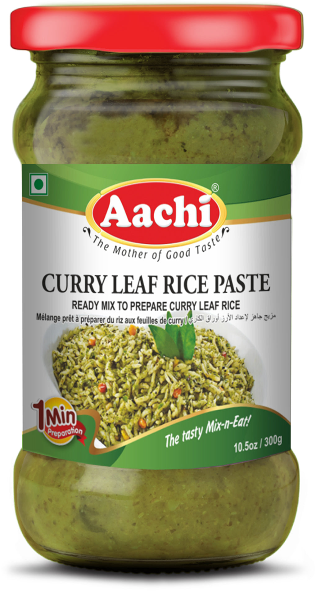 Preparation-Mix 3 – 4 tbsp of Aachi Curry leaf rice paste to 400 – 450g of cooked rice. Garnish with coriander leaves and serve.