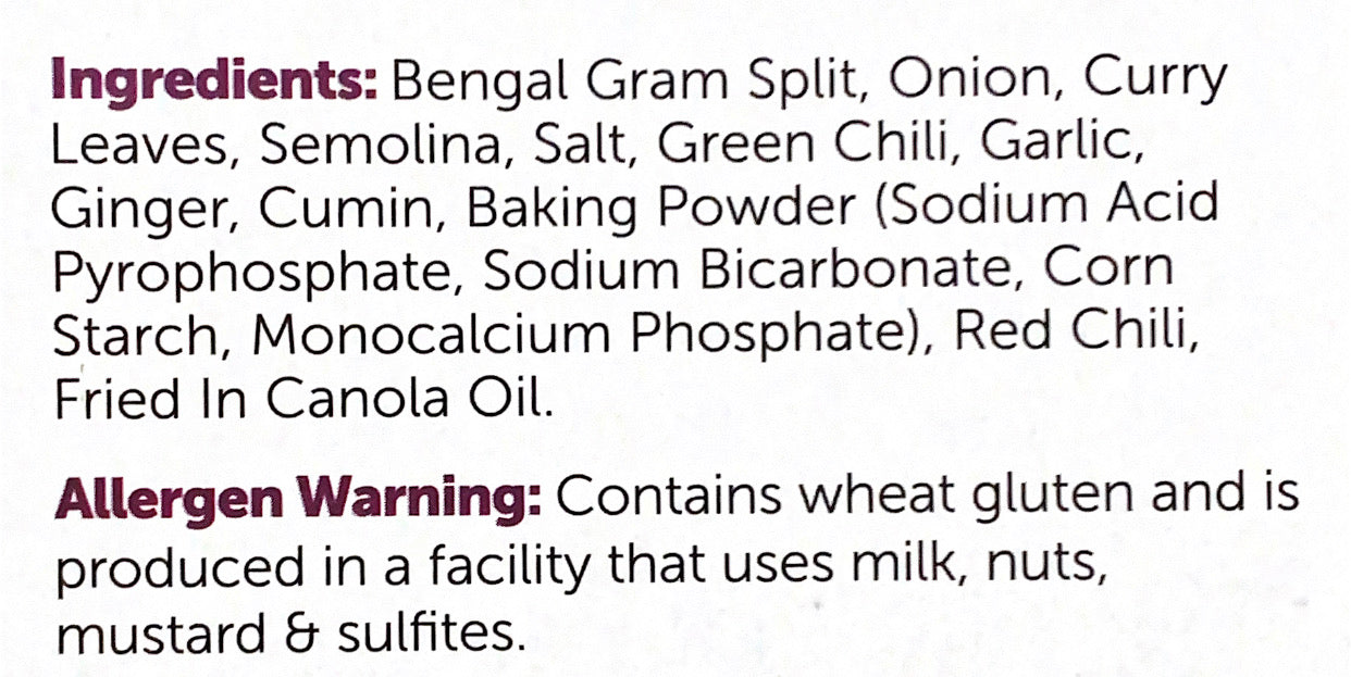 Bengal gram split, onion, curry leaves, semolina, salt, green chili, garlic, ginger, cumin, baking powder (sodium acid pyrophosphate, sodium bicarbonate, corn starch, monocalcium phosphate,red chili, fried in canola oil