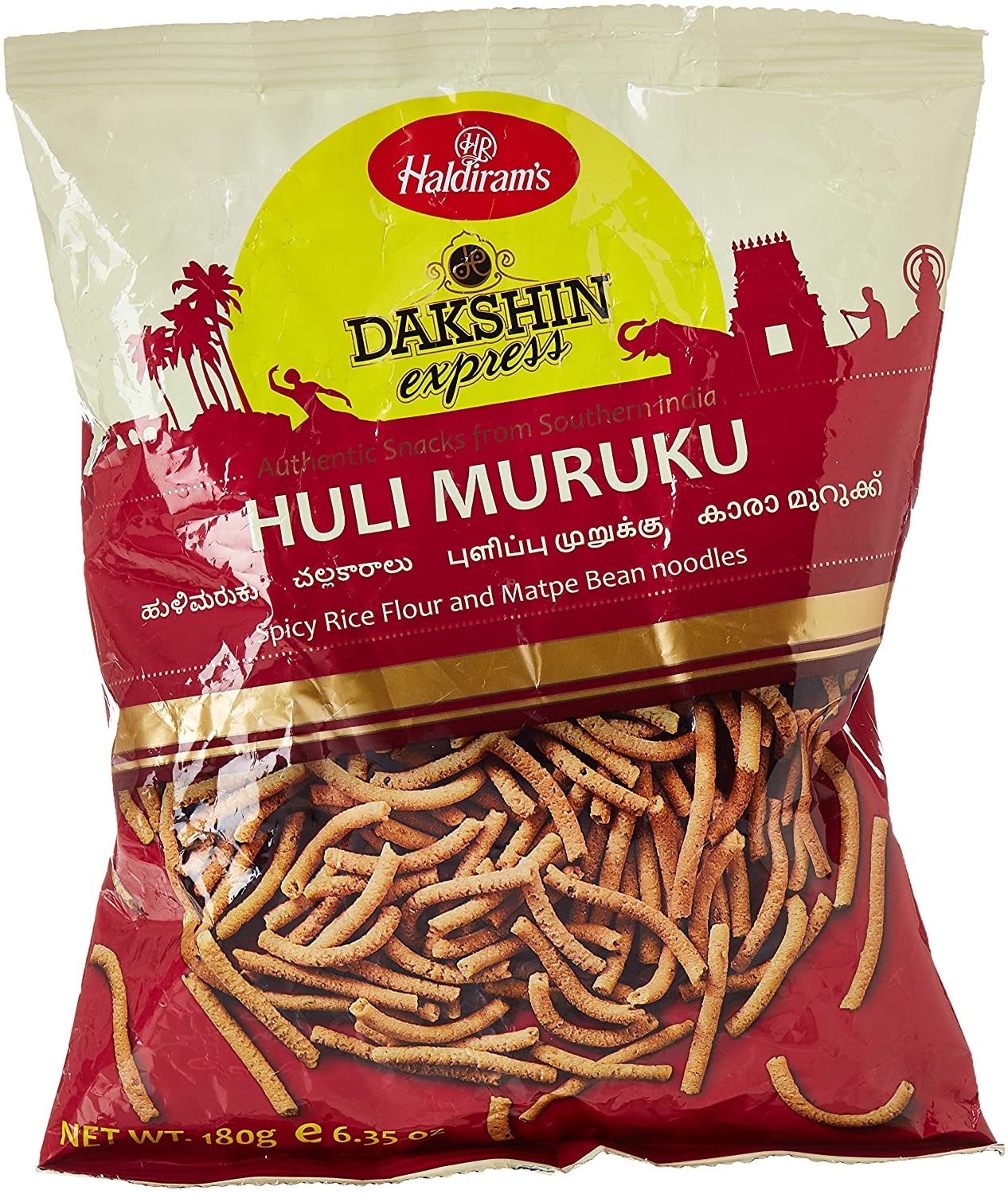 Haldirams Dakshin Express Huli Muruku is an authentic snack from southern India. It is a spicy rice flour and matpe bean noodles.