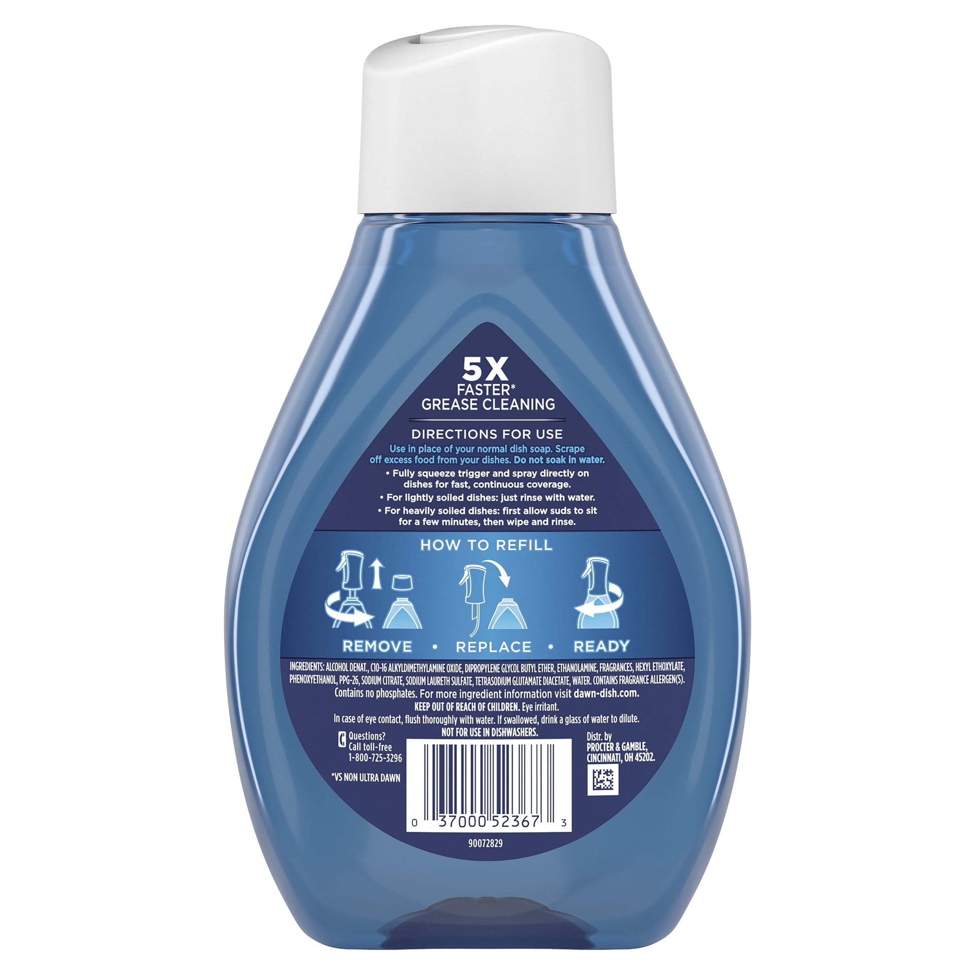 Dawn Platinum Powerwash Dish Spray, Dish Soap is the faster, easier way to clean as you go. The spray activated suds cut through grease on contact, without water for 5X Faster* Grease Cleaning (*vs Dawn Non-Concentrated). Just Spray, Wipe, and Rinse to stay ahead of the mess and get done faster. Dawn Powerwash is great for all your dishes with its unique spray technology even your hard to reach items, like blenders and baby bottles, are easy to clean. Just, Spray, Wipe, and Rinse. For tough messes, allow the suds to sit for a few minutes than just wipe and rinse away all the grease and suds. Available in easy to use refills and comes in three amazing scents; Fresh, Apple, and Citrus.