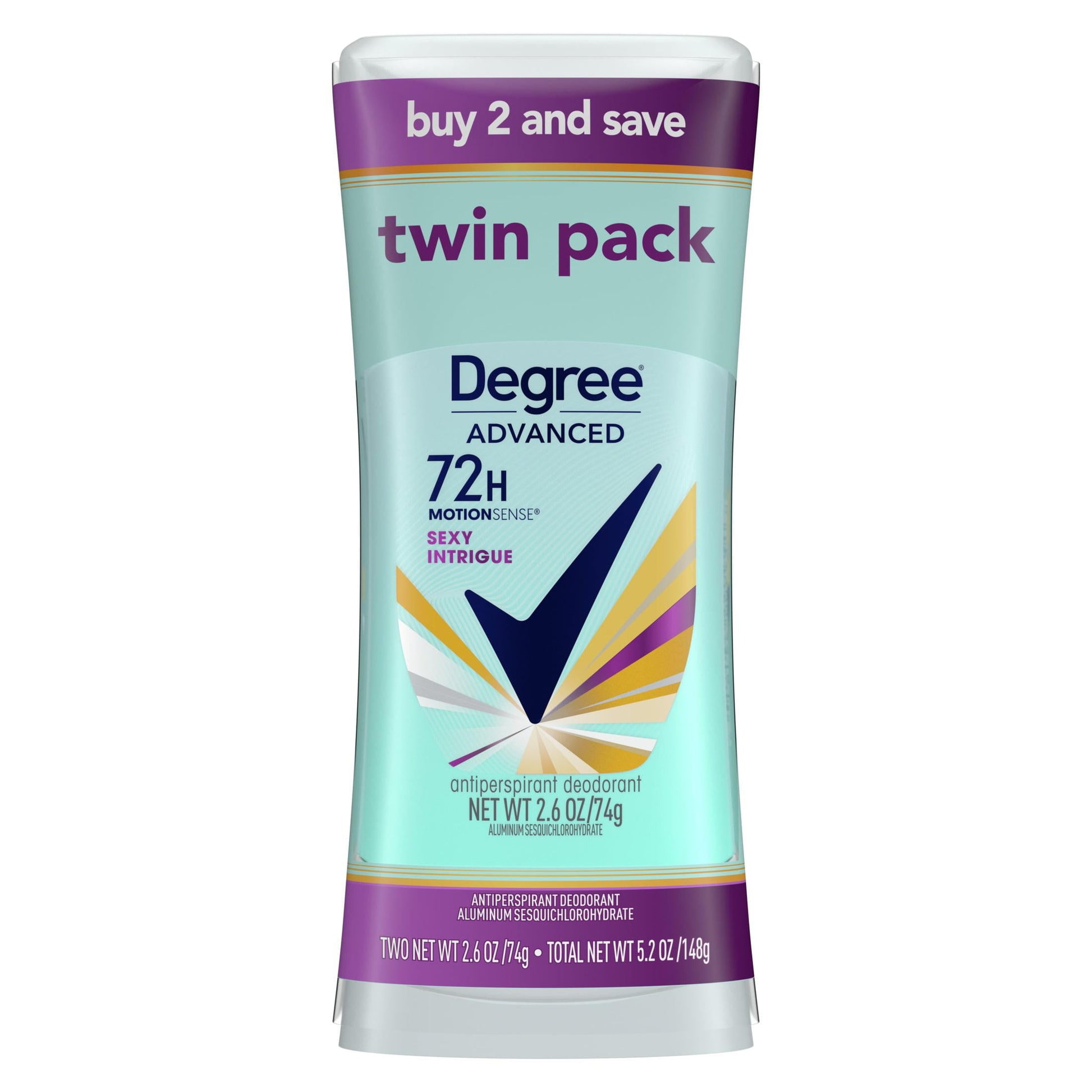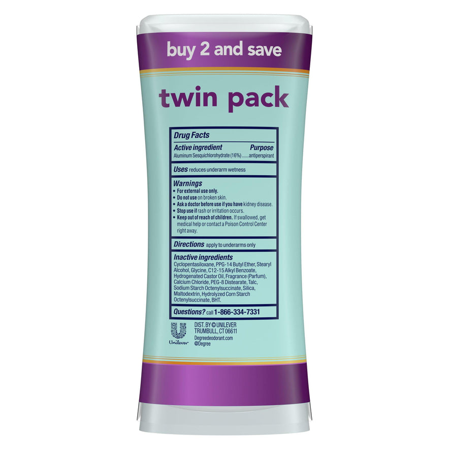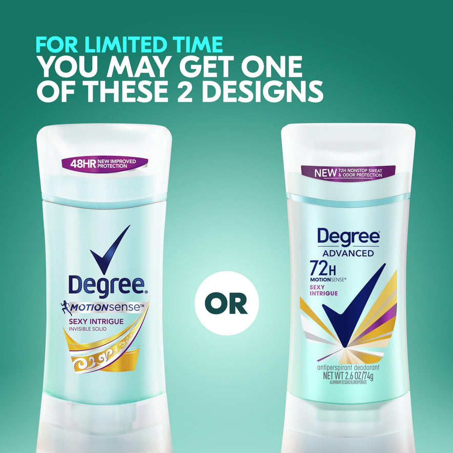 Degree Advanced Long Lasting Antiperspirant Deodorant Stick Twin Pack, Sexy Intrigue, Degree Women Stress Control Antiperspirant Deodorant Stick gives you superior protection from sweat and body odor all day long, so you can stay fresh and confident. Try pairing this deodorant stick with a Degree Women Antiperspirant Deodorant Dry Spray! This deodorant for women contains Degrees' innovative MotionSense technology to keep you fresh with every move. Degree MotionSense responds directly to your body movement, releasing extra freshness when you move. Degree MotionSense works like this: unique microcapsules sit on the surface of your skin. When you move, friction breaks those microcapsules, and they release more fragrance. So, every time you move, MotionSense keeps you fresh and free from body odor. The more you move, the more it protects! It comes in an easy-to-use applicator stick.