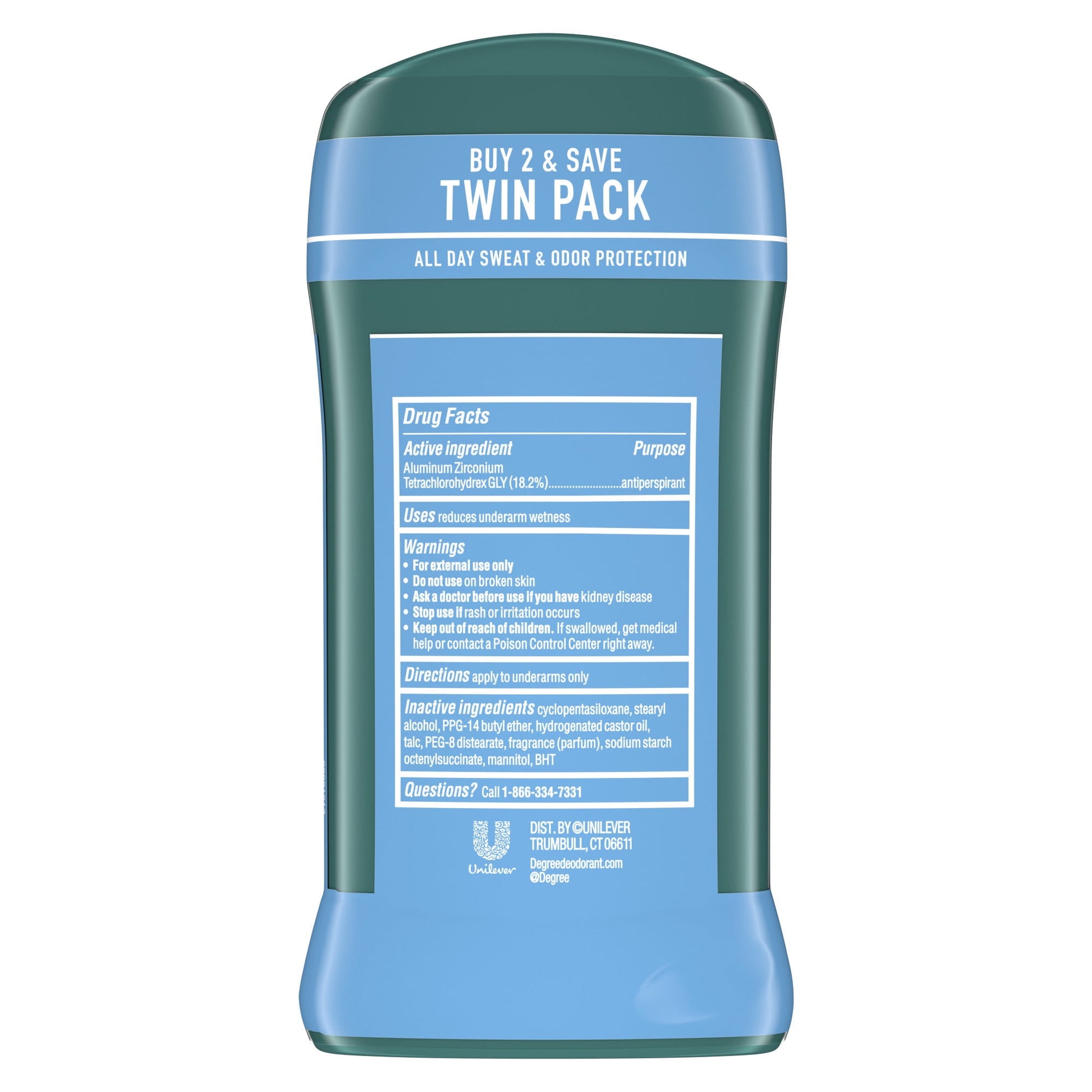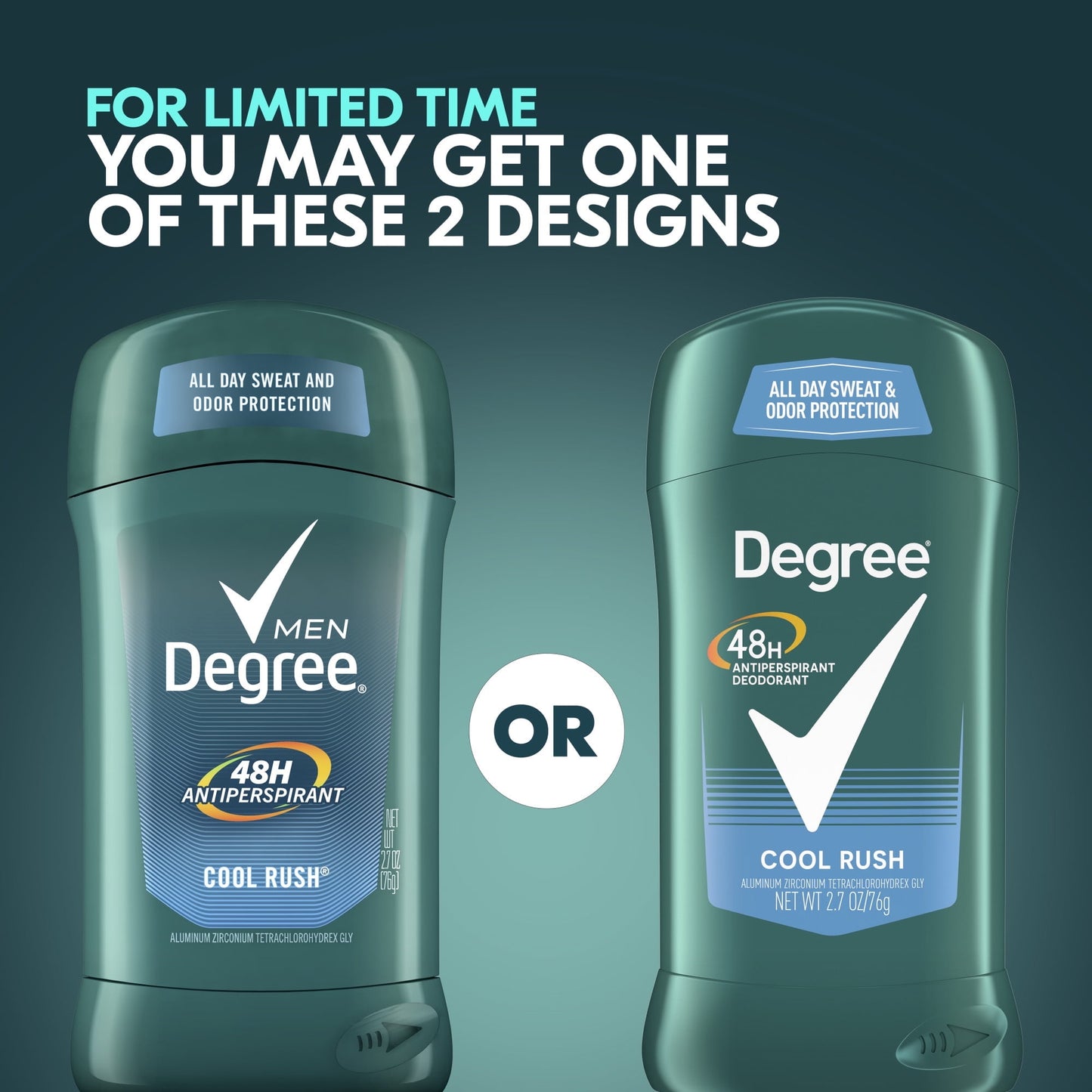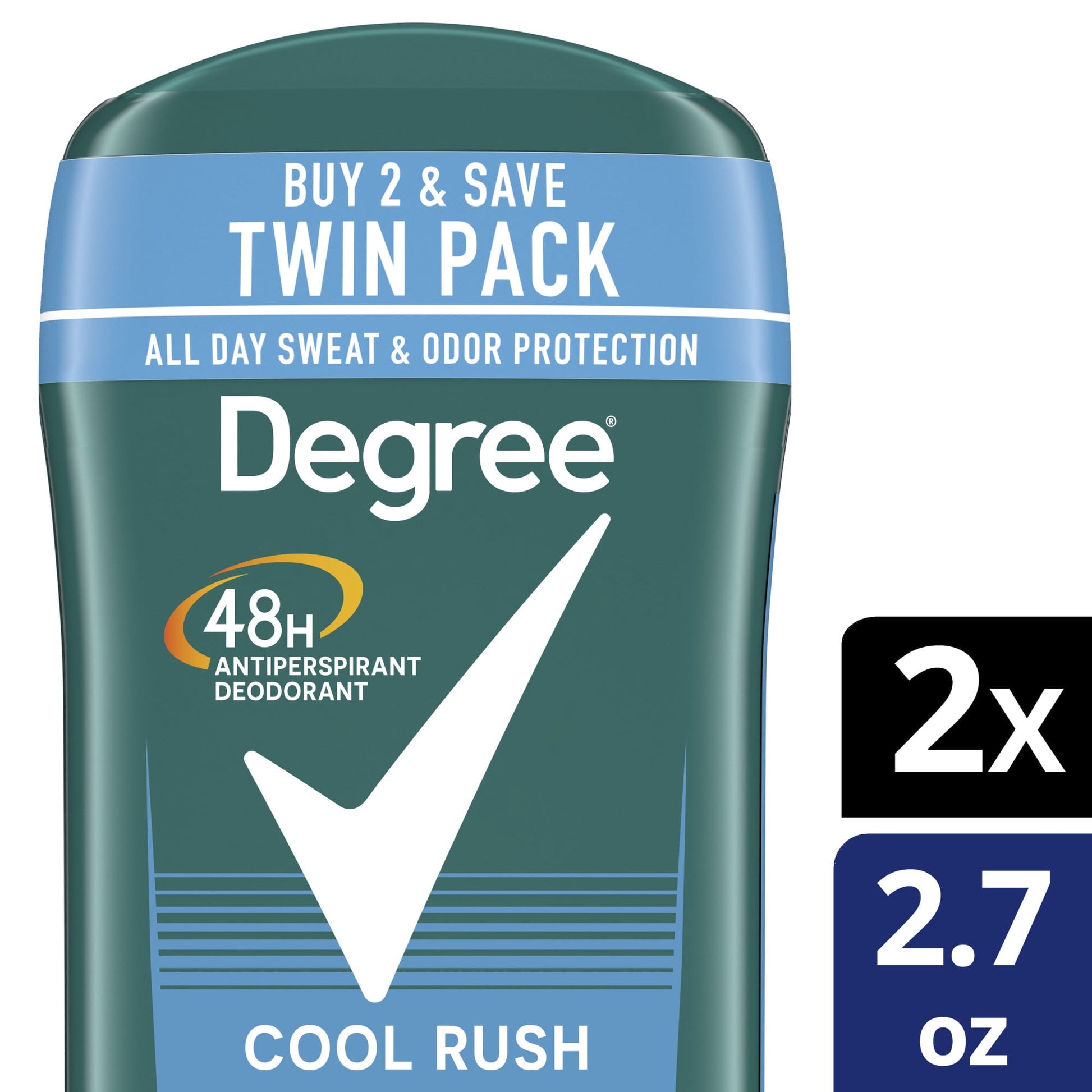 Degree Long Lasting Antiperspirant Deodorant Stick Twin Pack, Cool Rush, Degree Cool Rush helps keep you fresh and dry, no matter what. This men's Antiperspirant has 48H non-stop protection, non-stop confidence with a scent that combines an energizing burst of crisp, arctic freshness in Cool Rush men's fragrance and. Whether you're having a long day in the office, playing sports outdoors, or working out in the gym, you can be confident that with this men's deodorant, you'll be protected from underarm sweat and body odor. Designed by experts to be activated by your body heat, Degree Cool Rush is a men's Antiperspirant deodorant stick that works as hard as you do Whatever you do, however, you do it, Degree wants to help inspire the confidence in you to move more, and with this deodorant for men, it'll provide you the confidence that sweat and odor will not get in the way of your progress. Degree. It will not let you down.
