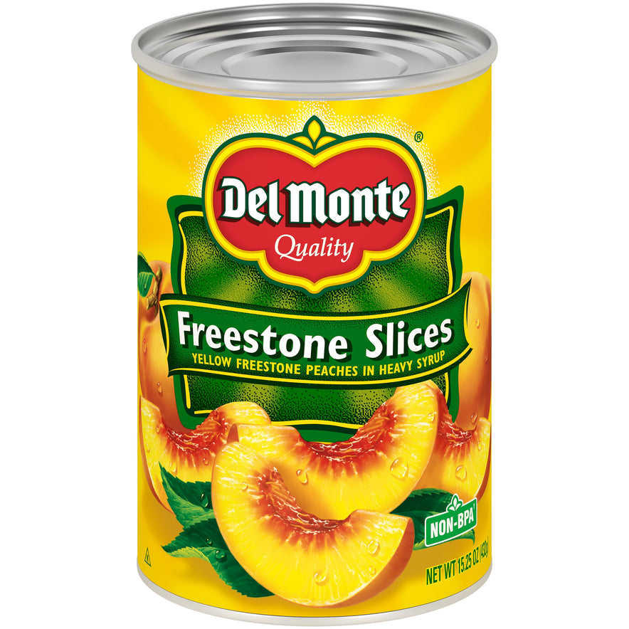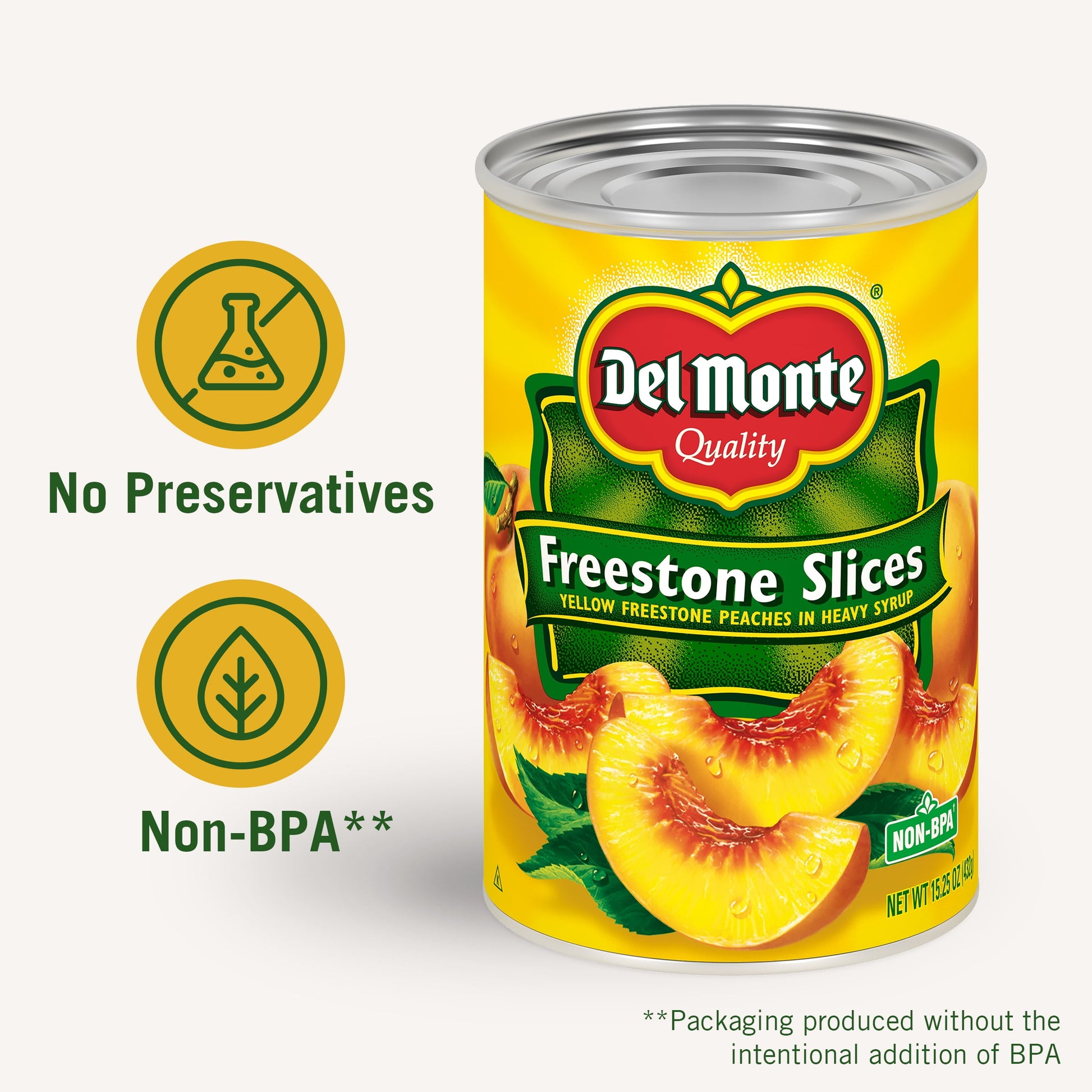 DEL MONTE Yellow Freestone Sliced Peaches in Heavy Syrup make it easy to enjoy high quality fruit in minutes. These canned peach slices are packed with delicious, sweet peaches in heavy syrup for a fruit snack you can feel good about. DEL MONTE peaches contain no artificial preservatives, making them a convenient, wholesome and ready to eat fruit option for busy nights. Picked and packed at the peak of ripeness and immersed in heavy syrup, this canned fruit is ideal as part of a quick lunch snack or as a flavorful peach pie filling or addition to fruit salad. For more delicious options, try using the canned peach slices to make peach jam. Each Non-BPA* can stores well in a pantry or cabinet for a convenient fruit snack whenever you need delicious fruit on-the-go. Bring the wholesome goodness of the Earth to your family with DEL MONTE Peaches. *Packaging produced without the intentional addition of BPA.