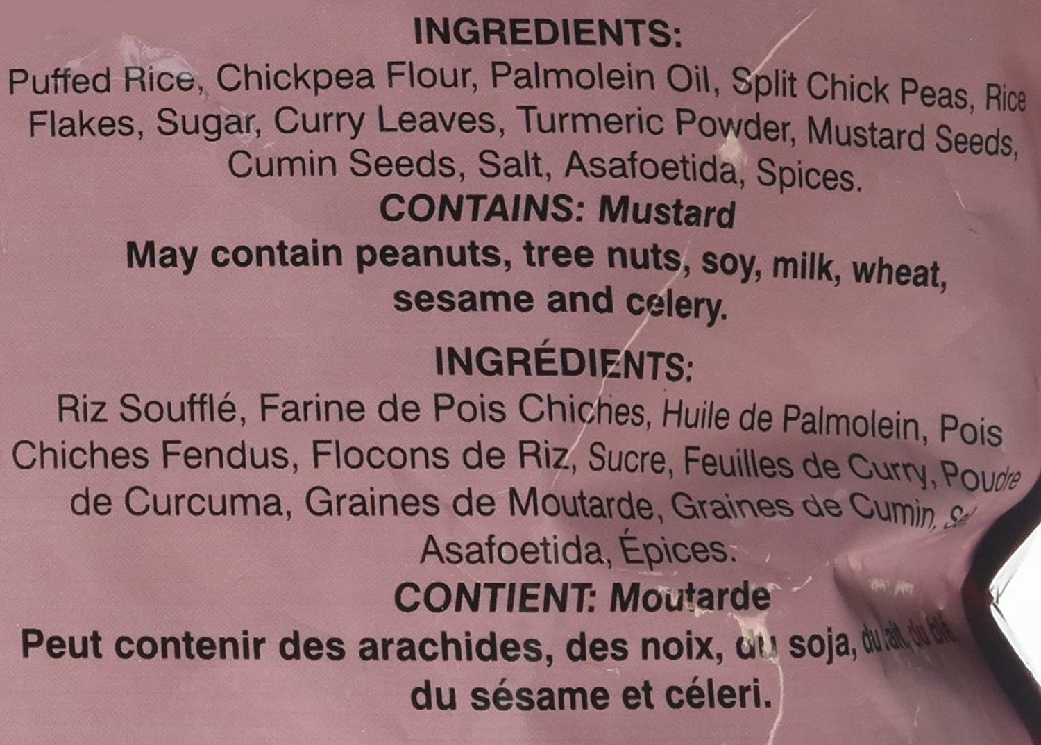 Ingredients: chick pea flour, parched rice, wheat flour, rice flour, corn oil and canola oil, salt, red pepper, turmeric.