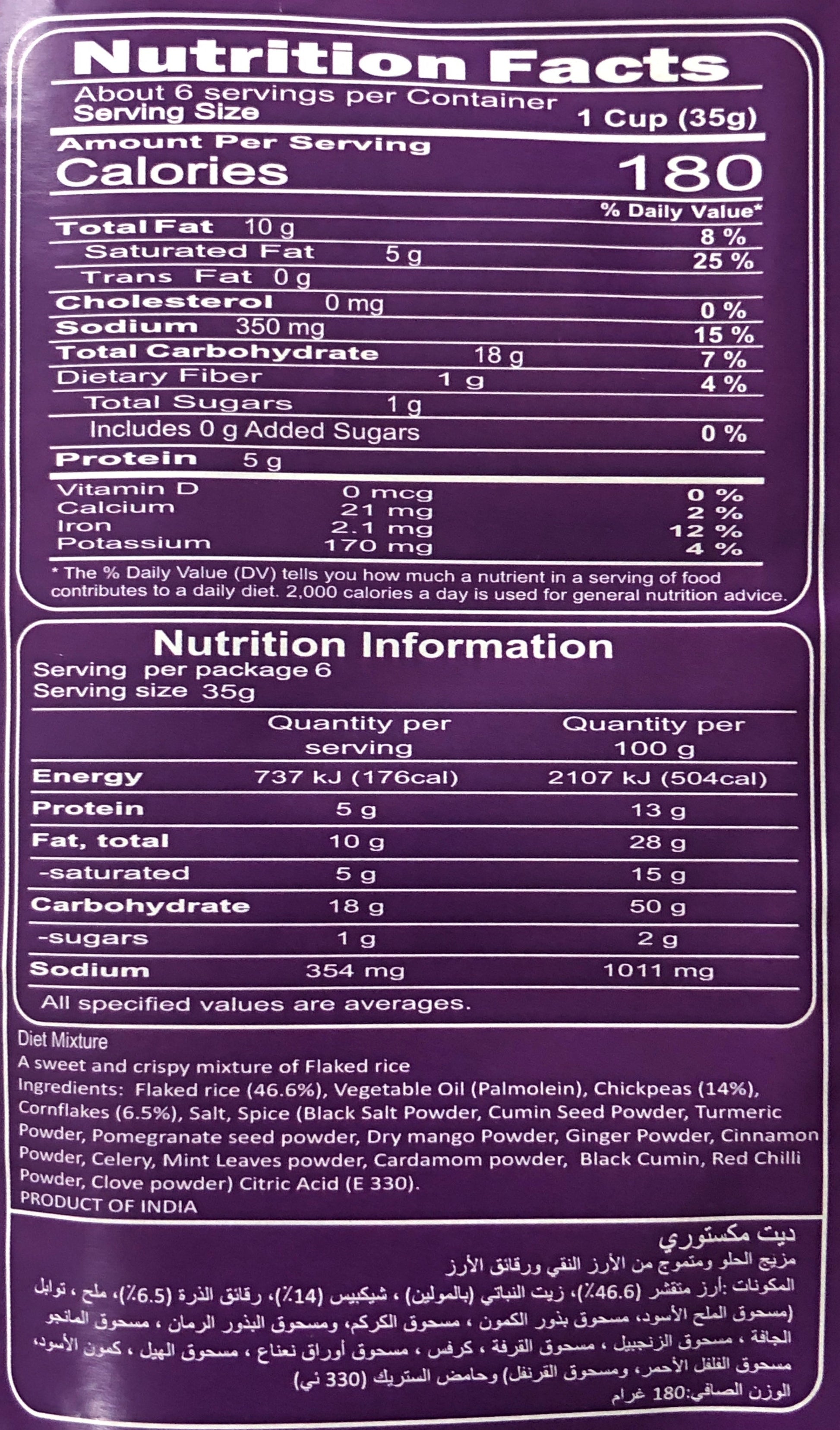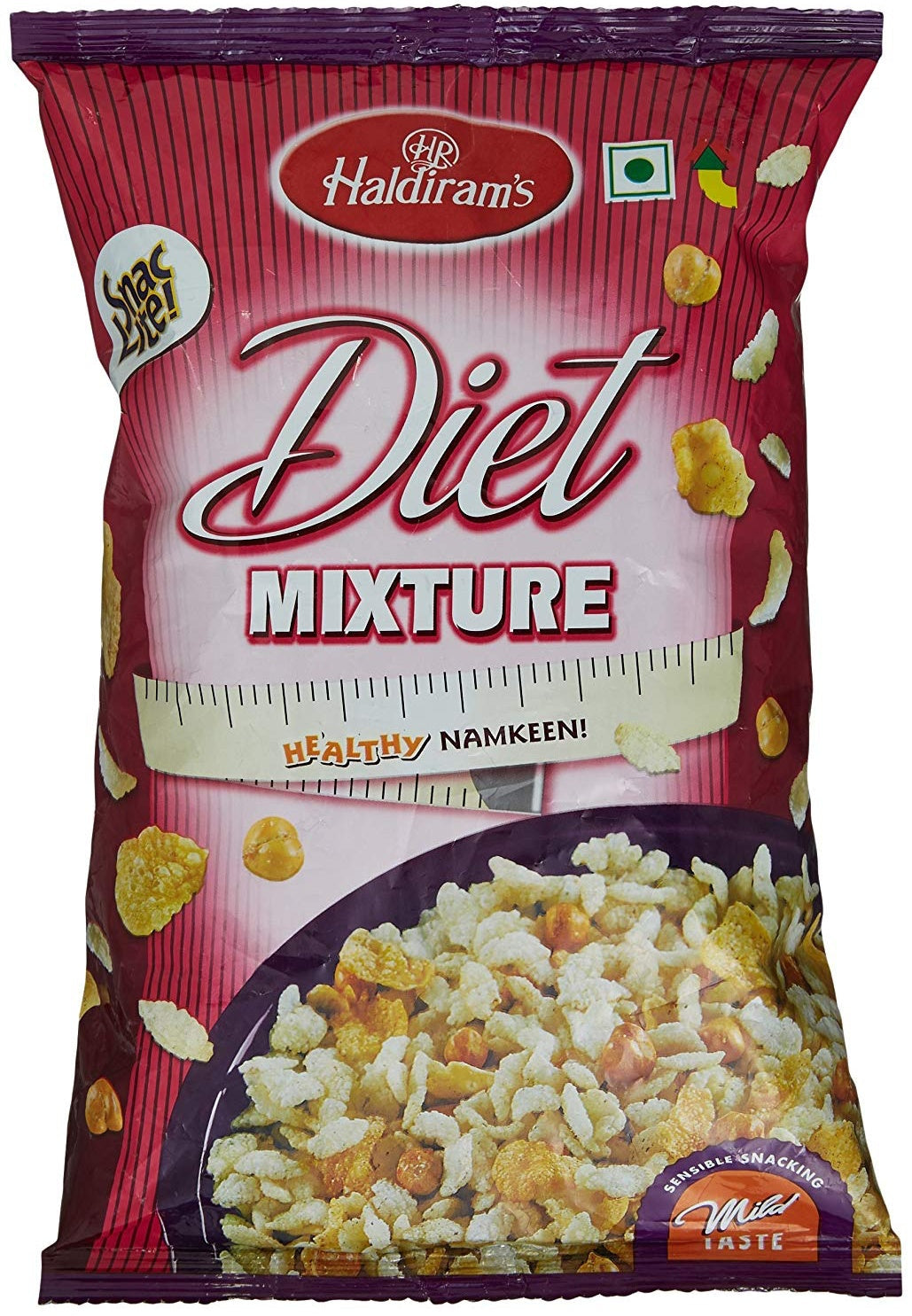 Haldiram's Diet Mixture is a sweet and crispy mixture of flaked rice with added whole, roasted chickpeas and cornflakes. Mildly spiced with black pepper, mango powder, cumin and other spices.