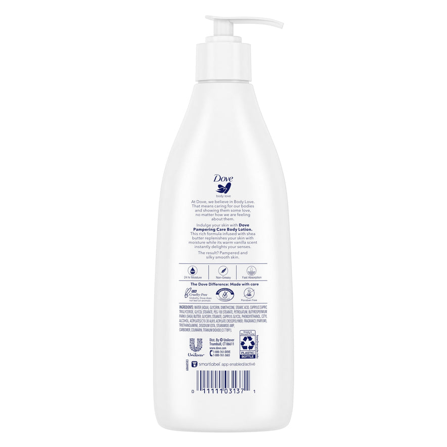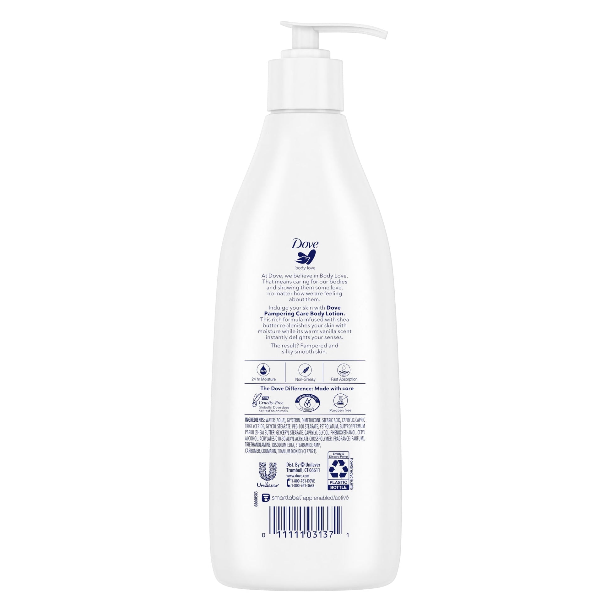 Dove Body Love Pampering Care Non Greasy Body Lotion Cream Oil, 13.5 fl oz, Dove believes in Body Love. That means caring for your body and showing it some love, no matter how you're feeling about it. With the new Dove Body Love collection, our hand and body lotions combine care for your skin with self-care for you. With a fast-absorbing and non-greasy formula, Dove Body Love Pampering Care body lotion provides long-lasting care for soft, smooth, and radiant skin. This body lotion is infused with restoring ceramide serum to replenish ceramides with nutrients that strengthen the skin's moisture barrier. Indulge your senses with the delicate scent of creamy shea butter and warm vanilla, bringing you comfort while nourishing your skin. This fast-absorbing, non-greasy lotion for dry skin is also dermatologist-approved, making it suitable for all skin types, and perfect for everyone, every day.