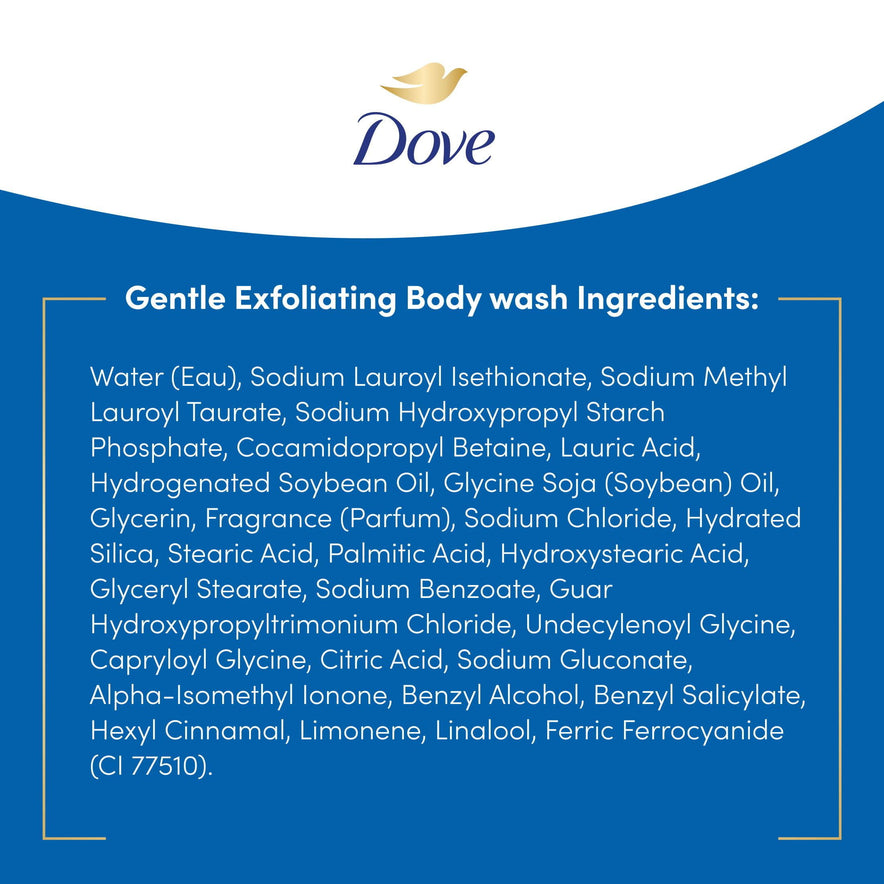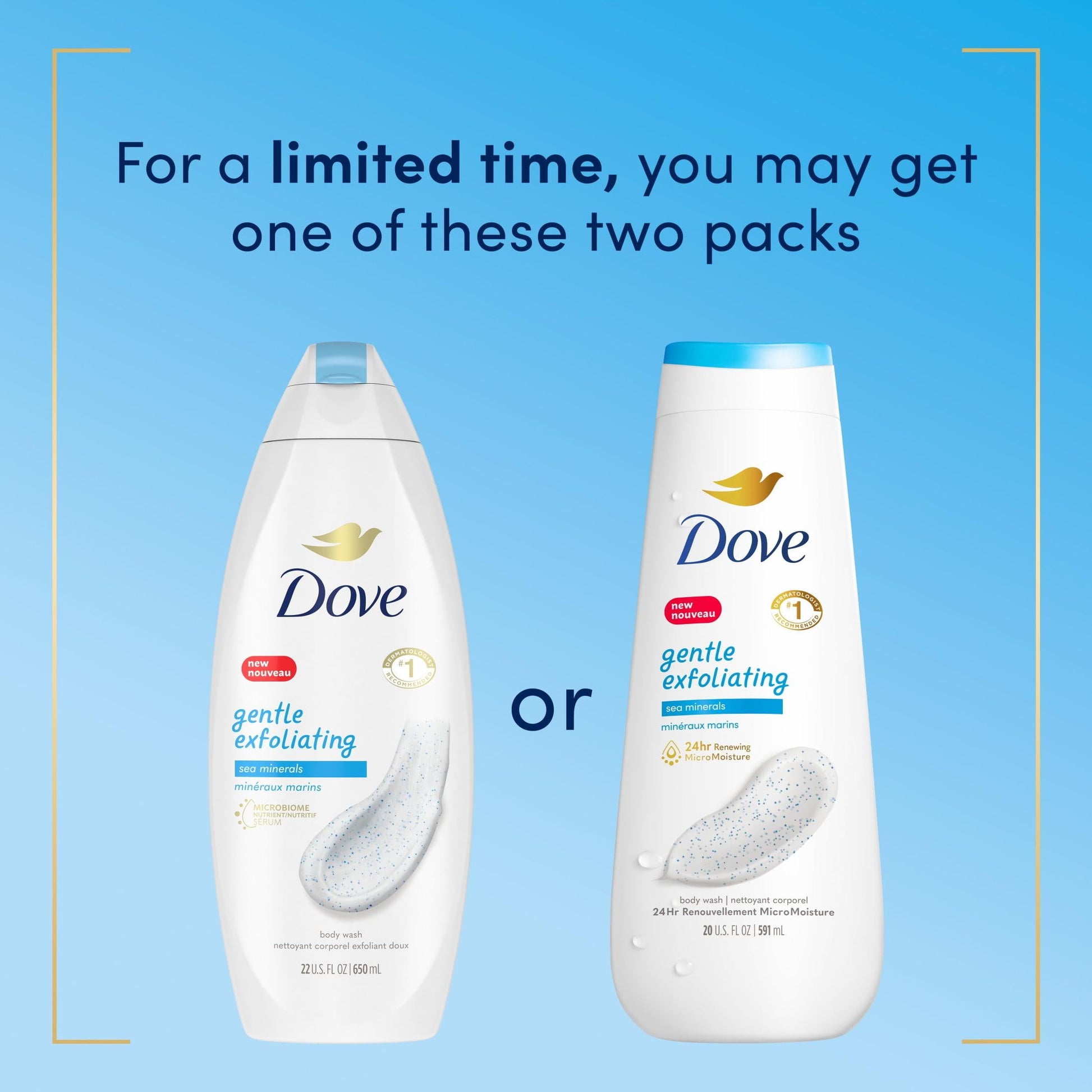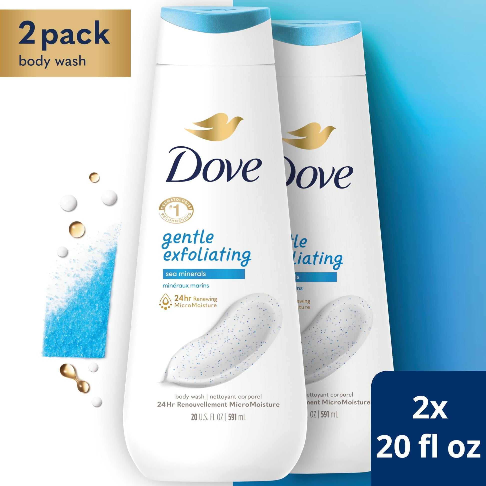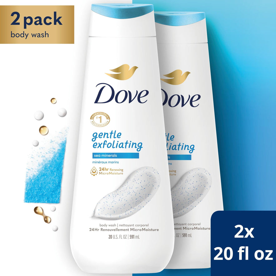 Dove Gentle Exfoliating Long Lasting Body Wash Twin Pack, Sea Minerals, 20 fl oz, Looking for a skin cleanser that uplifts your senses and helps you reveal radiant, visibly smooth skin? The #1 dermatologist-recommended body wash, Dove Gentle Exfoliating Body Wash refreshes your skin and senses with sea minerals that softly buffs away dry skin. This body wash with sea minerals is sulfate- and paraben-free with a mild, pH-balanced formula, making it a great body wash for dry skin, unlike typical bath soap or shower gel. This body wash uses Dove Moisture Renew Blend, a combination of skin-natural nourishers and plant-based moisturizers. The lipids and glycerin in our formula absorb deeply into the top layers of skin, where they get right to work! This proprietary blend of moisturizing ingredients is proven to work with your skin to nourish it, so it can maintain and create new moisture. For best results, squeeze the gently exfoliating body wash with sea minerals into your hand or onto a shower pouf and work it into a rich lather. Massage it over your skin, taking time to allow the refreshing, crisp scent to uplift your senses.