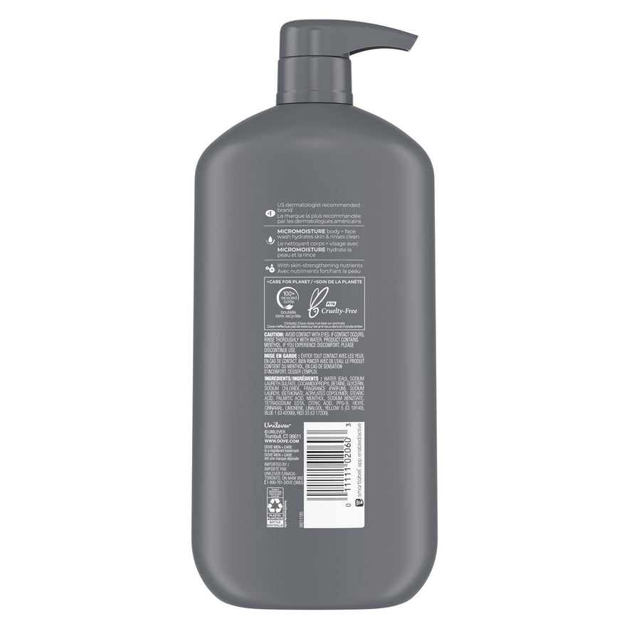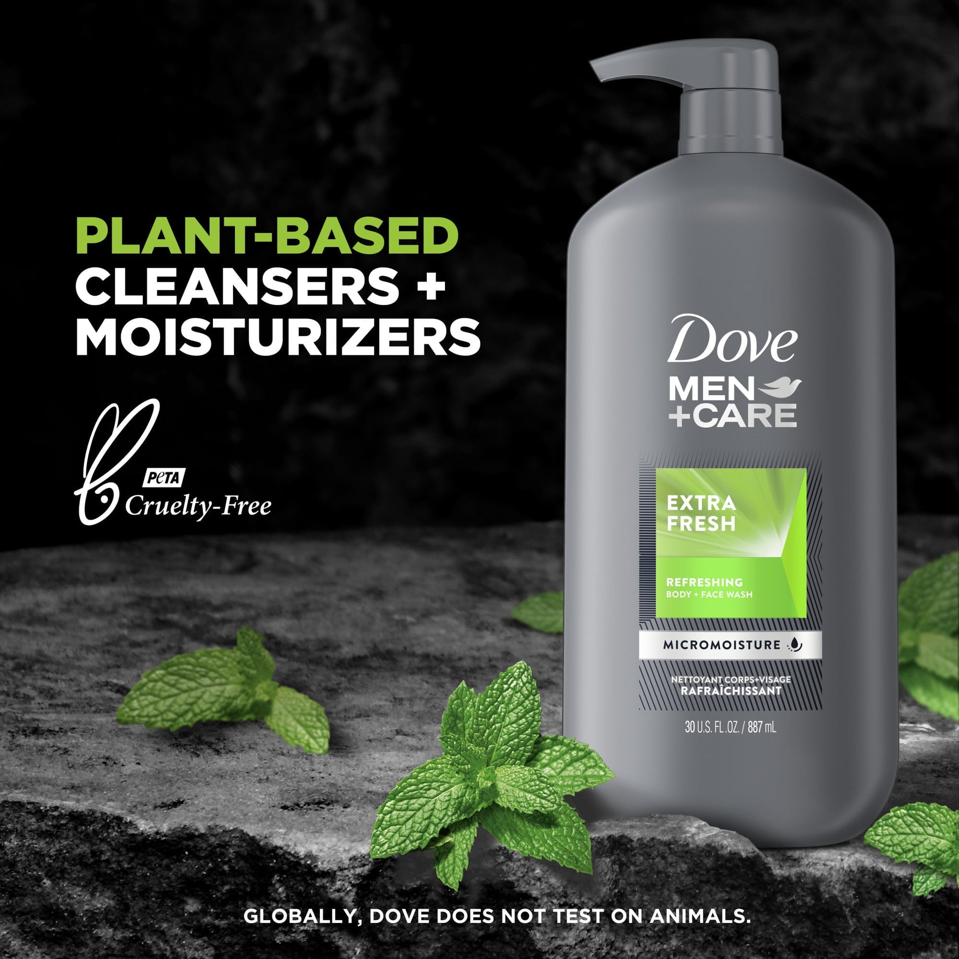 Dove Men+Care Extra Fresh Refreshing Hydrating Face and Body Wash, Men's skin is 25% thicker and contains higher levels of protein. That means more sweat, lower hydration levels, and easily irritated skin. So, forget about harsh soaps. Try Dove Men+Care Extra Fresh Body and Face Wash to your men's skin care and shower routine! This body wash for men is specifically designed for men's skin by the #1 dermatologist recommended men's brand since 2013. Typical soap for men strips away oil and other essential skin components, leaving you with dry, flaky, and irritated skin. Dove Men+Care is a mild cleanser with plant-based moisturizers and skin-strengthening nutrients to help rebuild skin and skin proteins. Dove Men+Care Body and Face Wash is an easy-to-rinse, hydrating body wash that is clinically proven to fight dry skin better than a regular men's body soap or shower gel. It is also gentle enough to use as a face wash for men. Extra Fresh has a clean, crisp scent that will leave you feeling fresh. It's also just as effective for cleansing hands. For best use, squeeze Dove Men+Care Body and Face Wash on to your palm and rub your hands together to work the shower gel into a light foam to activate the Micro-Moisture Technology. Apply to your body and face. Rinse thoroughly. Dove Men+Care champion active fathers and the need for paid paternity leave. Find out more about their work in celebrating fatherhood and raising awareness around parental leave on the Dove Men+Care site. And as part of our commitment towards sustainability, each Dove Men+Care body and face wash bottle is recyclable and made with 100% recycled plastic and is PETA certified Cruelty Free.