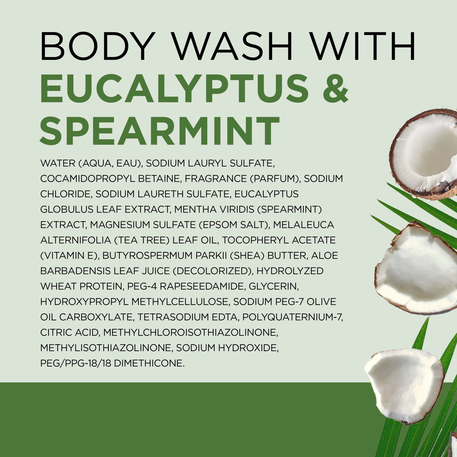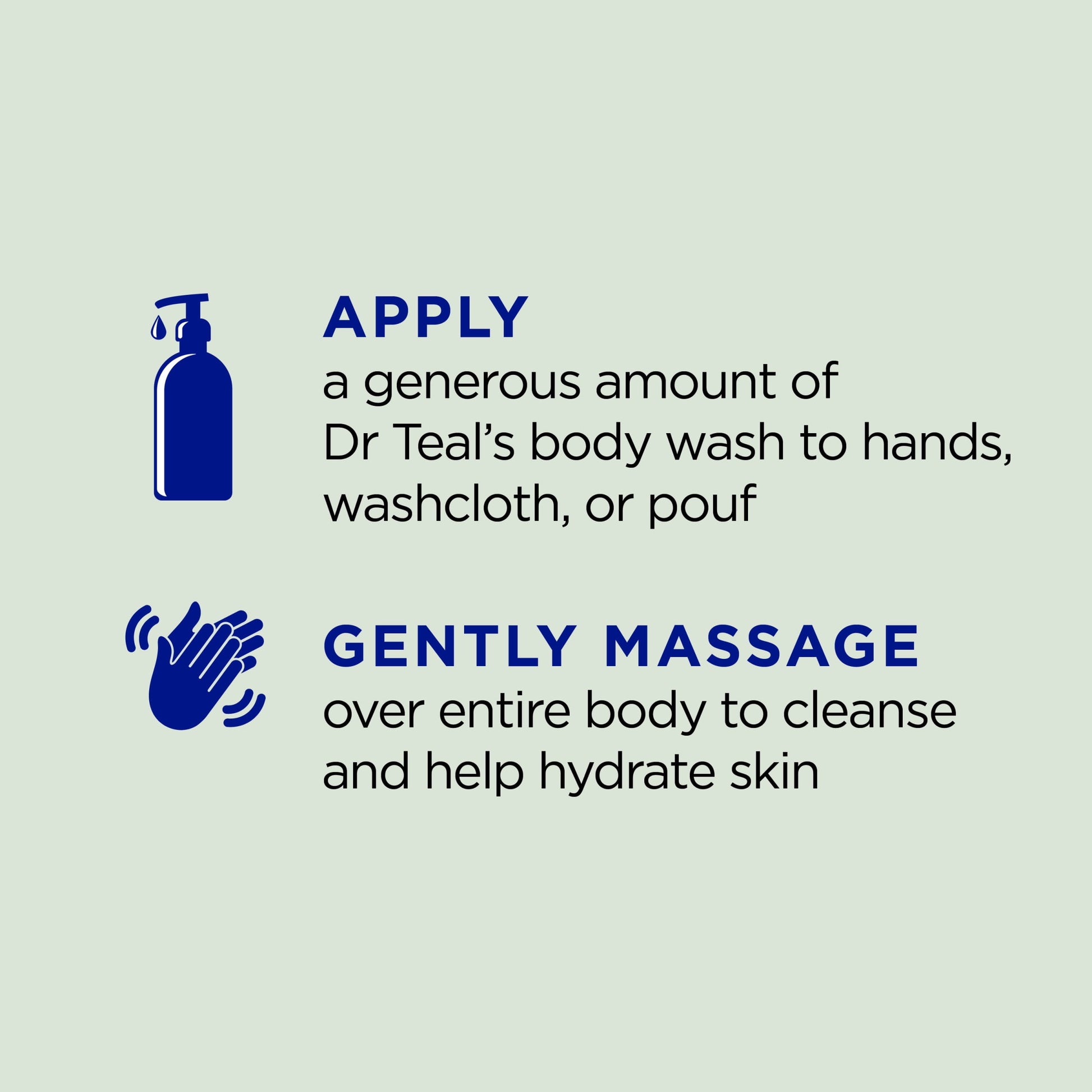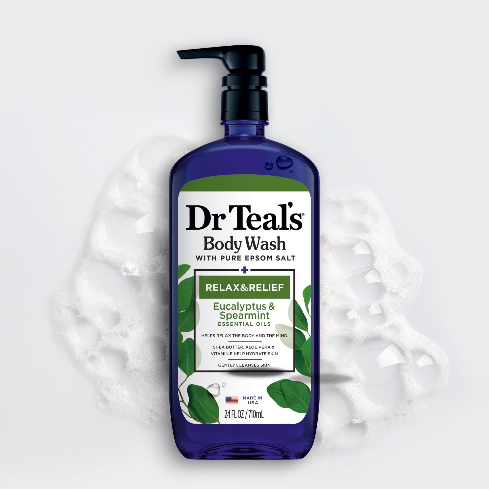 Soothe your soul before or after a long day with Dr. Teal's Eucalyptus Body Wash 24Fl Oz. This essential oil-infused, hydrating skin care product relaxes the body and calms the mind, thanks to the benefits of eucalyptus and spearmint. Dr Teals Ultra-Moisturizing Body Wash hydrates and conditions skin, restoring its original softness. Aloe Vera, Shea Butter and Vitamin E nourish and moisturize, while Pure Epsom Salt (Magnesium Sulfate P.) helps relieve tired, achy muscles. DIRECTIONS: For a refreshing, spa-like experience, apply a small amount of body wash to hands, a wash cloth, or a pouf. Gently massage all over your body for ultra-moisture and total rejuvenation.