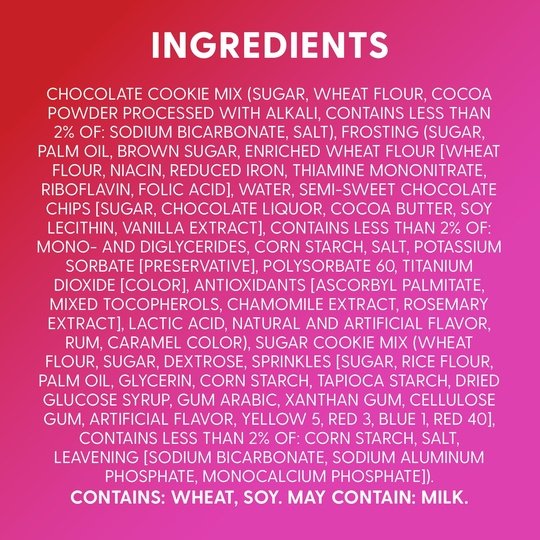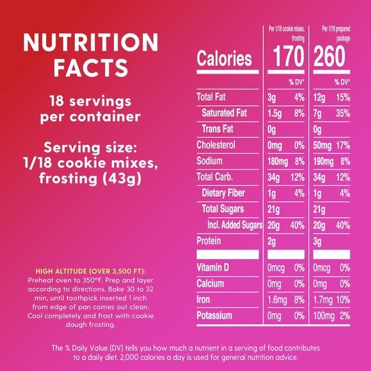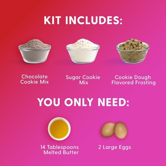 Each baking kit includes: confetti sugar cookie mix, chocolate cookie mix, chocolate chip cookie dough flavored frosting and detailed directions on how to make a yummy dessert everyone will enjoy
