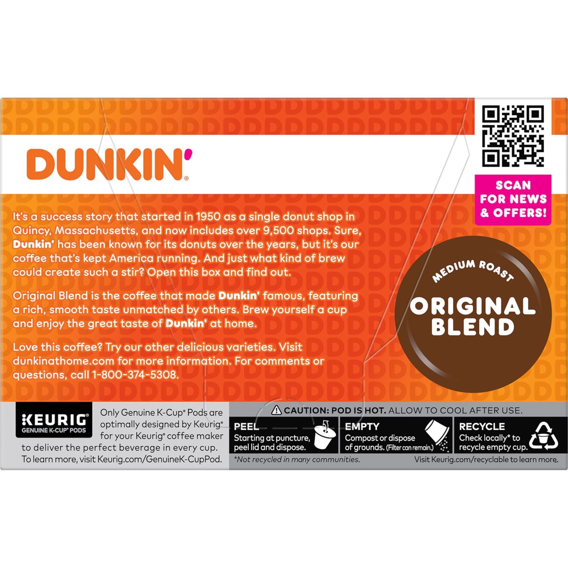 America runs on Dunkin and this is the coffee that started it all. Dunkin Original Blend Coffee is the rich, smooth, medium roast that made the brand famous. These convenient K-Cup pods contain coffee made from premium beans, roasted and blended to deliver that same deliciously drinkable coffee taste that could only be Dunkin: a perfect, no-fuss flavor. Better yet, its ready in a snap. So, when the craving strikes and theres not even time to make it to a drive-thru, just pop a pod into your Keurig machine, and enjoy your go-to Dunkin coffee taste at home.