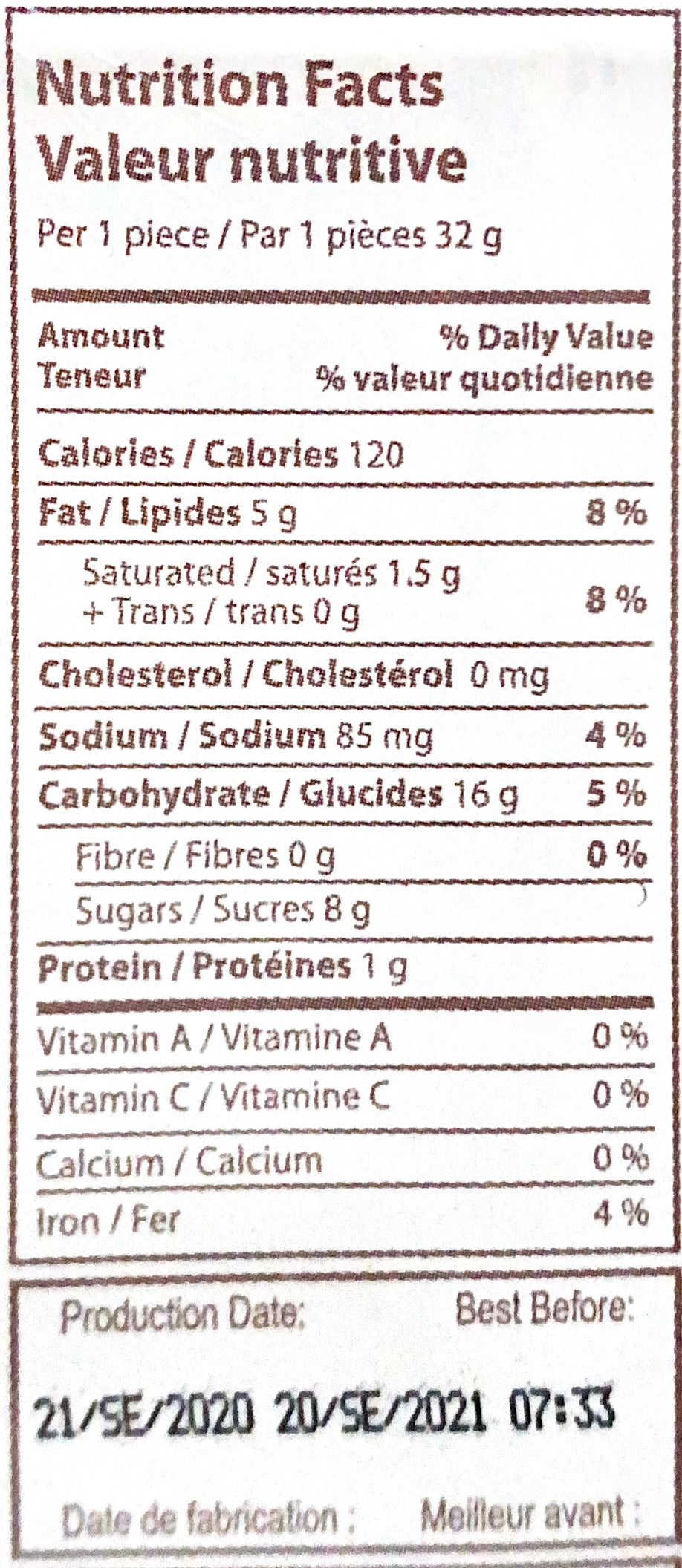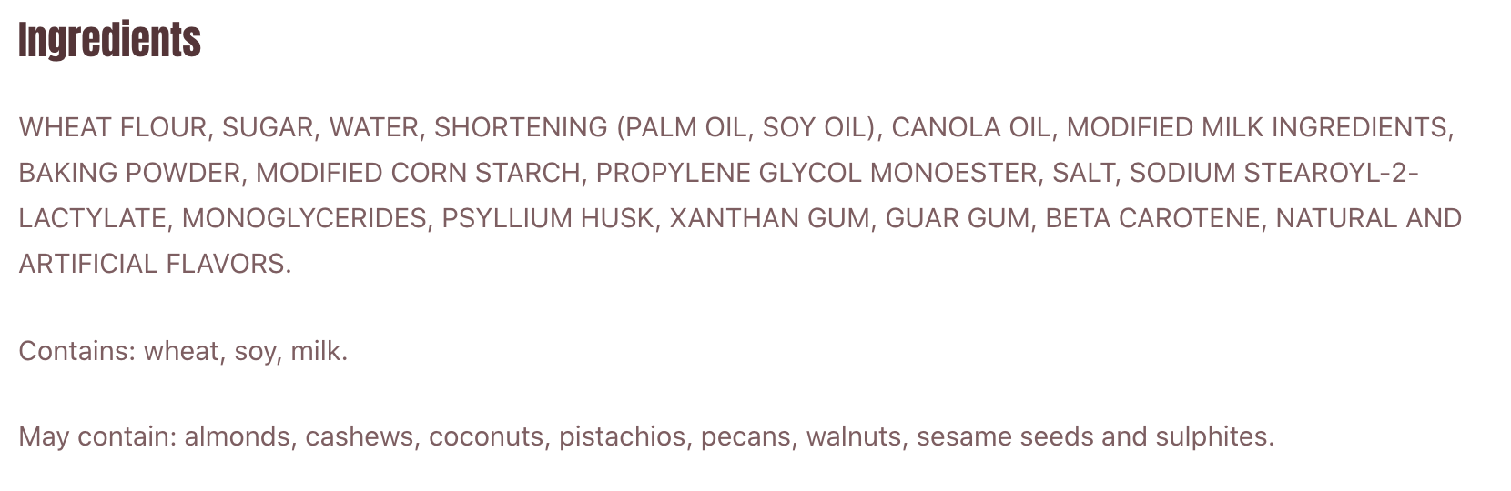 WHEAT FLOUR, SUGAR, WATER, SHORTENING (PALM OIL, SOY OIL), CANOLA OIL, MODIFIED MILK INGREDIENTS, BAKING POWDER, MODIFIED CORN STARCH, PROPYLENE GLYCOL MONOESTER, SALT, SODIUM STEAROYL-2-LACTYLATE, MONOGLYCERIDES, PSYLLIUM HUSK, XANTHAN GUM, GUAR GUM, BETA CAROTENE, NATURAL AND ARTIFICIAL FLAVORS.
