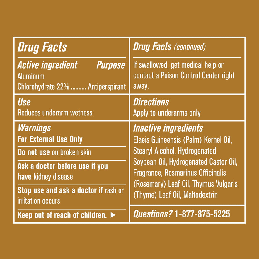 The 24-hr, dermatologist- tested sweat stopper. Take a swipe at odor and wetness with long-lasting, naturally derived ingredients. We include antimicrobial Rosemary and Thyme Oils to help keep odor at bay.