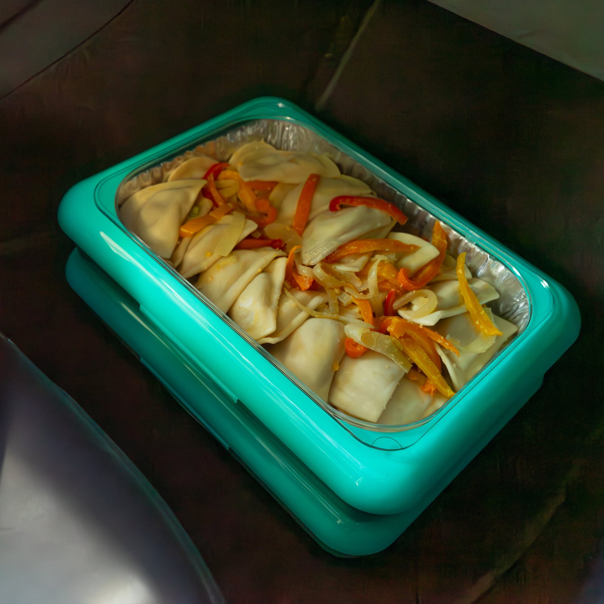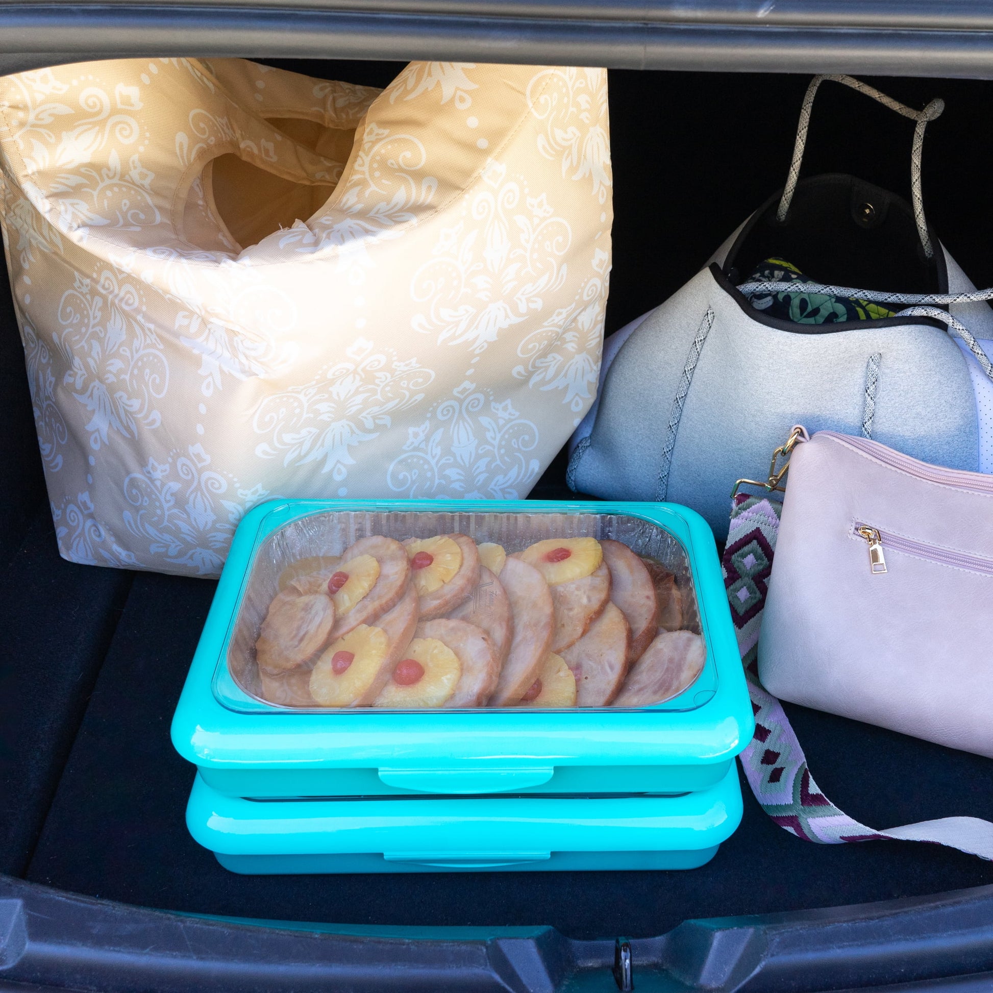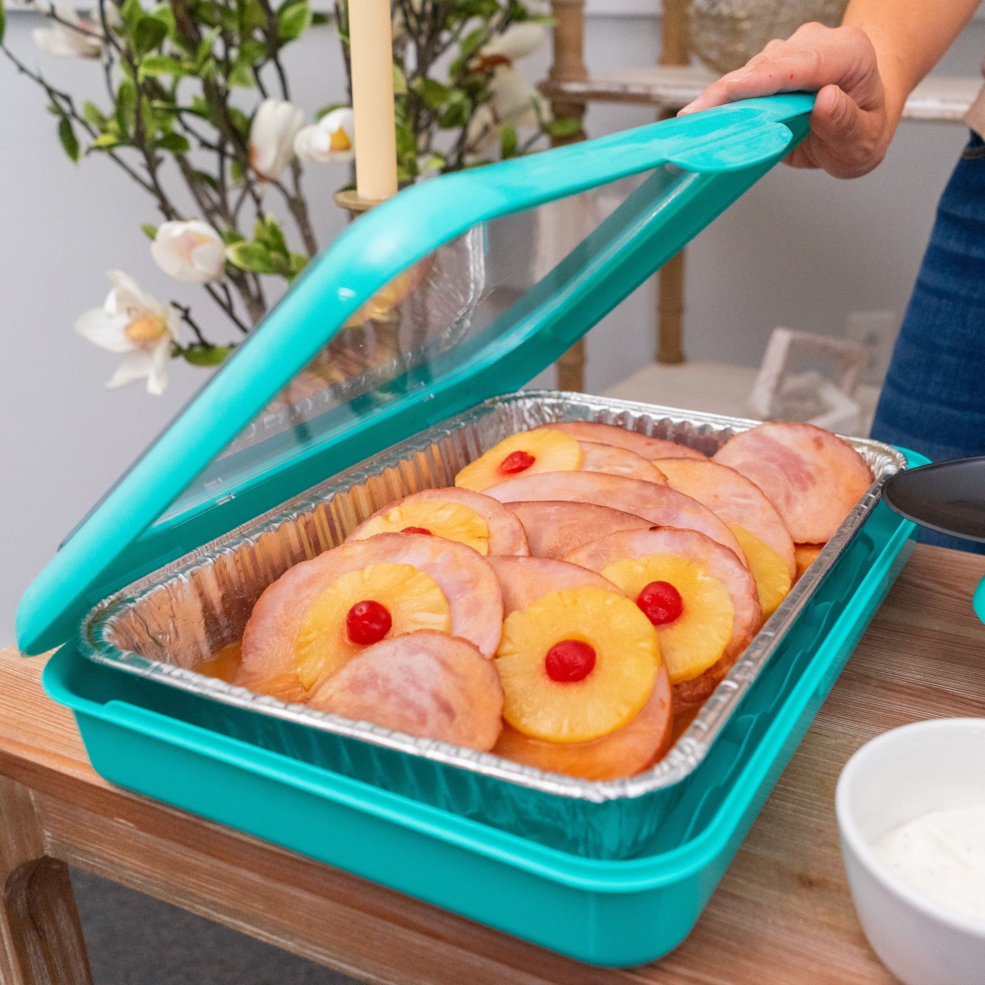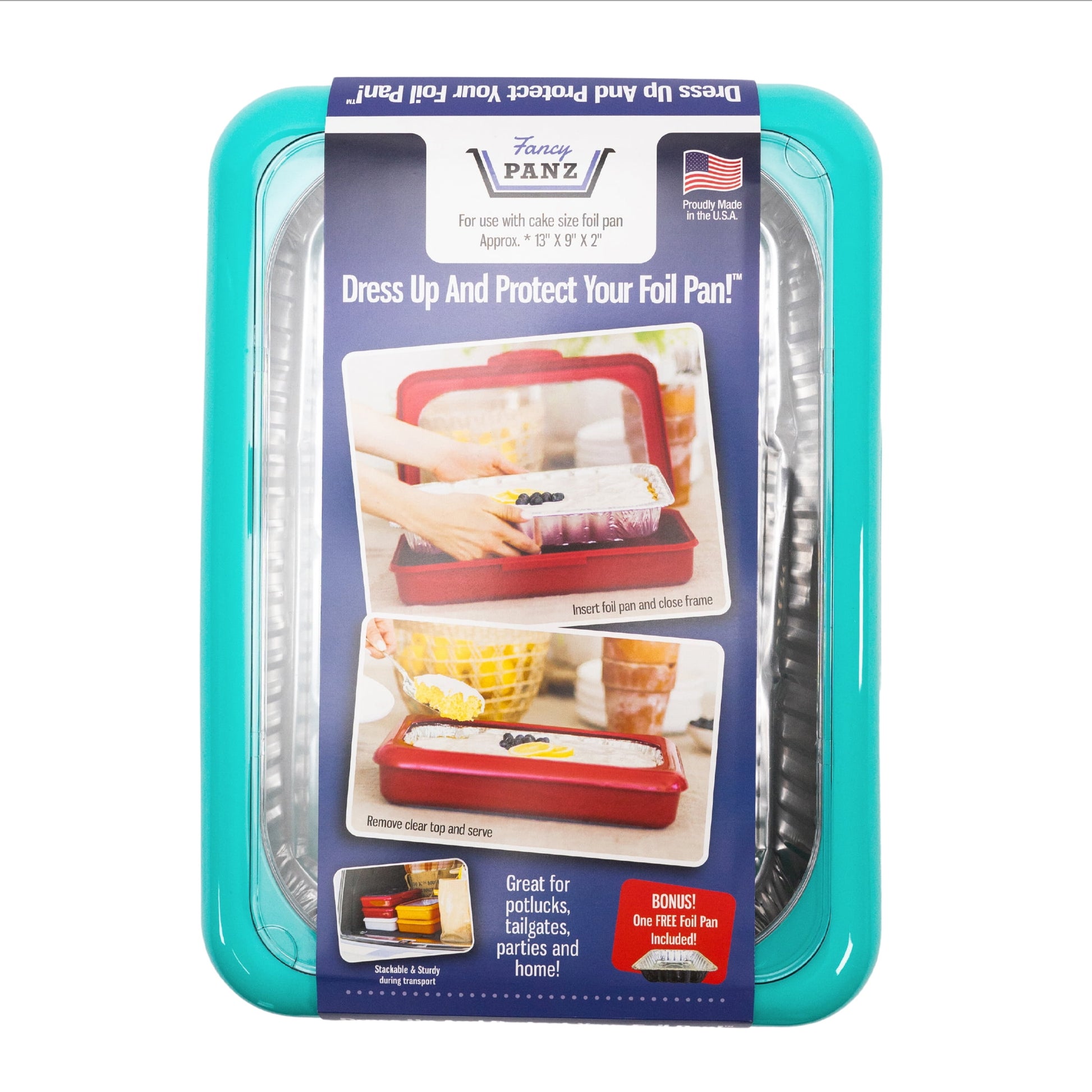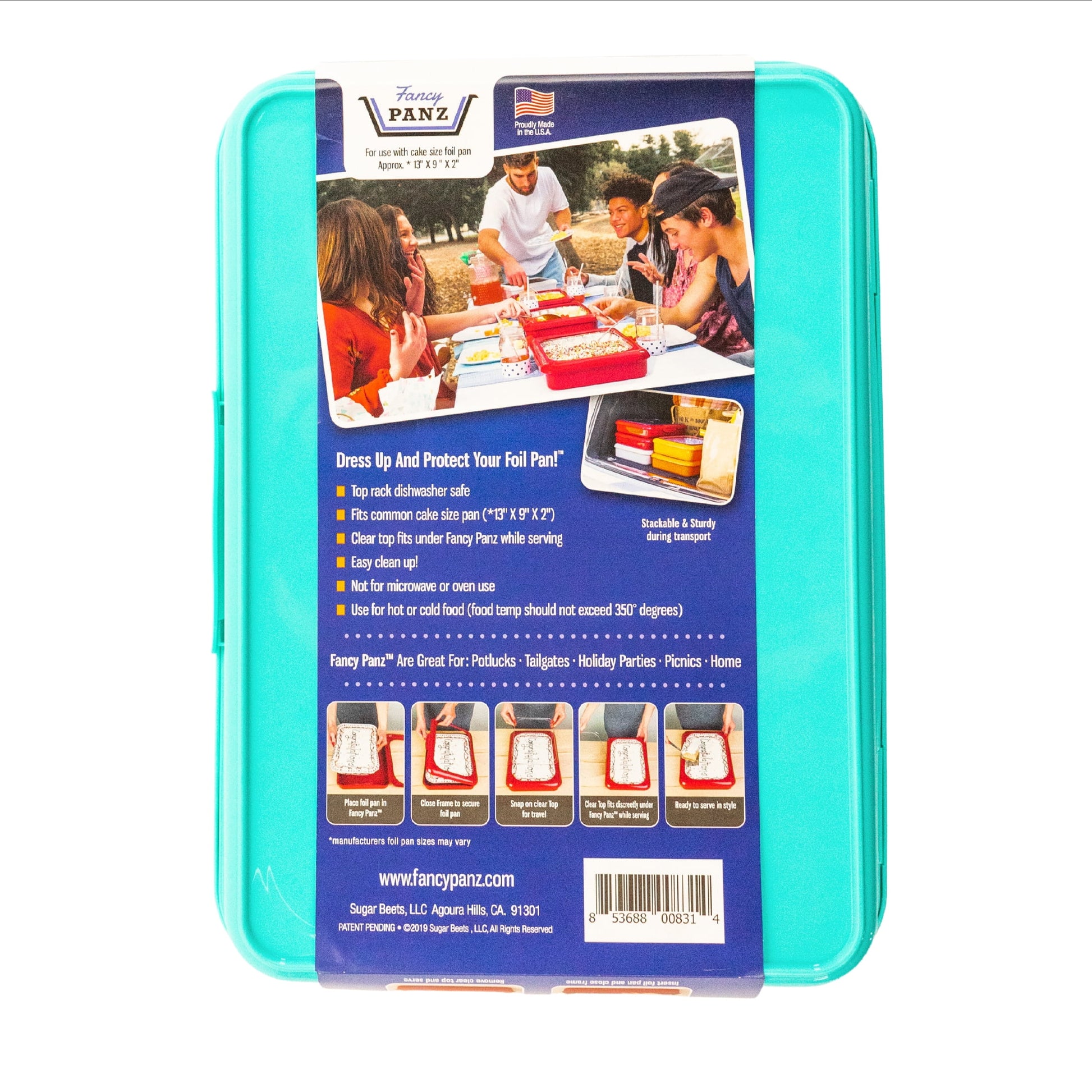 Proudly Designed by two sisters, Fancy Panz is an innovative solution to a common problem. Fancy Panz are the perfect solution for dressing up, transporting & serving from foil pans. We all love the convenience of foil pans, but when it comes to serving or transporting food in them, they can often be too flimsy & not so pretty! By retaining all of the conveniences of a foil pan and providing the look of your favorite serving dish, Fancy Panz is the all in one solution! Dress up that foil pan by lifting the attached frame and placing it inside your Fancy Panz, close the frame, snap on the clear lid, and you are ready to transport your casseroles, desserts, salads, anything- hot or cold! There are two different ways to serve from your Fancy Panz, remove the clear top and place it under your Fancy Panz where it acts as a trivet OR for times when critters may be present or weather is a factor, keep the clear top on and lift from the tab. That way, your food remains completely covered between servings and food temperature is maintained for longer. When your ready to leave the event, remove the foil pan and take your Fancy Panz back with you. Clean up in a breeze, wipe down your Fancy Panz with a damp cloth. Fancy Panz are also top rack dishwasher safe! Fancy Panz accommodates the common “cake size” foil pan measuring approximately 13x9x2.