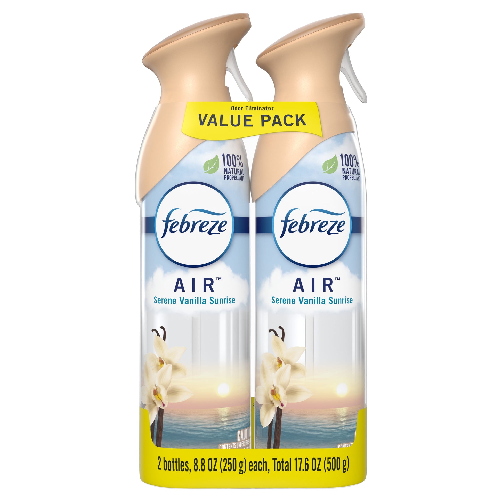 Odors. They're everywhere... lingering in the air or arising at the most awkward times. Forget masking them with some froo-froo spray; Febreze Air Effects actually fights air odors. This can of ahhh-some straight up fights stink with a neat little molecule called cyclodextrin (Bonus: It's naturally made from corn). It's a handy air freshener that's easy to use: Simply spray in a sweeping motion and fight those bad smells anywhere... the bathroom, the kitchen, that cabin you rented for the weekend, the shoe closet, your kid's room... anytime you want an instant burst of fresh. Bathe your senses with Serene Vanilla Sunrise's sweet and soothing blend of vanilla and warm sugar. And because Febreze AIR uses 100% natural propellants, you can confidently freshen your home every day. Looking for even more ways to breathe happy with Febreze? Take the freshness on the road with CAR Vent Clips.