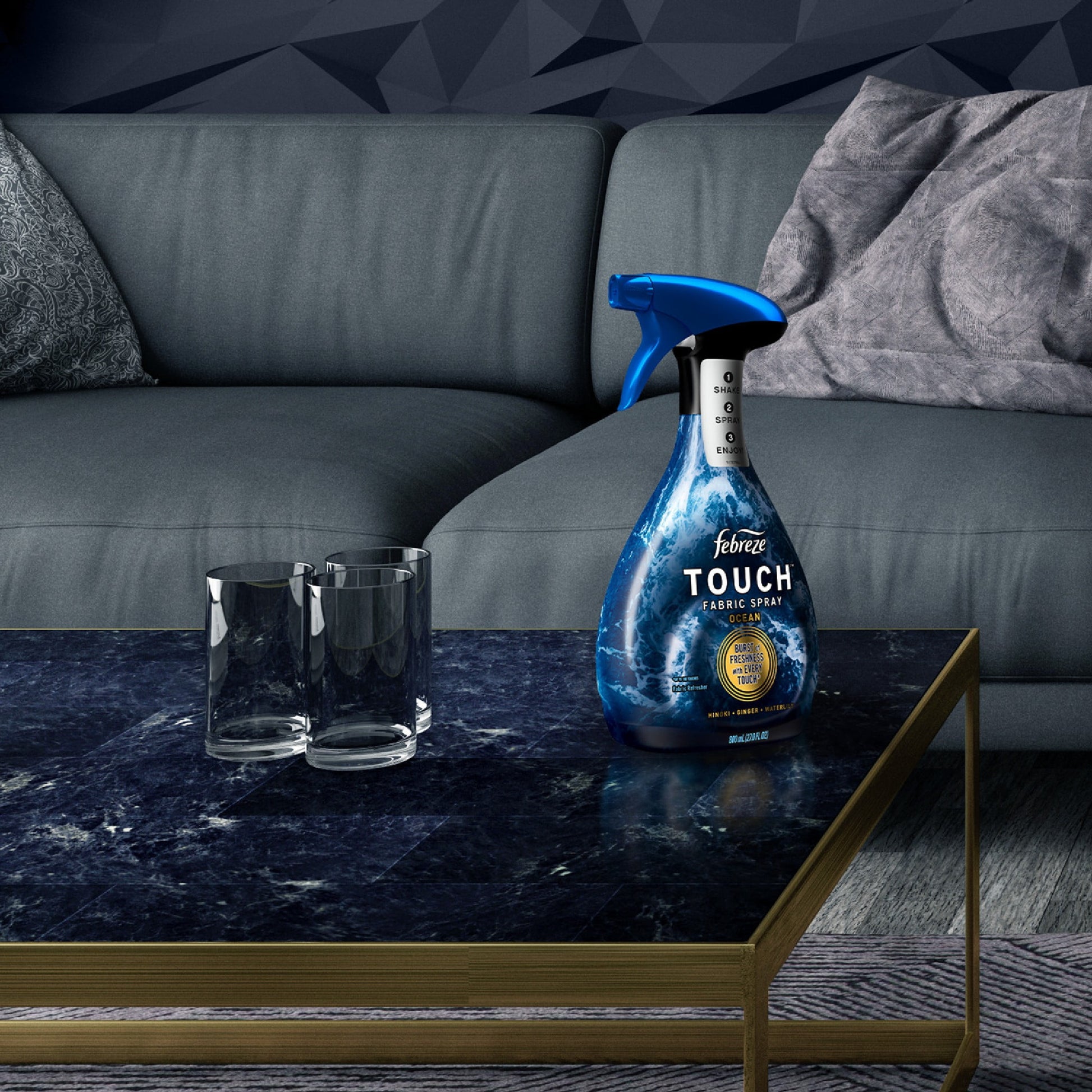 Get your hands on a new kind of scent experience: Febreze Touch Fabric Spray uses breakthrough touch-activated scent technology to store luxe scents right in your fabrics, giving you a burst of elevated freshness with every step, pat, and fluff. It's home fragrance unlike any other. The scent activates with every touch: whether you're walking on carpets, wrapping yourself with your favorite blankets, or simply lounging on the furniture. Make a statement with the carefully crafted scent of waterlily, ginger, and hinoki in mesmerizing Febreze Ocean. The long-lasting luxurious freshness continuously lingers... we dare you to resist sniffing every fabric. With Febreze Touch Fabric Refresher, you can transform your home into a luxurious, touchable scent sanctuary. ​ Ocean Scent, 16.9 fl oz