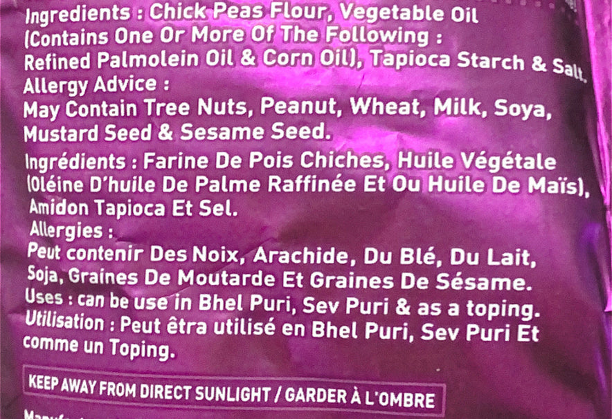 These crunchy strings are made from gram flour (chick pea flour) and salt. They are used in a variety of Indian snack foods.