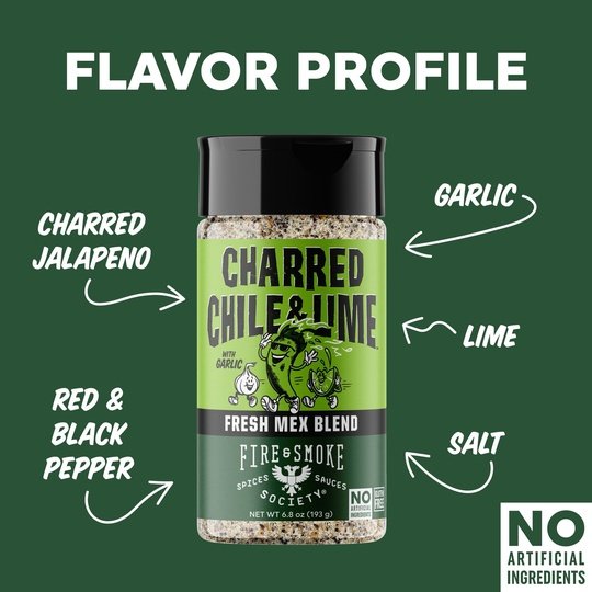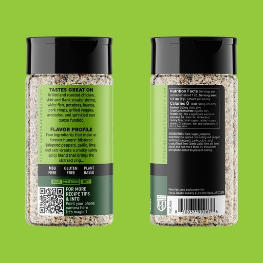 Get ready to elevate your Mexican cuisine game with our Charred Chile & Lime meat seasoning blend. This smoky, tangy, season salt blend will fire up your taste buds with its sizzling and zesty flavor. Whether you're making tacos, vegetable bowls, salsa, or queso dip, Charred Chile & Lime has got you covered. Our Mexican blend seasoning salt is made from four ingredients that make us forever hungry–blistered jalapeno peppers, garlic, lime, and salt–create a smoky, subtly spicy blend that brings the charred zing. And the best part? Mexican spices and seasonings are versatile and taste great on a variety of dishes, from classic tacos to flank steak, to chicken rub, chicken seasoning, white fish, huevos, and pork chops. It's the perfect grill seasoning to take your Mexican cuisine to the next level.