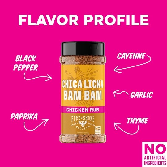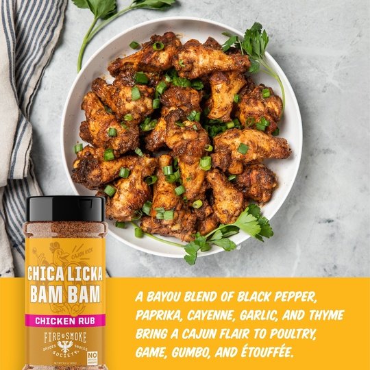 Be the king of your next barbecue with Fire And Smoke Society Chica Licka Bam Bam bbq seasoning. Fire And Smoke Society Chica Licka Bam Bam is a Louisiana-inspired poultry seasoning that brings a bayou flair to grilled poultry, game, gumbo, and étouffée. It works wonders on whole birds, chicken thighs, legs, and wings, smoked turkey seasoning, quail, guinea hen, even dove. Whether you're grilling up a feast of chicken wings organic, roasted chicken, whole turkey, or even chicken burgers, Chica Licka Bam Bam is your ideal chicken seasoning. Our spice blend isn't just for grilling; it's a versatile addition to your kitchen, perfect for chicken fried, chicken marinade, and enhancing the flavors of chicken burgers or meat seasoning. Packed with poultry herbs, it's your go-to for creating mouthwatering dishes, and it's equally fantastic as a turkey rub. Fire And Smoke Society Chica Licka Bam Bam is the ultimate choice for those looking for BBQ rubs for smoking that elevate their culinary creations with an irresistible taste of the bayou.