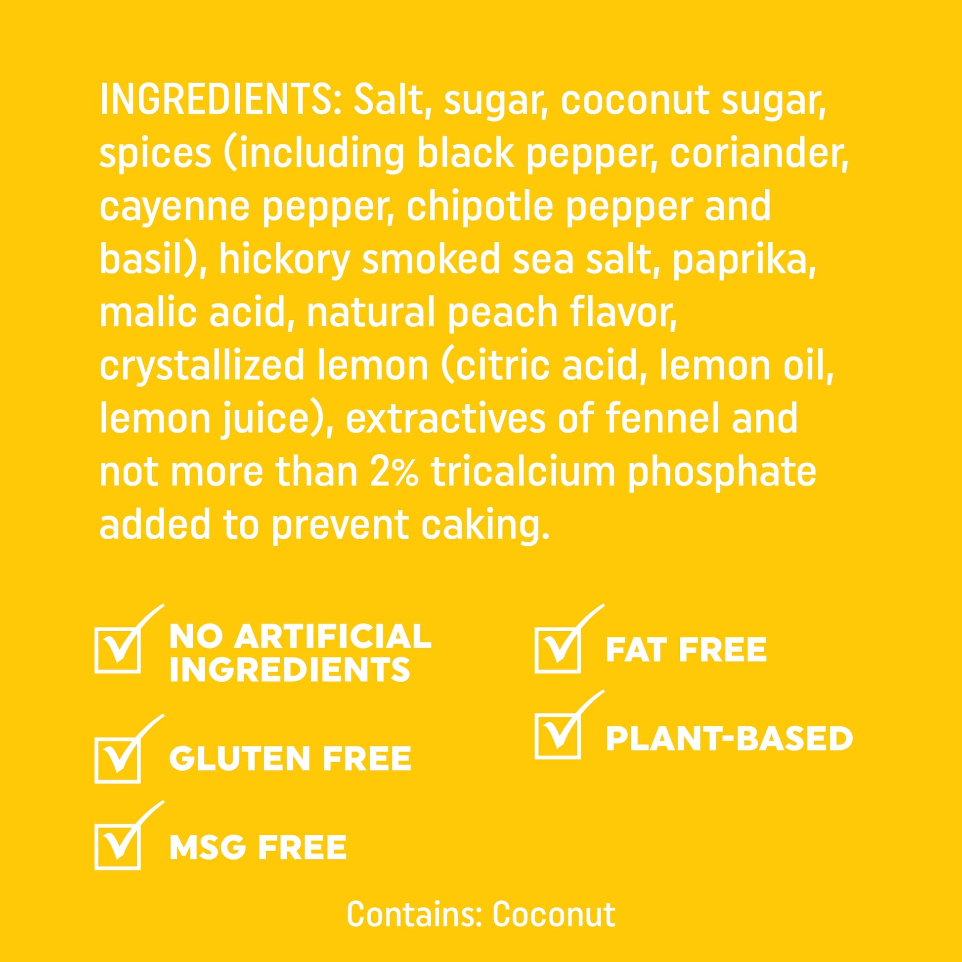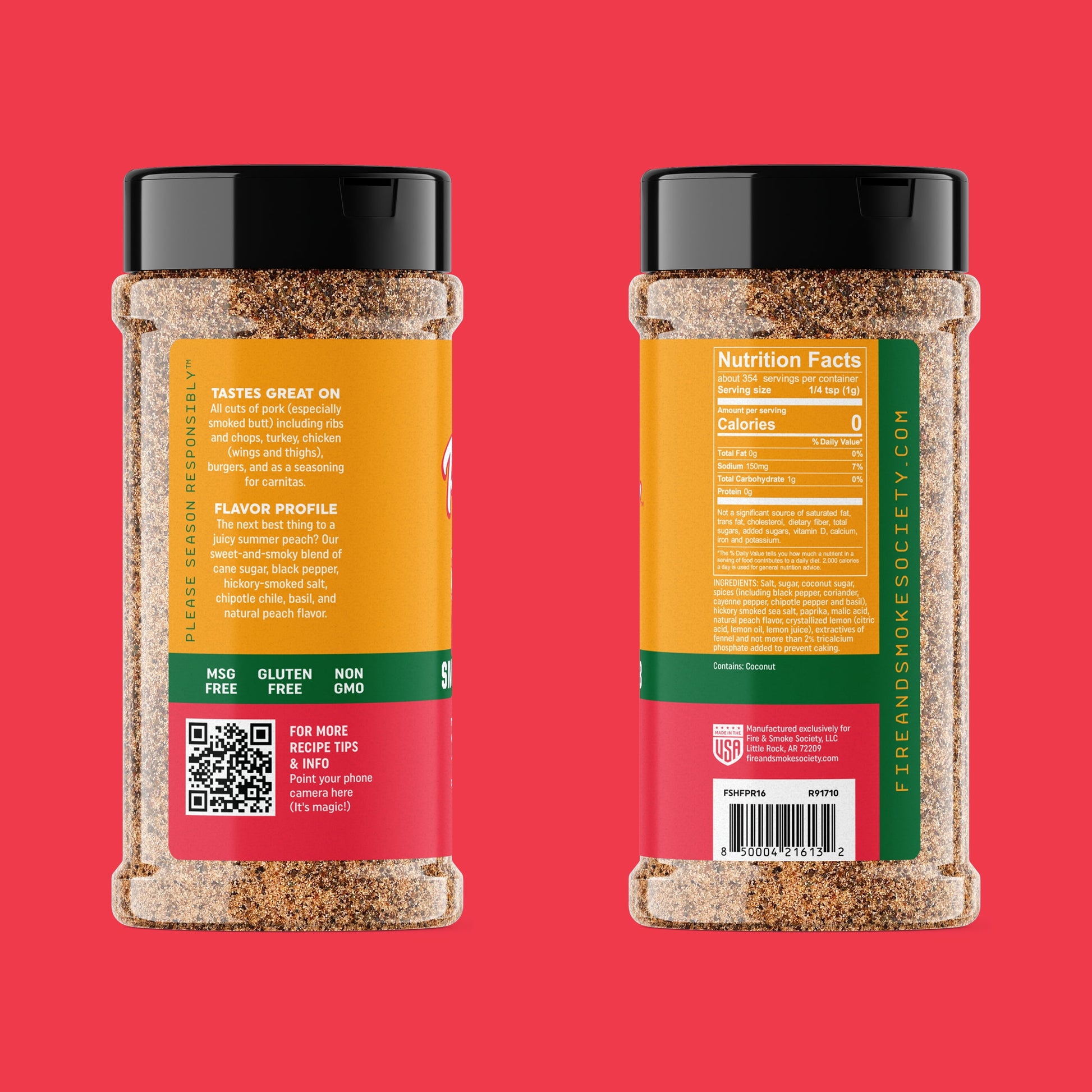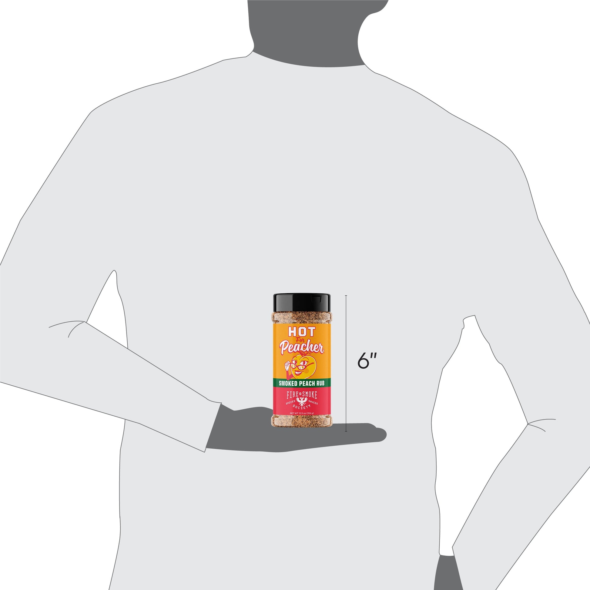 Hot for Peacher is a sweet-and-smoky blend of cane sugar, black pepper, hickory-smoked salt, chipotle chiles, and natural peach flavor. Use it as a rib rub, pork seasoning, chicken seasoning on pork, whole chicken, turkey or even as a burger seasoning. No Artificial Ingredients, Gluten Free, MSG Free, Fat Free, Non GMO. Â