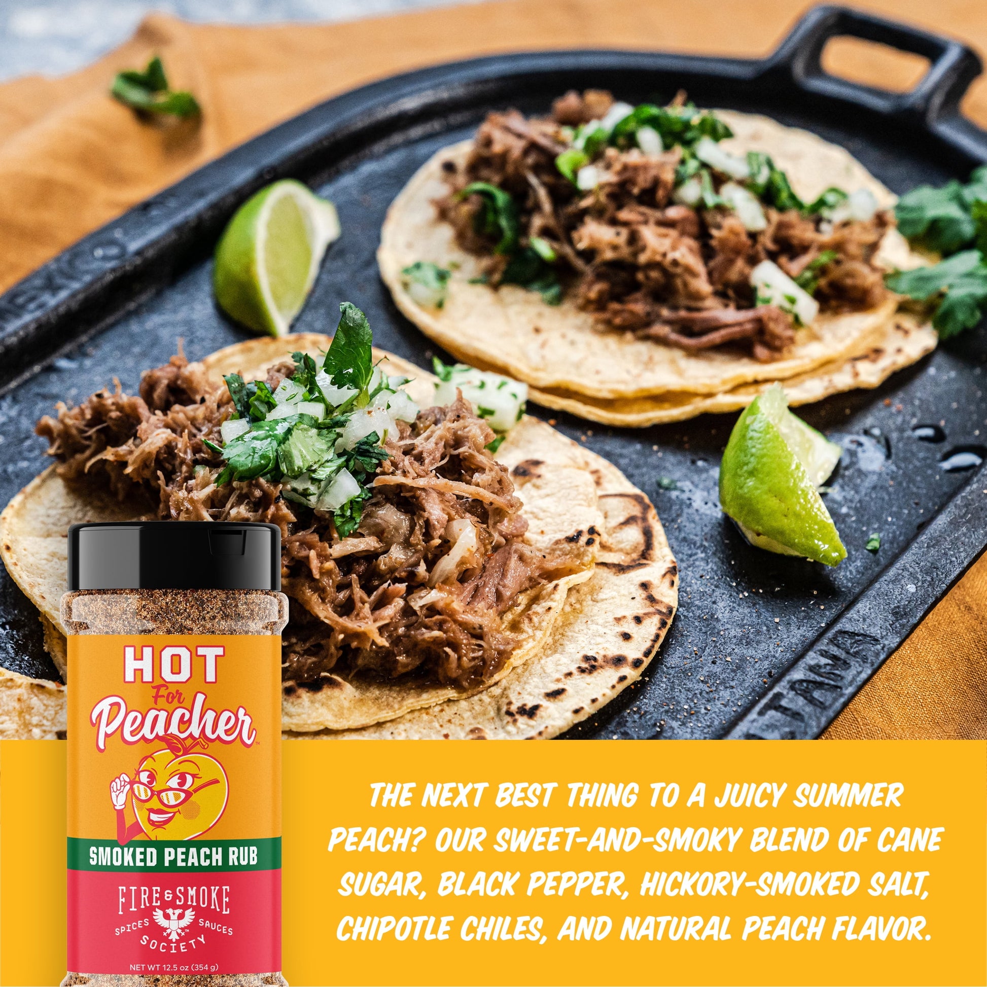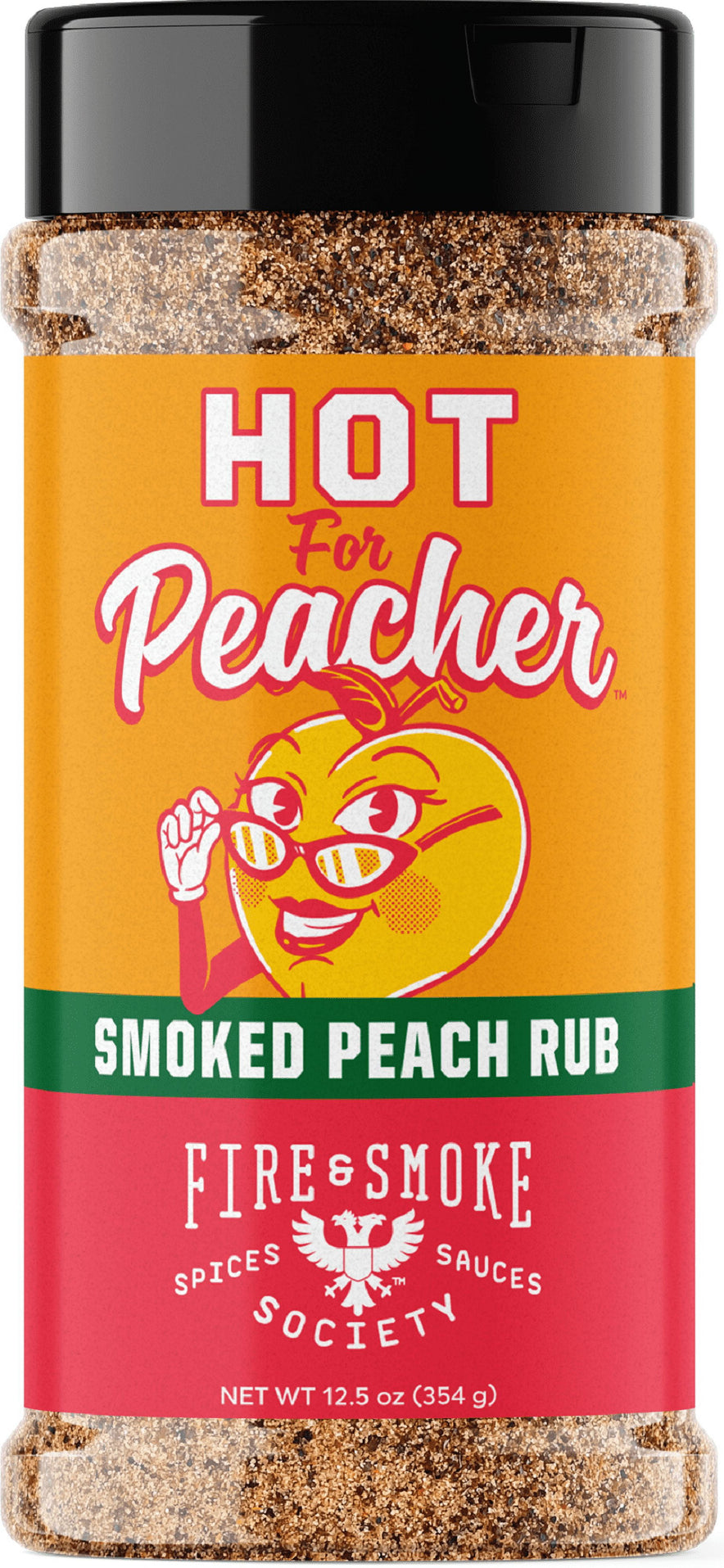 The next best thing to a juicy summer peach? The Hot for Peacher Smoked Peach Rub combines a sweet summer fruit, smoke, and barbecue seasoning for a knockout pork shoulder rub, pork butt rub and dry rub seasoning. Â