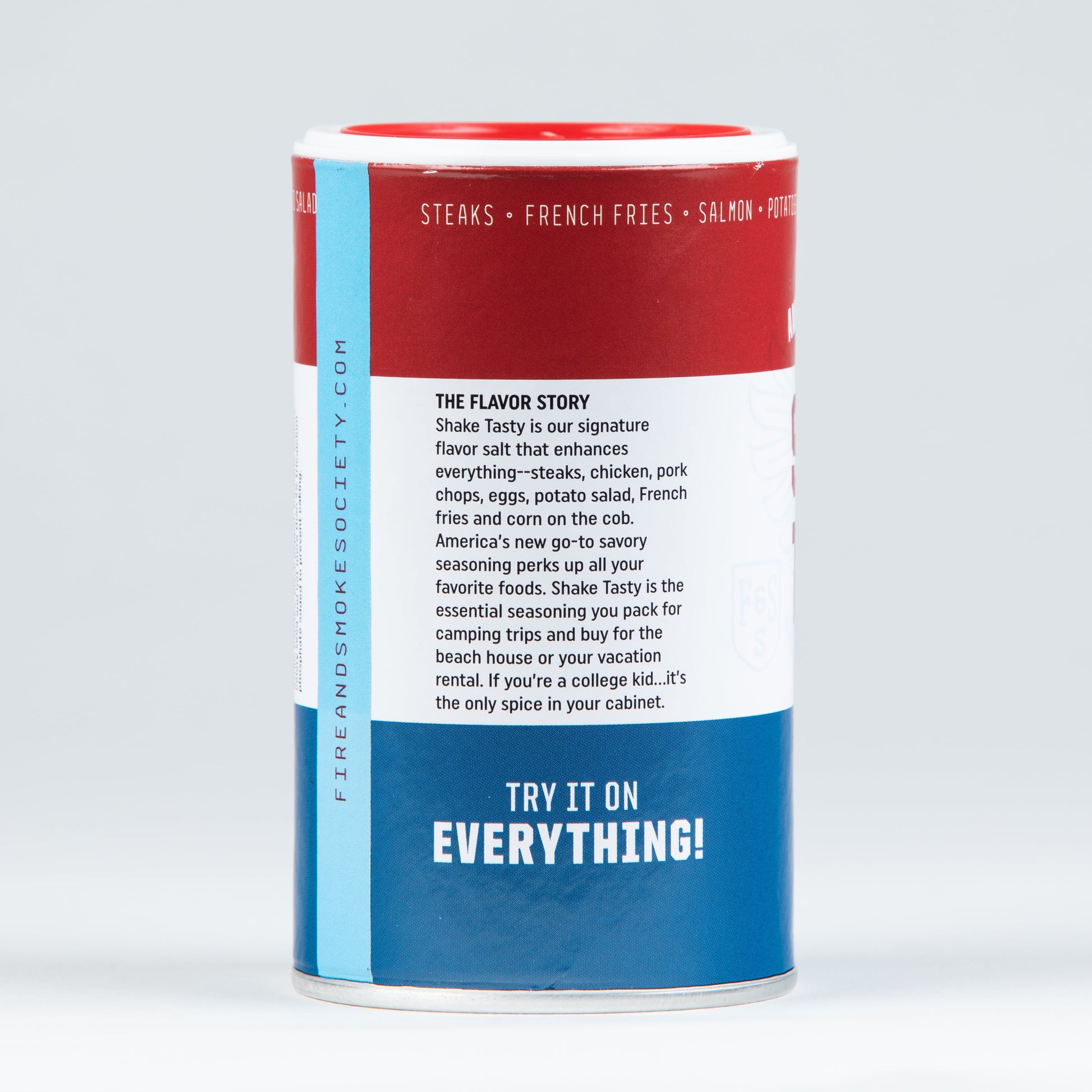 Our Shake Tasty seasoning blend is our signature flavor salt that enhances everything--steaks, chicken, pork chops, eggs, potato salad, French fries and corn on the cob. Use it as a steak seasoning, or on burgers, chicken, eggs, as a vegetable seasoning, garlic bread, potato salad and even as a popcorn seasoning.