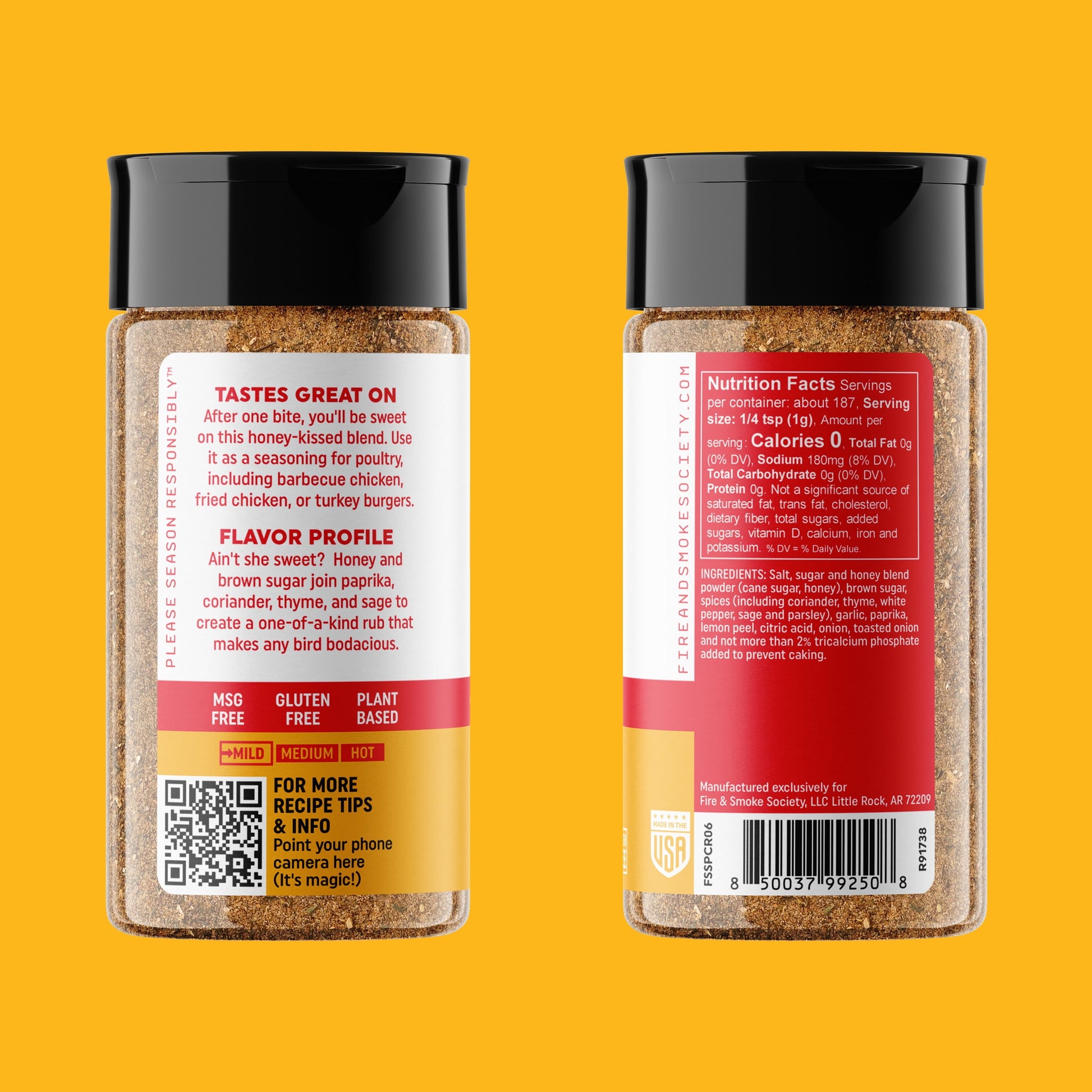 Be the king of your next barbecue with Fire And Smoke Society Sweet Peeper poultry seasoning salt. Our perfect chicken salt is a one-of-a-kind rub that makes any bird bodacious. It works wonders on whole birds, chicken thighs, legs, and wings, smoked turkey, quail, guinea hen, even dove. Whether you're grilling up a feast of chicken wings organic, roasted chicken, whole turkey, or even chicken burgers, Sweet Peeper is your ideal seasoning mix. Our spice blend isn't just for grilling; it's a versatile addition to your kitchen, perfect for chicken fried, chicken marinade, and enhancing the flavors of chicken burgers or meat seasoning blend. Packed with poultry herbs, it's your go-to for creating mouthwatering dishes, and it's equally fantastic for seasoning turkey legs. Sweet Peeper is the ultimate choice for those looking for Barbecue rubs for smoking that elevate their culinary creations with an irresistible taste.