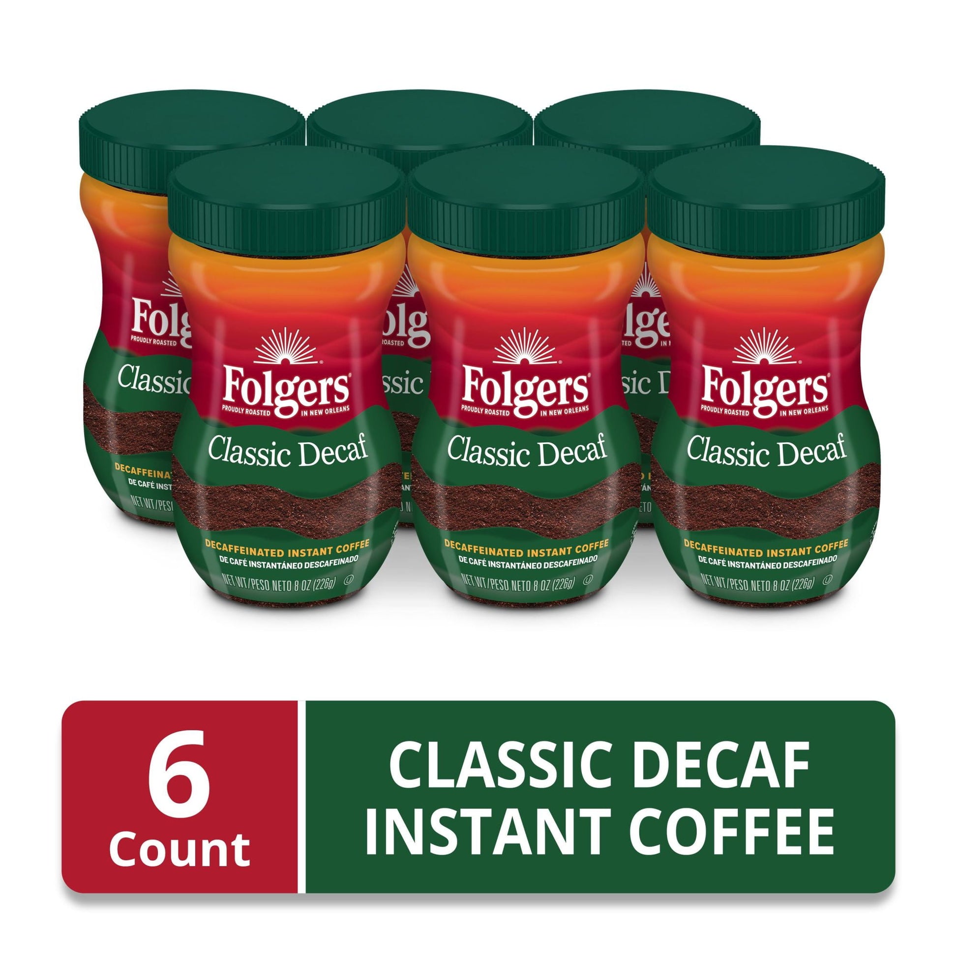 Get the classic taste you love without all the caffeine and without the waiting. Folgers Classic Decaf Instant Coffee delivers delicious taste in a quick and convenient form thats 99.7 percent caffeine free. Making a cup is easy: just add one (1) rounded teaspoon of instant coffee to six (6) fluid ounces of water or milk, stir it up and adjust to your taste preference. Try it in a decaffeinated version of a mocha latte or a hot take on dalgona coffee or just mix it up and get out the door. No matter how your prep it, our decaf instant coffee does the trick, quick. Add a jar to your coffee station today.