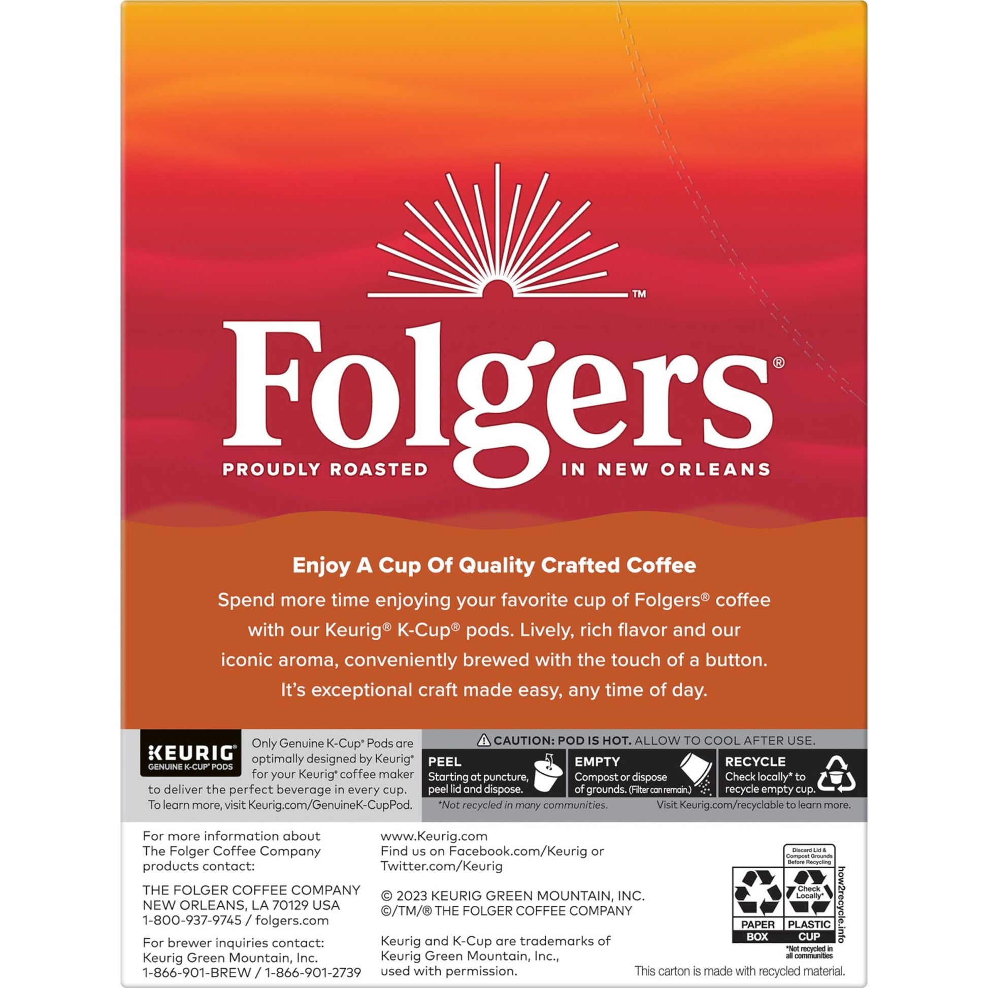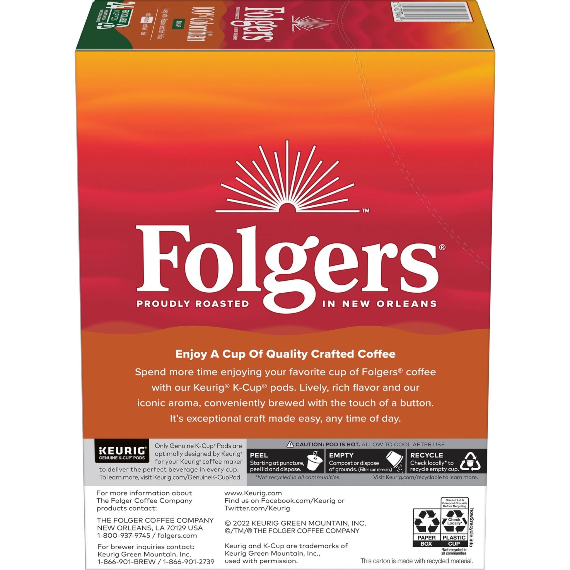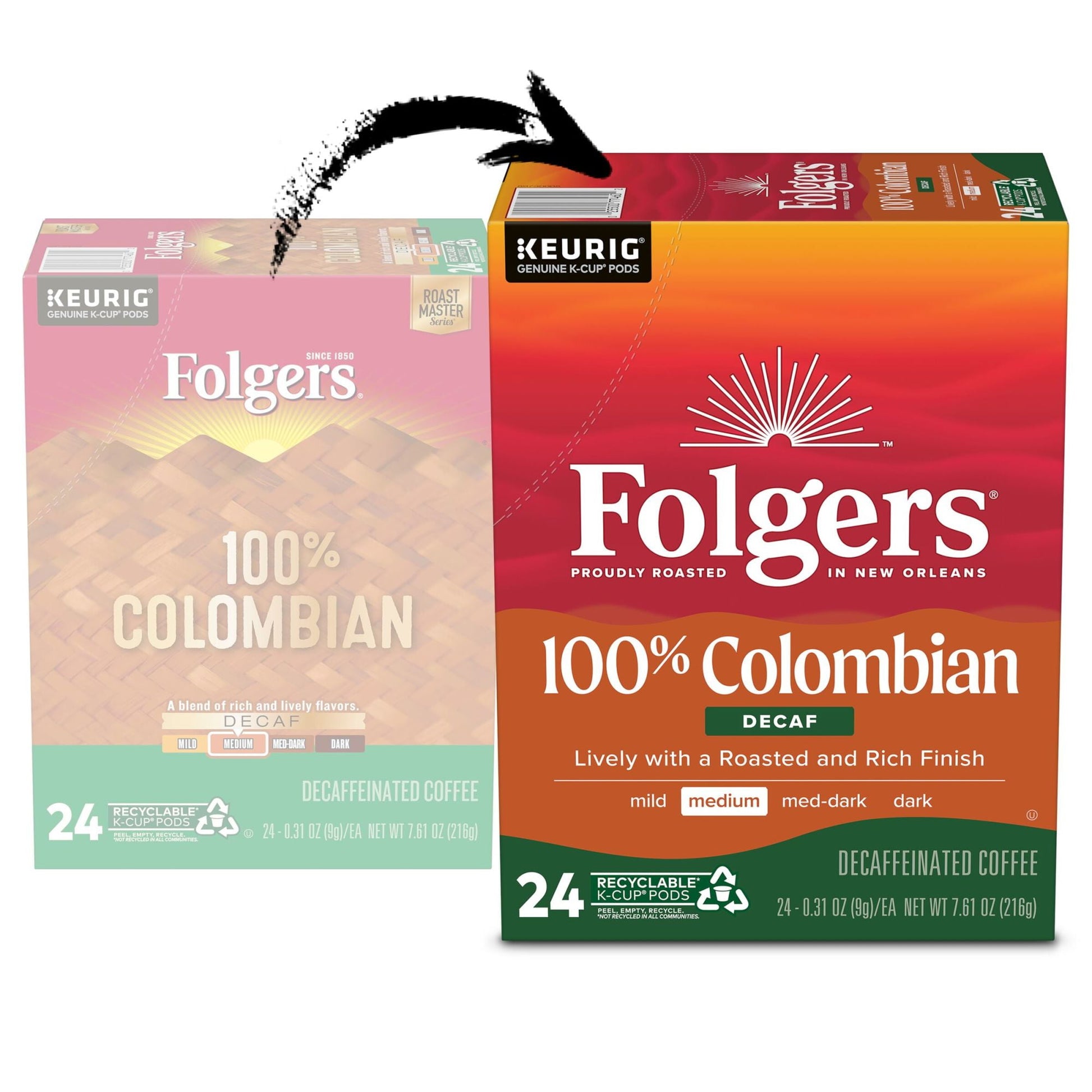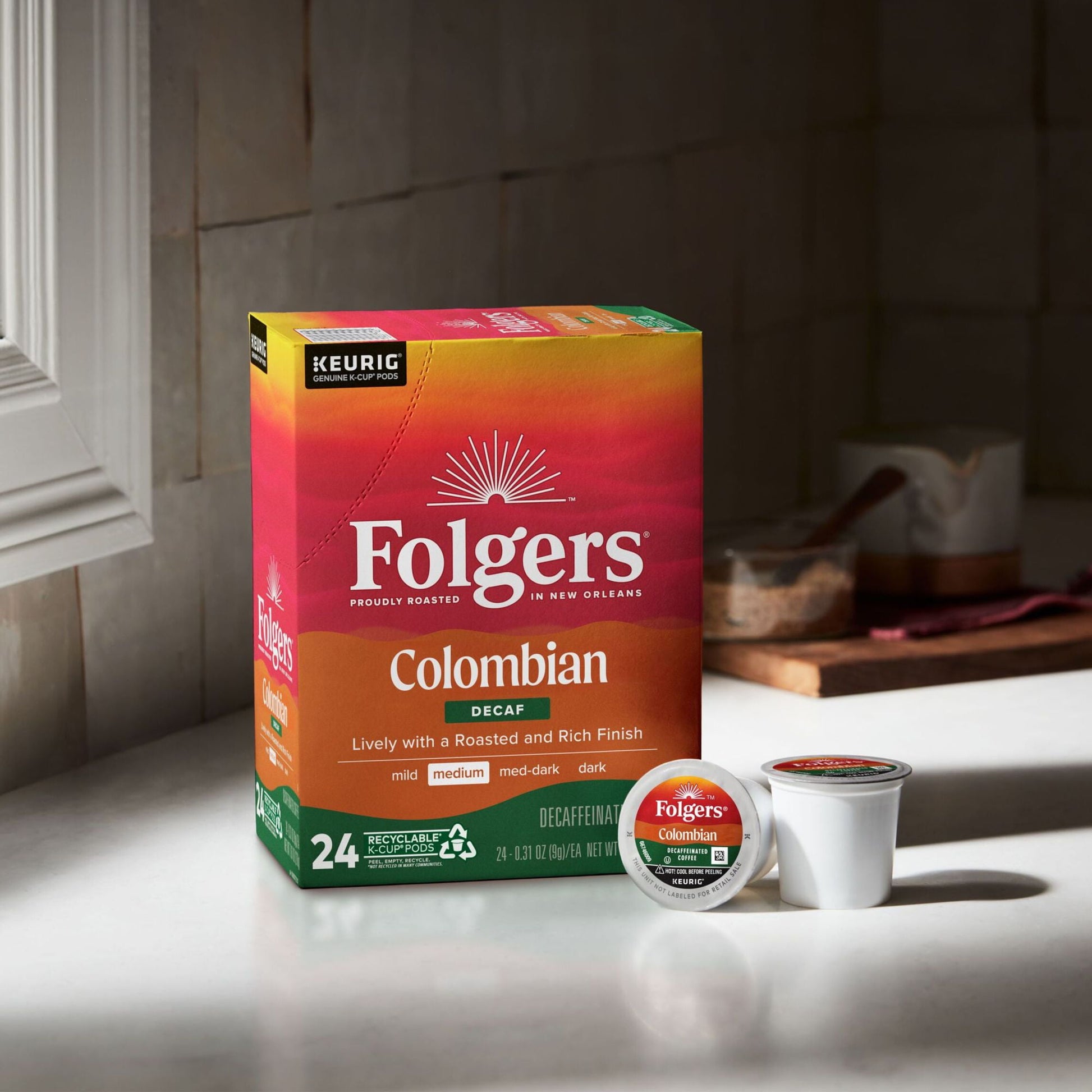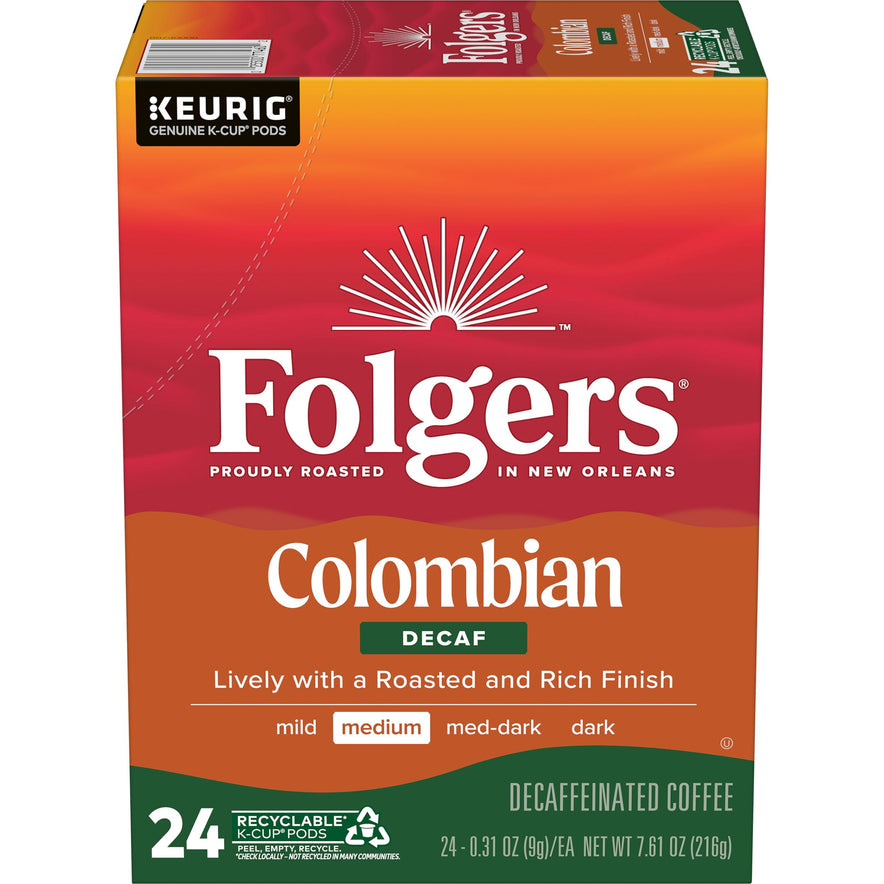 Contains one (1) twenty-four (24) count box of Folgers Columbian Decaffeinated Coffee Keurig K-Cup Brewers