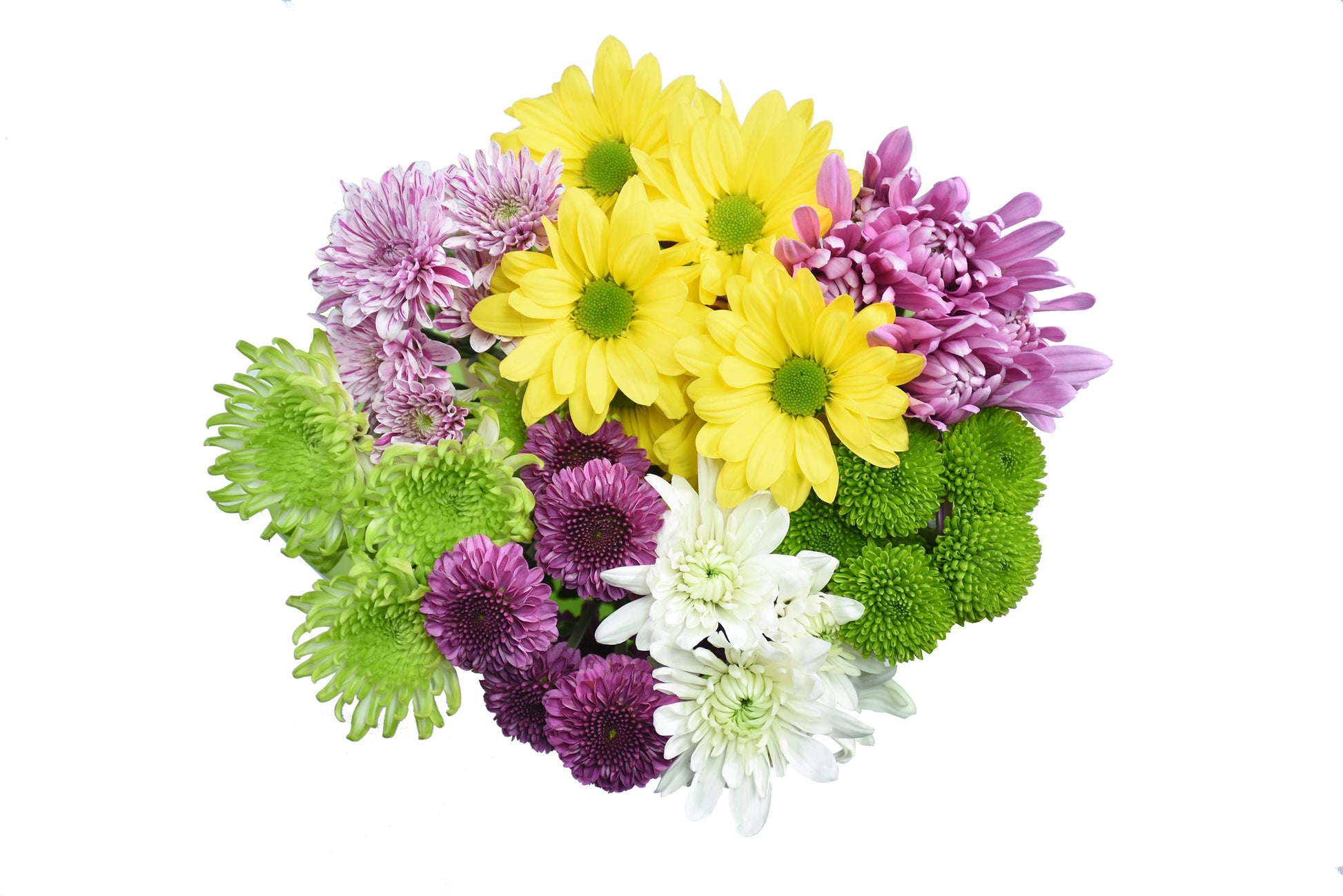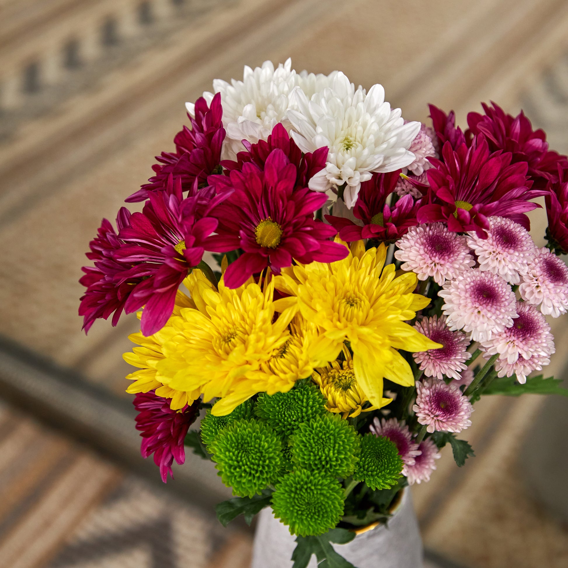 The Fresh-Cut Small Rainbow Poms Flower Bunch will refresh any space you put it in. This stunning bunch features a minimum of three different varieties of gorgeous fresh-cut flowers that are updated seasonally. No vase is included, so you can choose exactly how you want to display it. Gift this gorgeous little flower bunch to show affection, love, or friendship to anyone in your life. Or keep for yourself and place in your home, office, or any space to brighten the decor. Mother nature produces each flower differently; variations in looks are possible. Flowers upon purchase may not appear as full as the images pictured. Please allow at least 24 hours for your fresh-cut flowers to hydrate and open from bud to bloom. Refresh your home decor with the help of the Fresh-Cut Small Rainbow Poms Flower Bunch.